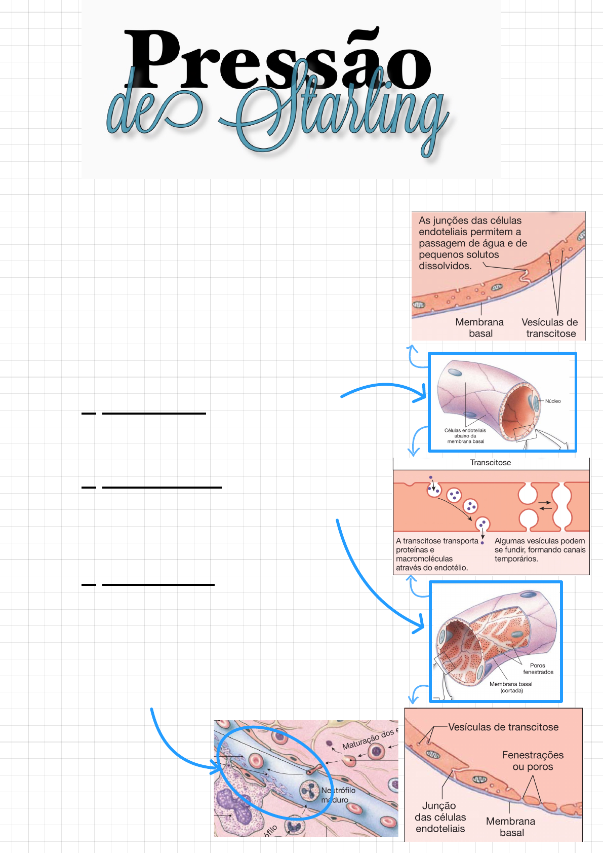 Troca nos capilares → Quando o sangue alcança os capilares, o plasma e as células trocam materiais pelas finas paredes dos capilares - O capilar tem a parede mais fina de todos os vasos → uma camada de células endoteliais sustentadas pela lâmina basal - Os tipos de junções determinam a permeabilidade do capilar • Capilares contínuos: são os mais comuns; as células são unidas por junções de vazamento • Capilares fenestrados: têm grandes poros; permitem a passagem de grandes volumes de fluido entre o plasma e o líquido intersticial • Capilares sinusóides: estão presentes apenas na medula óssea, no fígado e no baço; são até 5 vezes mais largos e têm fenestrações e espaços entre as células; permitem a passagem de células sanguíneas e proteínas plasmáticas 1 V 1 V Velocidade do fluxo nos capilares → A taxa de fluxo nos capilares tem um papel importante na eficácia das trocas - Taxa de fluxo constante → a velocidade é maior em tubos com menor diâmetro- - Porém, a velocidade do fluxo nos capilares é menor → isso o corre pois os capilares são numerosos, e a soma dos das áreas de todos (área de secção transversal total) é maior que a soma de todas as veias e artérias As trocas ocorre principalmente por difusão e transcitose → Troca entre o plasma e o líquido intersticial - Via paracelular = movimento entre células endoteliais - Transporte endotelial = movimento através das células - Difusão = movimento de pequenos solutos dissolvidos e gases entre ou através das células - Transporte vesicular = movimento de solutos maiores e proteínas → Taxa de difusão - É determinada pelo gradiente de concentração entre o plasma e o líquido intersticial - Oxigênio, dióxido de carbono e e a maioria dos pequenos solutos difundem-se livremente → as concentrações alcançam o equilíbrio a medida que o sangue alcança a extremidade venosa do capilar - Nos capilares contínuos as células sanguíneas e a maioria das proteínas são incapazes de atravessa-los → algumas moléculas maiores são transportadas por transcitose Fluxo de massa → É outra maneira dos capilares realizarem trocas - Refere-se ao movimento de massa do líquido como resultado dos gradientes de pressão hidrostática ou osmótico - Absorção: fluxo de massa está indo para dentro dos capilares - Filtração: fluxo de massa está indo para fora dos capilares; causado pela pressão hidrostática que força a saída do líquido pelas junções → A maioria dos capilares apresenta filtração na extremidade arterial e absorção na extremidade venosa. - → Duas forças regulam o fluxo de massa nos capilares - Pressão hidrostática: é o componente da pressão do fluxo que empurra o líquido para fora dos capilares - Pressão osmótica: é determinada pela concentração de solutos em um compartimento • Há proteínas que estão presentes no plasma mas estão ausente no líquido intersticial - Isto cria uma pressão osmótica que é chamada de pressão coloidosmótica ou oncótica A pressão coloidosmótica NÃO equivale à pressão osmótico total no capilar, ela só mede a pressão criada pela diferença de concentração de algumas proteínas • A pressão coloidosmótica é maior no plasma do que no líquido intersticial → favorece o movimento da água do interstício para o plasma • A pressão hidrostática porém diminui ao longo do capilar = energia perdida por atrito → a água devido a essa pressão move- se para fora do capilar com o gradiente diminuindo da extremidade arterial para a venosa • Assumindo que as pressões hidrostática e coloidosmótica no interstício são iguais a 0, então a pressão resultante será: Pressão hidrostática Pressão coloidosmótica - Presult > 0 = filtração → extremidade arterial - Presult < 0 = absorção → extremidade venosa - Se no meio do capilar filtração = absorção não haveria movimento → a filtração geralmente é maior que a absorção Sistema linfático → Funções - Restituir os líquidos e as proteínas filtradas pelos capilares de volta ao sistema circulatório - Capturar a gordura absorvida pelo intestino e transferir para o sistema circulatório - Atua como filtro para ajudar a capturar e destruir patógenos → Transporte de líquidos - O S. Linfático movimenta em uma só direção o líquido intersticial dos tecidos para a circulação - Os “capilares linfáticos” se situam perto dos outros capilares (exceto os do rim e do sistema nervoso central) → são ainda mais finos 1 • Possuem lacunas entre as células que permitem a entrada de matérias que serão arrastados pelos vasos linfáticos • O fluxo de massa dentro dos linfáticos é chamado de linfa → Vasos linfáticos - Vários pequenos vasos se juntam para formar vasos maiores - Possuem válvulas semelhantes as valvas das veias - Os grandes ductos desembocam na circulação venosa abaixo da clavícula → em intervalos eles penetram nos linfonodos - nódulos com células imunes ativas - Não possui uma bomba como o coração → dependem das ondas geradas pela contração dos músculos liso e estriado esquelético Edemas → É resultado trocas anormais entre o sistema circulatório e o linfático → Causas - Drenagem inadequada da linfa • Ocorre principalmente por obstrução do sistema linfáticos, especialmente os linfonodos → elefantíase • Também pode ocorre pela remoção dos linfonodos no tratamento do câncer - Rompimento do balanço normal entre a filtração e a absorção • Pode ocorrer pelo aumento da pressão hidrostática nos capilares → elevada pressão venosa -* insuficiência cardíaca: um dos ventrículos não está funcionando bem • Também ocorre com a diminuição na concentração de proteínas plasmáticas → desnutrição severa ou insuficiência hepática (fígado sintetiza proteínas plasmáticas ) • E outra causa é o aumento de proteínas intersticiais → inflamações s