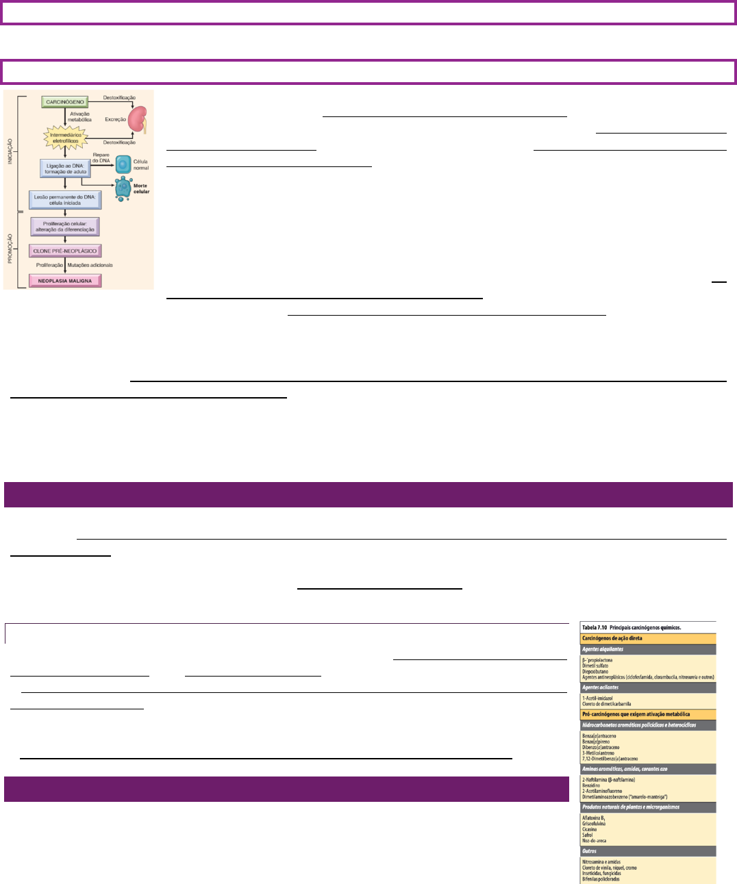 Daniella Machado TURMA XXVI TUTORIA IV: PROLIFERAÇÃO CELULAR “O PÓ FICAVA NO AR” - MÓDULO 3 1. CLASSIFICAR OS AGENTES CARCINOGÊNICOS Agentes: químicos, biológicos ou físicos. Endógenos e exógenos. 2. DESCREVER OS MECANISMOS DE AÇÃO DOS AGENTES CARCINOGÊNICOS QUÍMICOS A iniciação resulta da exposição das células a uma dose suficiente de um agente carcinogênico. Provoca dano permanente ao DNA (mutações). Os promotores podem induzir o aparecimento de tumores a partir das células iniciadas, porém eles não são tumorigênicos por si só. A aplicação de promotores leva à proliferação e expansão clonal de células iniciadas (mutadas). Impulsionados a proliferar, os subclones das células iniciadas sofrem várias mutações adicionais, e, por fim, surge um clone cancerígeno com todas as características e marcas registradas do câncer. É provável que muitos fatores que contribuem para a oncogênese nos seres humanos também atuem ao estimular a proliferação, podendo, assim, ser considerados de modo conceitual como promotores de tumores; os exemplos incluem a estimulação estrogênica (sem regulação) do endométrio e da mama e os processos inflamatórios crônicos associados ao reparo dos tecidos (doença inflamatória intestinal, hepatite crônica e esôfago de Barrett). Todos os carcinógenos químicos iniciadores são eletrófilos (átomos com deficiência de elétrons) altamente reativos, que podem reagir com átomos nucleofílicos (ricos em elétrons) na célula. Tem como alvo o DNA, RNA e as proteínas, causando morte celular. A iniciação provoca dano não letal ao DNA, cujo reparo é feito em um processo sujeito a erros. A célula mutada transfere as lesões do DNA às células-filhas. Associação do câncer do escroto em limpadores de chaminés à fuligem que se depositava sobre a pele. Pela facilidade de manipulação e de observação, a pele é um setor do organismo muito estudado do ponto de vista da oncogênese química experimental. O fígado é também frequentemente explorado. Substâncias químicas segura ou presumivelmente cancerígenas encontram-se amplamente distribuídas na natureza e compreendem desde alimentos naturais até compostos altamente modificados. Algumas são muito 1potentes; 2em contato muito próximo e prolongado com humanos e outros animais. São divididos em duas grandes categorias: (1) carcinógenos diretos; (2) carcinógenos indiretos. AÇÃO DIRETA Não exigem sua conversão metabólica para se tornarem carcinogênicos (atividade eletrofílica intrínseca). A maioria consiste em carcinógenos fracos, porém alguns são importantes por serem agentes quimioterápicos contra o câncer (agentes alquilantes e acilantes). Em alguns casos, esses agentes já curaram, controlaram ou adiaram a recorrência de certos tipos de câncer (leucemia, linfoma e carcinoma de mama) apenas para produzir uma segunda forma de câncer, normalmente leucemia mieloide aguda. O risco de câncer induzido é baixo, porém sua existência exige o uso criterioso desses agentes. ALQUILANTES Trata-se de substâncias que têm a propriedade de doar um grupo alquil (metil ou etil) a um substrato. São carcinógenos diretos, de baixa potência. Agentes alquilantes interagem com o DNA e são usados no tratamento do câncer e como imunossupressores. As substâncias mais conhecidas são ciclofosfamida, clorambucila e bussulfan. Pacientes cancerosos em tratamento com esses fármacos têm risco aumentado de desenvolver outros tumores, principalmente linfomas e leucemias. Agentes alquilantes causam mutações puntiformes no códon 12 do gene RAS. AÇÃO INDIRETA É necessário modificações químicas no organismo antes de se tornarem eletrofílicas e ativas (principalmente por meio das enzimas do citocromo P-450). A atividade dessas enzimas sofre influência de numerosos fatores endógenos (genes polimórficos) e exógenos. O fenobarbital é indutor do sistema enzimático P-450 (mono- “O pó ficava no ar” – Módulo 3 Daniella Machado Tutoria – 4º período UniEVANGÉLICA TURMA XXVI 2 oxigenases), de modo que sua administração pode aumentar a formação de tumores por carcinógenos indiretos. Nesse sentido, fumantes que possuem esse sistema enzimático mais ativo têm maior risco de desenvolver carcinoma pulmonar (análise do risco de cancer por meio da analise genética dos polimorfismos enzimático). Por outro lado, modificações bioquímicas podem resultar também em inativação do carcinógeno. Os carcinógenos químicos atuam sobre o DNA e causam mutações, cujos genes mais afetados são RAS e TP53. O principal mecanismo de ação dos carcinógenos químicos é a formação de compostos covalentes com o DNA (adutos de DNA), que aumento da probabilidade de ocorrer erros na replicação. Tecidos fetais têm duas a cinco vezes menos potencial de reparo do que tecidos adultos. Alguns carcinógenos químicos (certos aldeídos, agentes alquilantes), além de sua ação mutagênica, podem inibir a atividade de enzimas reparadoras. Os produtos carcinogênicos são os carcinógenos finais. Como a transformação maligna resulta de mutações, não é surpreendente que os agentes químicos iniciadores tenham, em sua maioria, o DNA como alvo e sejam mutagênicos. Não existe nenhuma alteração isolada ou única associada à iniciação do câncer. Em virtude de suas estruturas químicas, alguns carcinógenos interagem de modo preferencial com sequências ou bases particulares do DNA e, portanto, produzem mutações que são agrupadas em “pontos de acesso” ou que são predispostas a substituições de bases específicas. Os cânceres de pulmão associados ao tabagismo apresentam uma carga mutacional 10 vezes maior, em média, do que os cânceres de pulmão em não fumantes, e essas mutações em excesso estão fortemente representadas por substituições de bases específicas que são conhecidas por serem causadas por carcinógenos presentes na