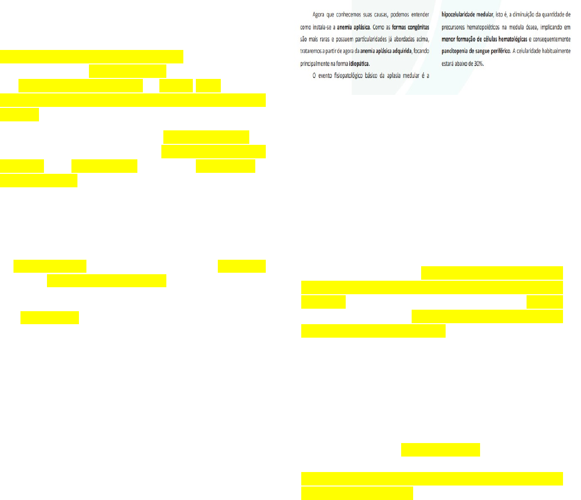 ANEMIA APLÁSICA · ANEMIA APLÁSICA -A anemia aplásica ou anemia aplástica é a mais comum das síndromes de falência medular, sendo caracterizada por acentuada hipocelularidade da medula óssea, tendo os precursores hematopoiéticos sido substituídos por tecido adiposo. -Essa diminuição da quantidade de células precursoras faz com que a produção medular de hemácias, leucócitos e plaquetas seja comprometida, levando à pancitopenia e reticulocitopenia em sangue periférico. -A anemia aplásica é uma doença rara, desencadeada por condições adquiridas ou congênitas -ETIOLOGIA -A forma adquirida na maior parte das vezes é idiopática, sem um fator causal identificável em 50 a 70% dos pacientes. -Em alguns casos, é possível encontrar associação entre um fator desencadeante e o desenvolvimento da anemia aplásica, sendo os mais classicamente descritos: • Drogas e agentes químicos: cimetidina, cloranfenicol, quimioterápicos, sulfas, metimazol, propiltiouracil, anticonvulsivantes (fenitoína, carbamazepina), benzeno, arsênico, dentre outros; ] • Radiação ionizante; • Vírus: hepatites não tipáveis (não-A, não-B, não-C, não-D, não-E), Epstein-Barr vírus (EBV). -As formas congênitas mais comuns da anemia aplásica são a anemia de Fanconi, a disqueratose congênita e a síndrome de Shwachman-Diamond a) Fanconi forma hereditária mais comum de aplasia medular, sendo um distúrbio autossômico recessivo caracterizado por fragilidade cromossômica aumentada - Essa redução no número de precursores hematopoiéticos na medula pode ser secundária a lesões diretas a essas células por agentes como o cloranfenicol, benzeno e vírus de hepatite. A principal teoria é que a anemia aplásica idiopática decorra de um evento de autoimunidade mediado por linfócitos T citotóxicos.] QUADRO CLÍNICO: Enquanto o quadro das aplasias congênitas é florido, habitualmente acompanhado de inúmeras malformações, a apresentação da anemia aplásica adquirida costuma ser insidiosa, girando em torno das citopenias de sangue periférico. - Basicamente, o paciente apresenta pancitopenia - Sintomas anêmicos como fraqueza e cansaço são comuns - Sangramentos pela plaquetopenia também podem ocorrer. O diagnóstico da anemia aplásica segue critérios laboratoriais bem específicos, que se baseiam tanto nas contagens hematológicas de sangue periférico quanto na biópsia de medula óssea. -Assim, esses são os exames primordiais para investigação de um quadro de aplasia. - No entanto, é preciso afastar outras causas de falência medular, como infiltração neoplásica, síndromes mielodisplásicas, doenças mieloproliferativas como a mielofibrose. -Para tal, exames complementares como a análise citogenética (cariótipo) e a imunofenotipagem por citometria de fluxo podem acrescentar informações ao diagnóstico diferencial, apesar de não serem essenciais para confirmar a anemia aplásica -ANEMIAS PARA REVISAR: A)MEGALOBLÁSTICA B)FERROPRIVA C)SIDEROBLÁSTICA D)ANAPLÁSICA E)DC F)DRC