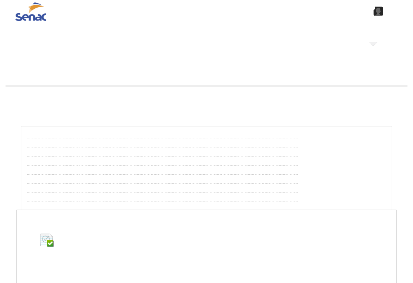28/07/23, 09:52 Revisar envio do teste: Questionário – RS-20233-... https://senac.blackboard.com/webapps/assessment/review/review.jsp?attempt_id=_32484722_1&course_id=_218930_1&content_id=_9855416_1&return_content=1&step= 1/5 Revisar envio do teste: Questionário RS-20233-PSG-TRH-EXPERIMENTACAO- Curso Técnico em Recursos Humanos - Experimentação - PSG - 2023/3 Atividades REVISAR ENVIO DO TESTE: QUESTIONÁRIO Usuário DARLEYDE DA SILVA JORGE Curso Curso Técnico em Recursos Humanos - Experimentação - PSG - 2023/3 Teste Questionário Iniciado 28/07/23 09:51 Enviado 28/07/23 09:51 Status Completada Resultado da tentativa 100 em 100 pontos Tempo decorrido 0 minuto Resultados exibidos Todas as respostas, Respostas enviadas, Comentários, Perguntas respondidas incorretamente Pergunta 1 Analise as seguintes menções (primeira coluna) e relacione-as aos seus respectivos significados: (1) Menção A (2) Menção PA (3) Menção NA MEU CURSO TÉCNICO 20 em 20 pontos DARLEYDE DA SILVA JORGE 2 https://senac.blackboard.com/webapps/blackboard/execute/courseMain?course_id=_218930_1 https://senac.blackboard.com/webapps/blackboard/content/listContent.jsp?course_id=_218930_1&content_id=_9855407_1&mode=reset https://www.ead.senac.br/ https://senac.blackboard.com/webapps/portal/execute/tabs/tabAction?tab_tab_group_id=_239_1 https://senac.blackboard.com/webapps/login/?action=logout 28/07/23, 09:52 Revisar envio do teste: Questionário – RS-20233-... https://senac.blackboard.com/webapps/assessment/review/review.jsp?attempt_id=_32484722_1&course_id=_218930_1&content_id=_9855416_1&return_content=1&step= 2/5 Resposta Selecionada: b. Respostas: a. b. c. d. Comentário da resposta: (4) Menção SM (5) Menção D (6) Menção ND ( ) É atribuída ao estudante que desenvolveu as competências necessárias e foi aprovado ao final da unidade curricular (UC). ( ) É atribuída ao estudante que não desenvolveu as competências necessárias e foi reprovado ao final da unidade curricular (UC). ( ) É atribuída ao estudante que não atendeu ao indicador de avaliação, ou seja, que precisa refazer sua atividade. ( ) É atribuída ao estudante que atendeu parcialmente ao indicador da atividade avaliativa, ou seja, ao estudante que precisa complementar ou alterar algo na atividade informada. ( ) É atribuída ao estudante que não realizou a entrega de atividade avaliativa. ( ) É atribuída ao estudante que atendeu ao indicador da atividade avaliativa, ou seja, que foi aprovado. + Qual é a sequência correta? 5 – 6 – 3 – 2 – 4 – 1 3 – 2 – 4 – 1 – 5 – 6 5 – 6 – 3 – 2 – 4 – 1 2 – 5 – 4 – 1 – 6 – 3 6 – 1 – 2 – 3 – 4 – 5 Parabéns! Você compreendeu as formas de avaliação e a metodologia pedagógica do Senac EAD. Pergunta 2 Resposta Selecionada: c. Respostas: a. Quais são os critérios avaliados pela metodologia do Senac? Conhecimentos, habilidades, atitudes e valores. Conhecimentos, disciplina, leitura e habilidades. 20 em 20 pontos 28/07/23, 09:52 Revisar envio do teste: Questionário – RS-20233-... https://senac.blackboard.com/webapps/assessment/review/review.jsp?attempt_id=_32484722_1&course_id=_218930_1&content_id=_9855416_1&return_content=1&step= 3/5 b. c. d. e. Comentário da resposta: Atividades, princípios, habilidades e valores. Conhecimentos, habilidades, atitudes e valores. Atividades, conhecimentos, princípios e valores. Atitudes, conhecimentos, princípios e ética. Parabéns! Os conhecimentos, as habilidades, as atitudes e os valores avaliados são considerados sob as perspectivas das realidades social, política, histórica, econômica e cultural em que as relações humanas, as situações de trabalho e a formação são construídas. Pergunta 3 Resposta Selecionada: d. Respostas: a. b. Que tal agora testar seus conhecimentos sobre a metodologia e o formato do curso? Analise as asserções a seguir e assinale “V” para verdadeira e “F” para falsa: ( ) A educação a distância (EAD) é uma modalidade de ensino mediada por tecnologias, na qual estudante e docente precisam estar no mesmo espaço físico ao mesmo tempo para que o processo de ensino e aprendizagem ocorra. ( ) As videoaulas estão disponíveis junto aos conteúdos das unidades curriculares para que os alunos possam assisti-las conforme sua disponibilidade. ( ) A participação nos momentos on-line é obrigatória e a ausência contabiliza falta para o aluno. ( ) Sempre que realizar pesquisas na Internet, o aluno deve citar as referências utilizadas nas atividades avaliativas. ( ) No ensino a distância, o aluno pode organizar seus estudos de acordo com sua rotina e disponibilidade, desde que respeitando os prazos de entrega do cronograma de estudos. Qual é a sequência correta? F – V – F – V – V V – V – V – F – F V – V – F – F – V 20 em 20 pontos 28/07/23, 09:52 Revisar envio do teste: Questionário – RS-20233-... https://senac.blackboard.com/webapps/assessment/review/review.jsp?attempt_id=_32484722_1&course_id=_218930_1&content_id=_9855416_1&return_content=1&step= 4/5 c. d. Comentário da resposta: V – F – F – V – V F – V – F – V – V Parabéns! Você demonstrou conhecer a metodologia pedagógica e o formato de curso do Senac EAD. Pergunta 4 Resposta Selecionada: b. Respostas: a. b. c. d. e. Comentário da resposta: Assinale a alternativa que contempla mais características a respeito do ambiente virtual de aprendizagem (AVA): É uma sala de aula virtual, na qual o aluno encontrará todos os conteúdos de estudo, as atividades e os canais de comunicação para interagir com tutores e colegas, a fim de potencializar a sua aprendizagem. É um fórum no qual é possível abrir tópicos de discussão sobre diversos assuntos. É uma sala de aula virtual, na qual o aluno encontrará todos os conteúdos de estudo, as atividades e os canais de comunicação para interagir com tutores e colegas, a fim de potencializar a sua aprendizagem. 