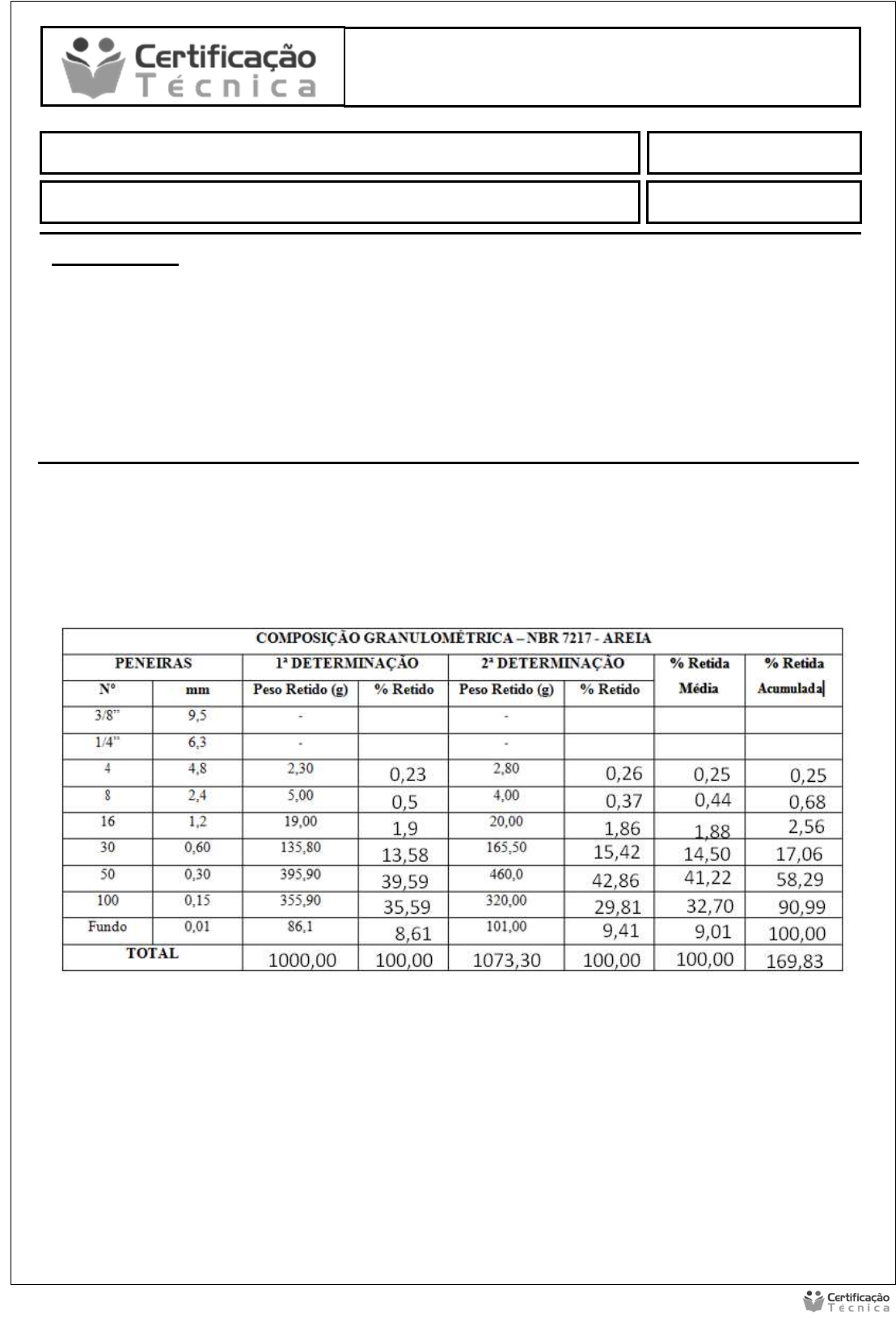 INSTRUÇÕES: Esta Avaliação contém 2 (duas) questões, totalizando 10 (dez) pontos; Baixe o arquivo disponível com a Atividade de Pesquisa; Você deve preencher dos dados no Cabeçalho para sua identificação: o Nome / Data de entrega. As respostas devem ser digitadas abaixo de cada pergunta; Ao terminar grave o arquivo com o nome Atividade Prática; Envio o arquivo pelo sistema no local indicado; Em caso de dúvidas consulte o seu Tutor. Aluno (a): SORAYA DA SILVA CAMPOS MENEZES Data: 18/11/2022. Mecânica dos Solos - EDI Mecânica dos Solos - EDI NOTA: Atividade Prática e de Pesquisa Esta atividade visa testar os conhecimentos desenvolvidos até aqui, para isso, res- ponda as perguntas que seguem. (Apresente os cálculos). 1. Com base na tabela abaixo, analise o solo em questão. Com base nos resultados acima, termine de preenchê-la, classifique o solo quanto a sua distribuição granulométrica, determine seus parâmetros e desenhe a curva. a) Coeficiente de não uniformidade; CNU= D60/D10= 7,5/9= 0,83 b) Coeficiente de curvatura; D30²/D60*D10= 8²/7,5*9= 0,95 c) Diâmetro máximo= 0,15 mm Mecânica dos Solos - EDI d) Diâmetro efetivo D10=9 D30 = 8 D60 = 7,5 e) Módulo de Finura; (0,25 + 0,68 + 2,56 + 17,06 + 58,29 + 90,99 / 100) = 1,69 2. Na determinação dos LL e LP de um solo, utilizou-se o método do aparelho de Ca- sagrande. Assim, foram obtidos os seguintes valores: Para LL: Mecânica dos Solos - EDI Para LP: Mecânica dos Solos - EDI Utilize o gráfico para desenho e interpolação, conforme demonstrado em aula. Dados: - Teor de umidade natural da amostra igual a 20%; - Peso específico aparente do solo seco igual a 2,10 t/m³; - Densidade relativa das partículas igual a 2,55; - O volume inicial da amostra que era de 8,5x103 cm³, passou a ser de 8,0x103 cm³ após a secagem na estufa. Determinar: a) LL= 30,07% b) LP= 24,41 + 25,92 + 26,20 + 24,41 + 26,67 / 5 = 25,52 c) IP= LL – LP = 30,07 – 25,52 = 4,55 d) IC= LL – W / LL – LP IC = 30,07 – 20 / 30,07 – 25,52 = 2,21 e) LC= (1 / 2,10 - 1 / 2,55) = 0,084 f) C (grau de contração do solo)= 8,5 * 10³ - 8 * 10³ / 8 * 10³ = 58,82*10³ g) As características do solo quanto à plasticidade, à consistência e à contração INTERPOLAÇÃO =34,82 −26,84/0-26,84=50 –8/ 25−8 =7,98/-26,84=42/17 42 LL – 1127,28 = 135,66 LL = 1262,94 / 42 = 30,07