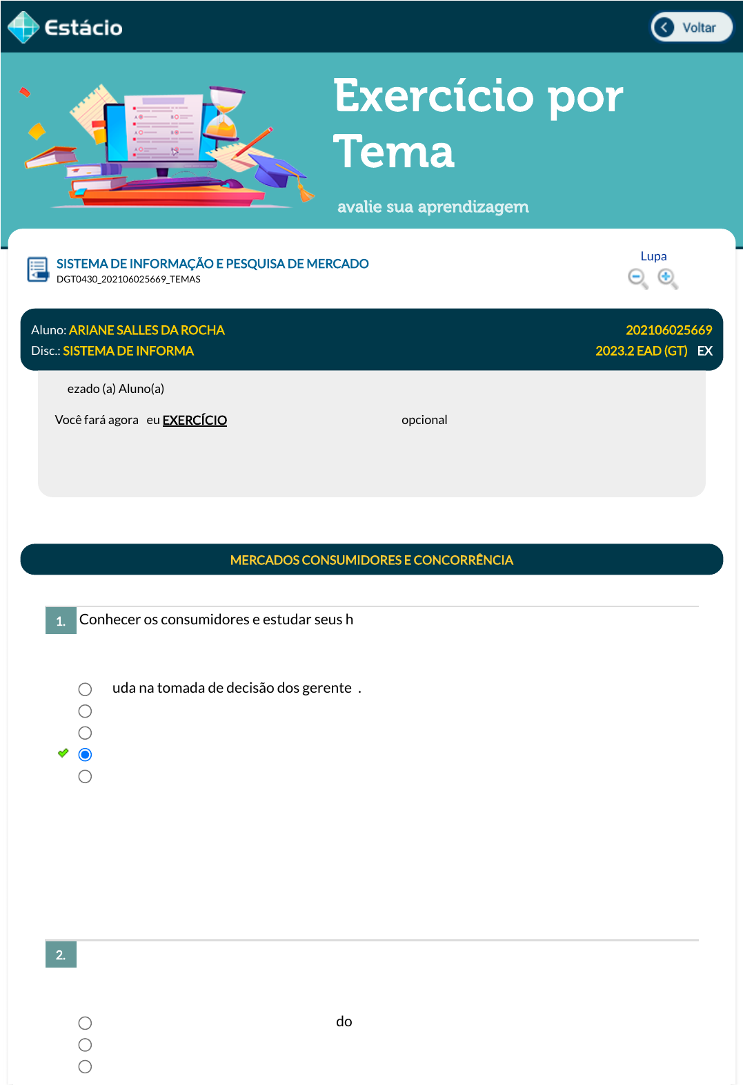 23/07/2023, 19:07 Estácio: Alunos https://simulado.estacio.br/alunos/ 1/3 Exercício por Tema avalie sua aprendizagem Conhecer os consumidores e estudar seus hábitos, seus valores, suas crenças e suas atitudes podem trazer diversos benefícios para as empresas, dentre eles, assinale a alternativa INCORRETA: Mapear potenciais é um dos grandes diferenciais usado pela inteligência competitiva. Nesse sentido, assinale a alternativa INCORRETA sobre um processo sistemático de mapeamento para tomada de decisão. SISTEMA DE INFORMAÇÃO E PESQUISA DE MERCADO Lupa DGT0430_202106025669_TEMAS Aluno: ARIANE SALLES DA ROCHA Matr.: 202106025669 Disc.: SISTEMA DE INFORMA 2023.2 EAD (GT) / EX Prezado (a) Aluno(a), Você fará agora seu EXERCÍCIO! Lembre-se que este exercício é opcional, mas não valerá ponto para sua avaliação. O mesmo será composto de questões de múltipla escolha. Após responde cada questão, você terá acesso ao gabarito comentado e/ou à explicação da mesma. Aproveite para se familiarizar com este modelo de questões que será usado na sua AV e AVS. MERCADOS CONSUMIDORES E CONCORRÊNCIA 1. Ajuda na tomada de decisão dos gerentes. Oferece conhecimento útil para a equipe de marketing. Apoia as estratégias de marketing. É necessário conhecer os consumidores apenas na concepção do produto. Evidencia as necessidades e desejos dos clientes. Data Resp.: 23/07/2023 19:05:00 Explicação: A resposta correta é: É necessário conhecer os consumidores apenas na concepção do produto. 2. Análise, de forma �ltrada e integrada, dos dados. Coleta e busca ética de dados. Disseminação das informações para uso interno. javascript:voltar(); javascript:voltar(); javascript:diminui(); javascript:aumenta(); 23/07/2023, 19:07 Estácio: Alunos https://simulado.estacio.br/alunos/ 2/3 Sabe-se que o acesso à informação é essencial para o marketing. No entanto, é comum que as empresas coletem informações desnecessárias ou insu�cientes, o que é um erro. Considerando o macroambiente no qual uma organização está envolvida, NÃO está relacionada a ele a força: Existem algumas fases de suma importância para que empreendedores e pro�ssionais de marketing consigam prospectar possíveis cenários no ambiente de negócios, são eles: I. Análise estrutural do sistema e do ambiente. II. Geração de cenários alternativos. III. Alteração no ambiente externo. É correto o que se a�rma em: São considerados elementos possíveis de analisar no mercado, EXCETO: Busca por sistemas simples de banco de dados. Descobrir as forças que regem os negócios. Data Resp.: 23/07/2023 19:05:40 Explicação: A resposta correta é: Busca por sistemas simples de banco de dados. 3. Produtiva. Sociocultural. Econômica. Nenhuma das alternativas. Tecnológica. Data Resp.: 23/07/2023 19:06:07 Explicação: A resposta correta é: Produtiva 4. I, apenas. II e III, apenas. I e II, apenas. II, apenas. III, apenas. Data Resp.: 23/07/2023 19:06:39 Explicação: A resposta correta é: I e II, apenas. 5. Segmentação adotada. 23/07/2023, 19:07 Estácio: Alunos https://simulado.estacio.br/alunos/ 3/3 Volume de transações realizadas. Principais práticas adotadas. Estruturas de custo. Cultura interna. Data Resp.: 23/07/2023 19:07:02 Explicação: A resposta correta é: Cultura Interna. Não Respondida Não Gravada Gravada Exercício inciado em 23/07/2023 19:04:34.