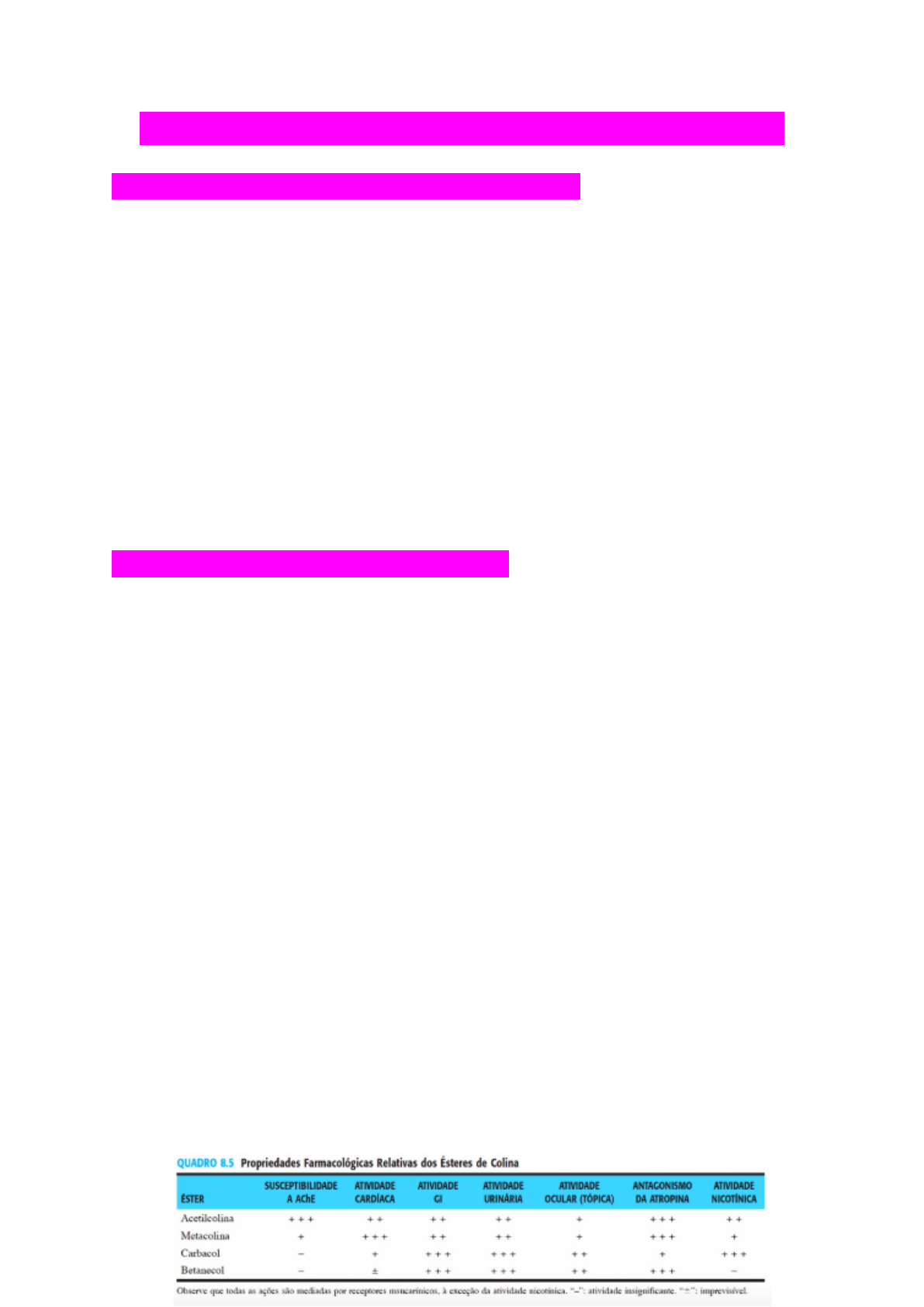 Farmacologia colinergica - Agonistas muscarínicos Classificação dos agonistas muscarínicos - Fármacos que se ligam ao receptor muscarínico produzindo efeito semelhante à acetilcolina 1. Drogas de ação direta ● Ocupam e ativam receptores muscarínicos ● Acetilcolina ● Derivados da acetilcolina - betanecol e carbacol ● Pilocarpina - é composto natural 2. Drogas de ação indireta ● Inibem a ação da acetilcolinesterase ● Aumentam níveis de ACh e potencializa seus efeitos Efeitos dos agonistas muscarínicos - Cardiovasculares ● Diminui frequência e débito cardíaco ● Vasodilatação generalizada ● Redução da pressão arterial - Músculo liso ● Contração e aumento do peristaltismo gastrointestinal ● Brônquios e bexiga também contraem ● Podem causar diarréia, urgência miccional e náuseas - Secreções sudoríparas, lacrimal, salivar e brônquica ● Estimulação de glândulas exócrinas ● Podem causar diaforese - Olhos ● Contração do músculo ciliar ● Pode causar miose (contração pupilar) OBS: Todo efeito depende a que receptor muscarínico o fármaco se liga e da sua seletividade - Carbacol e Betanecol são os fármacos mais utilizados - Metacolina apresentava problemas cardíacos (não se usa mais) - Atropina é antagonista muscarínico (fraco em carbacol) = ajuda nos efeito tóxicos Usos terapêuticos dos agonistas colinérgicos - Betanecol (Urecolina) ● Estimula músculo liso do TGI e bexiga em certos quadros neurológicos ou pós-cirúrgicos de atonia (v.o 10-20 mg/3x dia, ou s.c) - Pilocarpina (natural) ● Glaucoma (solução oftálmica 0,5-4%) ● Xerostomia (v.o 5-10 mg/3 dias) - Cevimelina ● Xerostomia (v.o ap, - efeitos colaterais) - Agonistas M1- seletivos ● Em estudo → Doença de alzheimer ● Reduz síntese de b-amilóide sem M2 pré-sináptico com menor liberação de ACh Exemplo: - Uso clínico na hiperplasia prostática benigna - Uso clínico para glaucoma - Contração do brônquio Reações adversas dos agonistas colinérgicos Contra-indicações - Asma - Distúrbios petiscos ácidos - Hipotensão (reduz fluxo sanguíneo) - Insuficiência coronariana