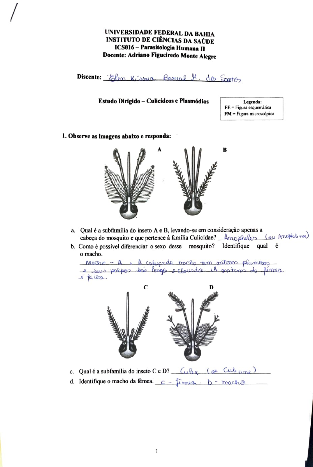 UNIVERSIDADE FEDERAL DA BAHIA INSTITUTO DE CIENCIAS DA SAÚDE ICS016- Parasitologia Humana Il Docente: Adriano Figueiredo Monte Alegre Discente:alim kaaPozmLa dh Ssto» Estudo Dirigido- Culicideos e Plasmódios Legenda: FE= Figura esqueinálica FM- Figura microscópica I. Observe as imagens abaixo e responda: B a. Qual é a subfamilia do inseto Ae B, levando-se em consideração apenas a cabeça do mosquito e que pertence à familia Culicidae? nophks b. Como é possivel diferenciar o sexo desse mosquito? Identifique qual é u ropl na) o macho. Moe AsACaluugodo mchp_npniDn umko- c. Qual é a subfamilia do inseto C e D? uhx o Cd sne d. Identifique o macho da fëmea. -mao bmoche 2. Identifique e caracterize as espécies de Plasmodium, através dos trofozoítos abaixo: B) A) A. lonmedium 4oluPwm lempactn-co pecl0 cdo LmpAN® tanmudumwuox_(tofozairoJouen zlosminisas BouR pecli 4a20d t attim siaads m fanmo d niispiauotD 3. Descreva as caracteristicas das formas evolutivas abaixo: "onon0 Ldalapau L4nTO amo d Ouarods Plasmódios humanos, Cystoisospora beli, Ciyptosporidium e Toxoplasma gondii Vamos Exercitar! Palavras cruzadas: oL Filo ao qual pertencem os plasmódios humanos, Cystoisaspora belli, Cryptosporidium e Toxoplasma gondii. Sua principal caracteristica é o complexo apical. oK2 Parasita causador da malária. K Genero do inseto hospedeiro definitivo do Plasmodium. 4 Forma evolutiva do Plasmodium infectante para o homem, que é inoculada durante o repasto sanguinco do mosquito. Os oocistos desse parasita possuem um formato eliptico, com as extremidades afuniladas e uma dupla parede cística. o Forma infectante do Cryptosporidium. E pequeno, esf rico ou ovóide e contëm quatro esporozoítos livres no seu interior quando climinado nas fczcs 3 3 A &