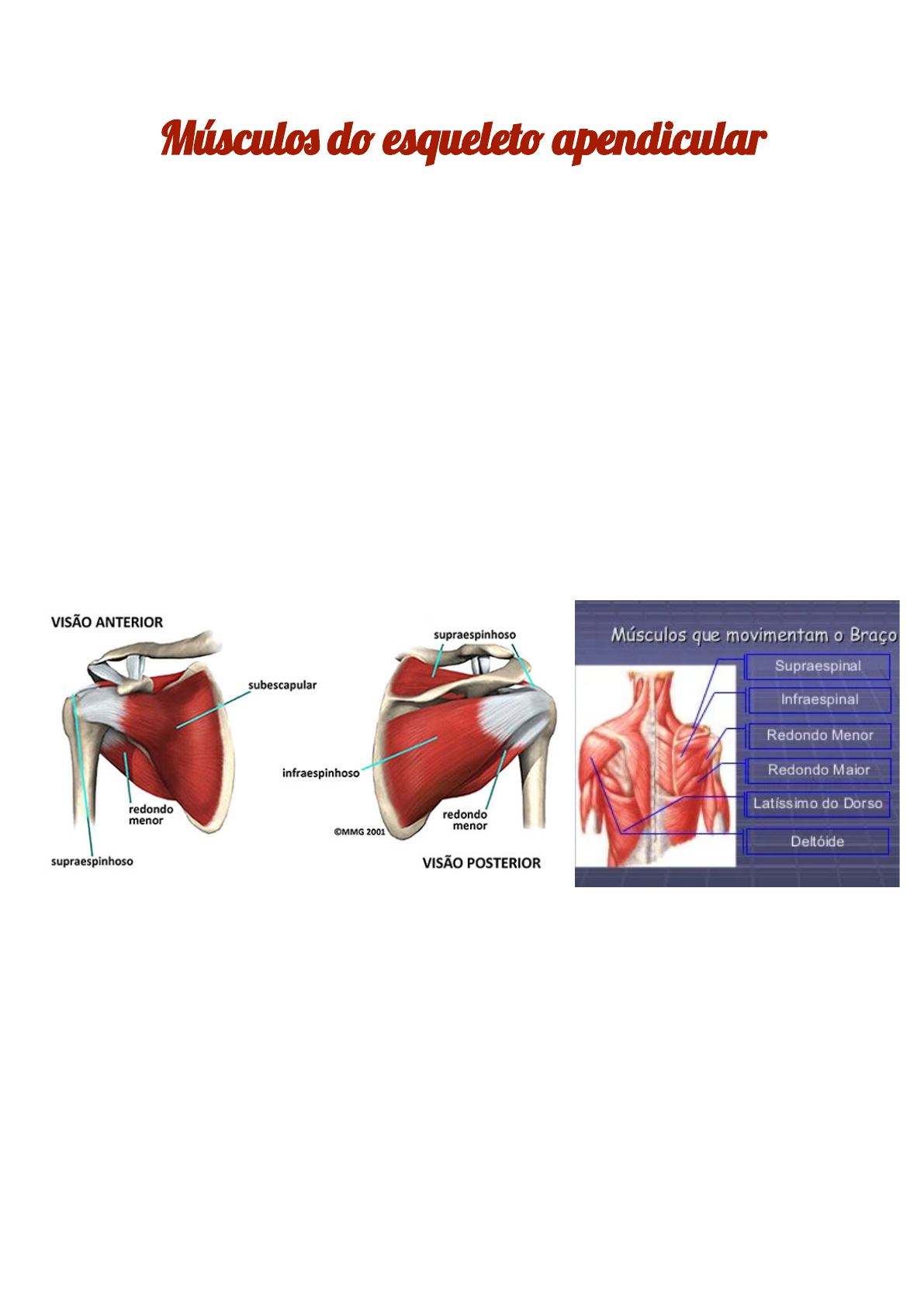 Múscul� d� esquelet� apendicular Membros superiores Ombro (músculos do manguito rotador) - Subescapular (rotador medial do úmero) - Supraespinal - Infraespinal - Redondo menor - Redondo maior (rotação medial interna e não faz parte do manguito rotador) OBS: ● Se fixam na escápula ● Vão em direção ao úmero ● Auxiliam na fixação da articulações ● Contraem em direção ao ponto fixo ● Fazem rotações (medial, lateral…) Braço - Deltóide (uniarticular) - Coracobraquial (flexão do cotovelo) - Bíceps braquial (flexão do cotovelo, braço…) - Braquial - Tríceps braquial (extensor do cotovelo) OBS: Flexão (concêntrica) / Extensão (excêntrica) Músculos do antebraço - Flexores do punho e dos dedos ➔ Origem do epicôndilo medial do úmero ➔ Tendões se subdividem e vão até os dedos ➔ Extensor radial curto e longo do carpo ➔ Flexores superficiais dos dedos → até falanges médias ➔ Flexores profundos dos dedos → até falanges distais ➔ Músculos pronadores - Extensores do punho e dos dedos (parte posterior) ➔ Extensor ulnar do carpo ➔ Região tenar ➔ Região hipotenar - Polegar Adutor longo Extensor curto e longo - Indicadores - Eminência tenar - Eminência hipotenar - Supinador OBS: Músculos lumbricais e interósseos (abdução e adução) Membros inferiores Quadril - Iliopsoas ➔ Formado por íleo e psoas maior ➔ Flexão do quadril e coxa Quadril e coxa - Glúteo máximo ➔ Extensão e rotação lateral do quadril - Glúteo medio e glúteo mínimo ➔ Ambos vão se fixar no trocanter maior fazendo abdução do quadril - Tensor da fáscia lata ➔ Aponeurose longa ➔ Abdutor do quadril - Piriforme ➔ Rotação lateral e externa do quadril ➔ Abaixo: Saída do nervo ciático Isquiotibiais - Posteriores da coxa - Fixam na perna - Semitendíneo (mais fino) e Semimembranoso (mais espesso) ➔ Ambos vão se fixar na parte medial - Bíceps femoral (fixa lateralmente) OBS: Eles vão passar pela articulação do joelho, fazendo a flexão dele Coxa - Sartório (flexão do quadril e joelho e é o mais longo do corpo humano) - Quadríceps femoral ➔ Vai cobrir quase toda coxa ➔ Reto femoral (flexão do quadril) ➔ Vasto medial ➔ Vasto lateral ➔ Vasto intermédio (atrás do reto femoral) ➔ Eles vão se unir e se ligar ao tendão quadricipital e se fixarem na tuberosidade do rádio ➔ Fazem a extensão do joelho - Adutores ➔ Função em conjunto de aproximar membro ao plano mediano ➔ Movimentos rotatórios ➔ Região medial ➔ Músculo pectíneo ➔ Adutor longo ➔ Adutor curto ➔ Grácil ➔ Adutor magno (mais forte e mais potente) Perna - Músculos anteriores ➔ Extensores de tornozelos ou dedos - Músculos posteriores ➔ Flexores - Tibial anterior ➔ Volumoso ➔ Tendão vão vai até os dedos - Extensor do tornozelo - Extensor longo dos dedos - Extensor longo do alexis - Fibular terceiro ➔ Fibulares (laterais) ➔ Fibular longo ➔ Fibular curto (ajuste lateral do pé) - Tríceps sural ➔ Gastrocnemio (tem 2 cabeças que se unem em unico tendão) ➔ Sóleo - Tendão do calcâneo - Plantar - Poplíteo - Pé - Intrínsecos do pé ➔ Extensor curto ➔ Extensor longo (tendões mais finos) - Plantar ➔ Flexores da região central ➔ Flexor do alaxis ➔ Flexor do dedo mínimo ➔ Flexor curto ➔ Flexores lumbricais ➔ Interósseos