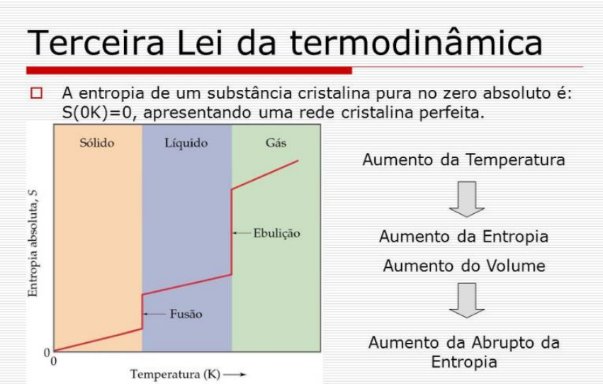 3ª Lei da Termodinâmica A terceira lei da termodinâmica afirma o seguinte, em relação às propriedades dos sistemas fechados em equilíbrio termodinâmico: A entropia de um sistema se aproxima de um valor constante conforme sua temperatura se aproxima do zero absoluto. Este valor constante não pode depender de nenhum outro parâmetro que caracterize o sistema fechado, como pressão ou campo magnético aplicado. No zero absoluto (zero kelvin), o sistema deve estar em um estado com a energia mínima possível. A entropia está relacionada ao número de microestados acessíveis e normalmente há um estado único (chamado de estado fundamental) com energia mínima. Nesse caso, a entropia no zero absoluto será exatamente zero. Se o sistema não tiver um pedido bem definido (se o pedido for vítreo, por exemplo), então pode haver alguma entropia finita conforme o sistema é levado a temperaturas muito baixas, seja porque o sistema fica travado em uma configuração com energia não mínima ou porque o estado de energia mínima é não exclusivo. O valor constante é chamado de entropia residual do sistema. A entropia é essencialmente uma função de estado, significando o valor inerente de diferentes átomos, moléculas e outras configurações de partículas, incluindo material subatômico ou atômico, é definida pela entropia, que pode ser descoberta perto de 0 K. A declaração de Nernst- Simon de a terceira lei da termodinâmica diz respeito aos processos termodinâmicos a uma temperatura fixa e baixa: A mudança de entropia associada a qualquer sistema condensado passando por um processo isotérmico reversível se aproxima de zero quando a temperatura na qual é realizada se aproxima de 0 K. Aqui, um sistema condensado se refere a líquidos e sólidos. Uma formulação clássica de Nernst (na verdade, uma consequência da Terceira Lei) é: É impossível para qualquer processo, por mais idealizado que seja, reduzir a entropia de um sistema ao seu valor zero absoluto em um número finito de operações. Existe também uma formulação da Terceira Lei que aborda o assunto postulando um comportamento energético específico: Se o composto de dois sistemas termodinâmicos constitui um sistema isolado, então qualquer troca de energia em qualquer forma entre esses dois sistemas é limitada. Um exemplo de sistema que não tem um estado fundamental único é aquele cujo spin líquido é um meio-inteiro, para o qual a simetria de reversão do tempo fornece dois estados fundamentais degenerados. Para tais sistemas, a entropia à temperatura zero é de pelo menos k B * ln (2) (que é desprezível em uma escala macroscópica). Alguns sistemas cristalinos apresentam frustração geométrica, em que a estrutura da rede cristalina impede o surgimento de um estado fundamental único. O hélio no estado fundamental (a menos que esteja sob pressão) permanece líquido. Além disso, vidros e soluções sólidas retêm grande entropia a 0 K, porque são grandes coleções de estados quase degenerados, nos quais ficam presos fora do equilíbrio. Outro exemplo de um sólido com muitos estados fundamentais quase degenerados, preso fora do equilíbrio, é o gelo ih, que tem "desordem de prótons". Para que a entropia no zero absoluto seja zero, os próprios momentos magnéticos de um cristal perfeitamente ordenado devem ser perfeitamente ordenados; de uma perspectiva entrópica, isso pode ser considerado parte da definição de um "cristal perfeito". Apenas materiais ferromagnéticos, antiferromagnéticos e diamagnéticos podem satisfazer essa condição. No entanto, os materiais ferromagnéticos não têm, de fato, entropia zero na temperatura zero, porque os spins dos elétrons desemparelhados estão todos alinhados e isso dá uma degenerescência do spin no estado fundamental. Os materiais que permanecem paramagnéticos a 0 K, por outro lado, podem ter muitos estados fundamentais quase degenerados (por exemplo, em um vidro de spin) ou podem reter desordem dinâmica (um líquido de spin quântico). Em termos simples, a terceira lei afirma que a entropia de um cristal perfeito de uma substância pura se aproxima de zero quando a temperatura se aproxima de zero. O alinhamento de um cristal perfeito não deixa ambiguidades quanto à localização e orientação de cada parte do cristal. À medida que a energia do cristal é reduzida, as vibrações dos átomos individuais são reduzidas a nada, e o cristal torna-se o mesmo em todos os lugares.