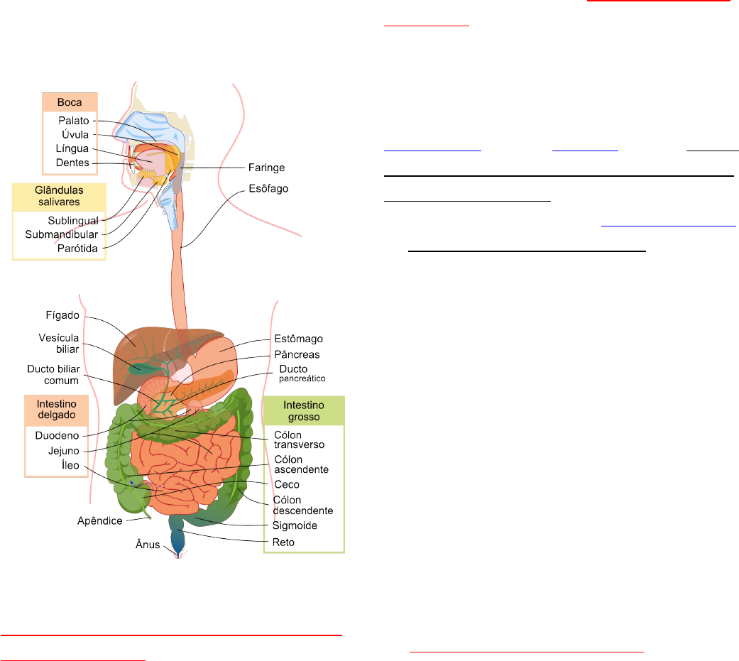 Sistema Digestório O sistema digestório humano é unidirecional. A função da digestão é transformar as macromolé- culas em micromoléculas, para serem absorvidas pelo organismo. Boca - pH = 7,0 A digestão do amido começa na boca e termina no intestino delgado Digestão Mecânica Compreende a mastigação, deglutição e movi- mentos peristálticos. Esses processos ocorrem pela ação dos dentes. O esôfago leva o alimento até o estômago e a traquéia leva o ar para os pulmões. O esôfago possui musculos lisos e estriados. Digestão Química Depende da ação de enzimas presentes em várias secreções liberadas ao longo do sistema di- gestório. Na saliva, produzida pelas glându las salivares, está presente a AMILASE SALIVAR (PTIALINA). Ela dá início à digestão química dos carboidratos, catalisando a quebra do amido e do glicogênio, em pequenos polissacarídeos e também no dissacarídeo maltose. A saliva também tem em sua composição uma glicoproteína chamada MUCINA, capaz de prote- ger a cavidade bucal contra a abrasão e também lubrificar os alimentos. Existem também enzimas que neutralizam os ácidos e a enzima LISOZIMA, que combate as colônias de bactérias Amido → amilase salivar → maltose (polissac) pH=8,0 (dissac) Faringe: é um órgão muscular e cartilaginoso que faz parte do sist. respiratório e digestório. Fígado (BILE - pH = 8,0 e 8,5) Armazena glicogênio (carboidrato de reserva) Regula a quantidade de glicose no sangue. Transfroma glicose em gordura Produz colesterol e sais biliares Armazena vitaminas e sais minerais. E, faz a ativação da vitamina D Converte Amônia em Uréia Atua na síntese de proteínas responsáveis pela coagulação do sangue Atua na degradação de medicamentos e toxi- nas (álcool) Produz a BILE (formada por sais biliares, co- lesterol e bilirrubina); que depois fica armaze- nada na vesícula biliar e flui para o duodeno. Destrói os glóbulos vermelhos não funcionais, formando subprodutos como a bilirrubina, que são incorporados à bile e posteriormente eli- minados com as fezes Estômago - pH = 2,0 Localiza-se abaixo do diafragma. Sua principal função é realizar o armazenamento do alimento e a digestão de proteínas, porém uma pequena parte das substâncias pode ser absorvida pela pa- rede estomacal e enviada para o sangue. Possui 4 glândulas: 1 endócrina e 3 exócrinas Uma das exócrinas que produz a enzima gástrica (atuam em pH ácido). Essa produz o pepsinogênio (forma ina- tiva da pepsina) HCl (ativa a pepsina) Pepsina ativa (pH = 2,0): quebra todas as proteínas em peptídios Célula Parietal: excreta Cl ¯ e H + para fora da célula formando o HCl. Também secretam a proteína fator intrínseco que é fundamental para permitir a absorção da vitamina B12 (produção dos glóbulos vermelhos) no intestino. Célula principal: pepsinogênio O estômago secreta o suco gástrico que é produzi- do pela mucosa estomacal. A mistura do suco gástrico com o bolo alimentar é denominado QUIMO. Nas crianças o suco gástrico contém RENINA ou lab fermento que transforma a proteína solúvel do leite em um preciptado (caseína), o que facili- ta a ação da pepsina. Existem dois componentes no suco capazes de conjuntamente promover a digestão química dos alimentos: ácido clorídrico e a pepsina O HCl também desnatura as proteínas dos ali- mentos Proteína → Pepsina → Peptídeos (polipep) pH=2,0 menores O muco produzido pela parede estomacal a reves- te e a protege da ação do suco gástrico. Ele é composto por uma mistura de gicoproteínas, células e sais. O suco gástricco não destrói as células que o pro- duzem, pois os componentes do suco ficam inati- vos até serem liberados no interior estomacal. Pâncreas (pH = 8,0) Função exócrina: atua na produção de bicarbona- to de sódio e enzimas digestivas (tripsina e quimi- otripsina) São as céluas do ducto (dentro do pâncreas) que produz e secreta NaHCO3 O bicarbonato caminha pelo ducto e é jogado dentro do instestino delgado para neutralizar a acidez do quimo. Quando o NaHCO3 entra em contato com o HCl ocorre uma reação formando: NaCl + CO2 + H2O, resolvendo o problema da acidez do estô- mago Bicarbonato de sódio + enzimas digestivas = suco pancreático É uma secreção alcalina. O bicarbonato eleva o pH intestinal, deixando-o básico Células Acinares: produzem as enzimas diges- tivas do pâncreas O conjunto de células acinares formam bolsas chamadas ácinos pancreáticos Ácidos nucleicos → nucleases pencreaticas → nucleotídeos pH=8,0 lipídio → lipases pancreáticas → ácido gra- xos + glicerol Proteínas → tripsina e quimiotripsina → pep- tídios menores São ativadas pela enzima enteroquinase A enzima enteroquinase é produzida pe- las células do duodeno durante a passagem do alimento e responsável por catalisar tripsinogênio em tripsina.