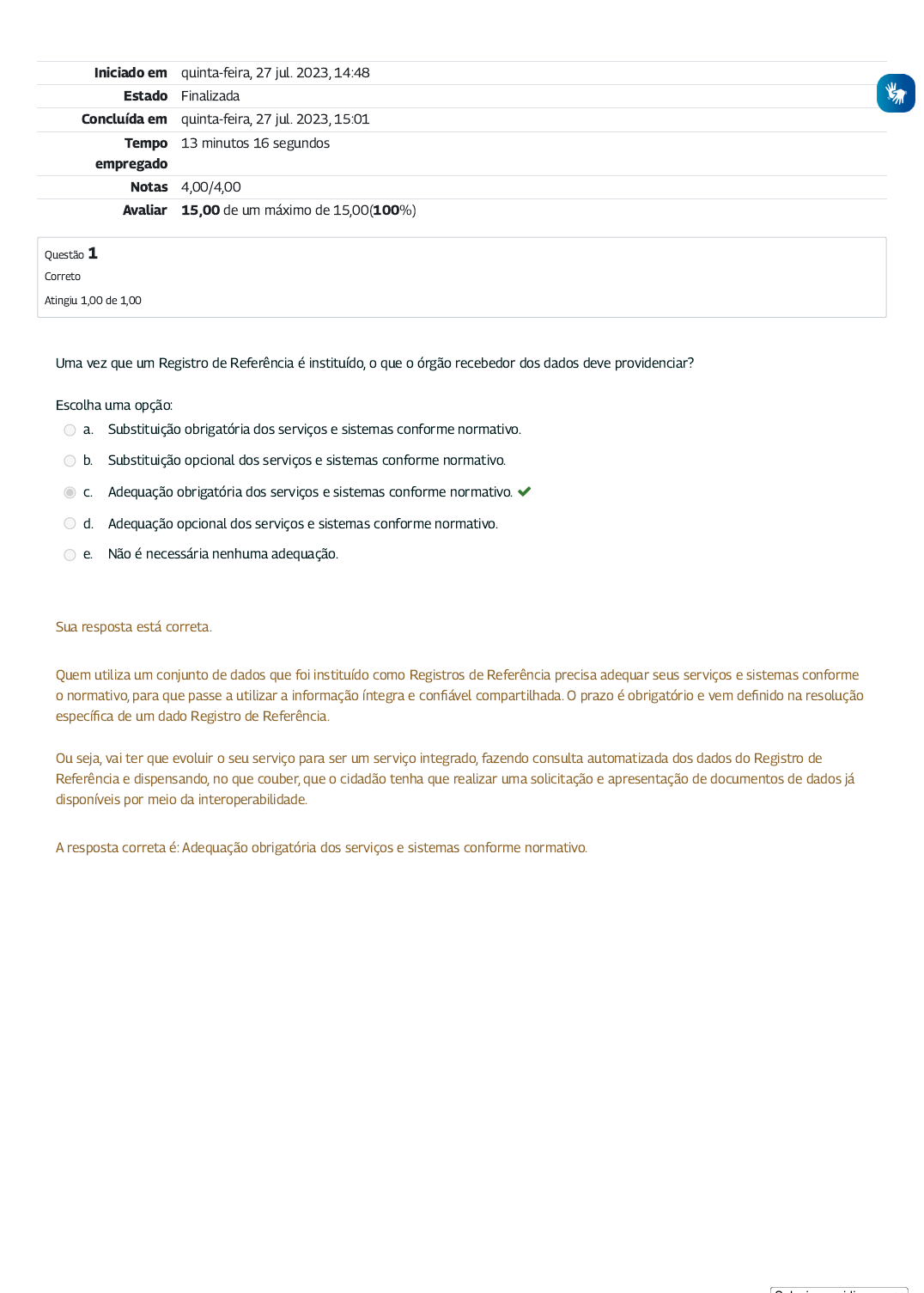 27/07/2023, 15:02 Exercício avaliativo - Módulo 5: Revisão da tentativa https://mooc41.escolavirtual.gov.br/mod/quiz/review.php?attempt=35385&cmid=1133 1/4 Iniciado em quinta-feira, 27 jul. 2023, 14:48 Estado Finalizada Concluída em quinta-feira, 27 jul. 2023, 15:01 Tempo empregado 13 minutos 16 segundos Notas 4,00/4,00 Avaliar 15,00 de um máximo de 15,00(100%) Questão 1 Correto Atingiu 1,00 de 1,00 Uma vez que um Registro de Referência é instituído, o que o órgão recebedor dos dados deve providenciar? Escolha uma opção: a. Substituição obrigatória dos serviços e sistemas conforme normativo. b. Substituição opcional dos serviços e sistemas conforme normativo. c. Adequação obrigatória dos serviços e sistemas conforme normativo. d. Adequação opcional dos serviços e sistemas conforme normativo. e. Não é necessária nenhuma adequação. Sua resposta está correta. Quem utiliza um conjunto de dados que foi instituído como Registros de Referência precisa adequar seus serviços e sistemas conforme o normativo, para que passe a utilizar a informação íntegra e con�ável compartilhada. O prazo é obrigatório e vem de�nido na resolução especí�ca de um dado Registro de Referência. Ou seja, vai ter que evoluir o seu serviço para ser um serviço integrado, fazendo consulta automatizada dos dados do Registro de Referência e dispensando, no que couber, que o cidadão tenha que realizar uma solicitação e apresentação de documentos de dados já disponíveis por meio da interoperabilidade. A resposta correta é: Adequação obrigatória dos serviços e sistemas conforme normativo. S l i idi 27/07/2023, 15:02 Exercício avaliativo - Módulo 5: Revisão da tentativa https://mooc41.escolavirtual.gov.br/mod/quiz/review.php?attempt=35385&cmid=1133 2/4 Questão 2 Correto Atingiu 1,00 de 1,00 Uma vez que um Registro de Referência é instituído, o que os órgãos e entidades do Poder Executivo Federal passam a estar proibidos de fazer? Escolha uma opção: a. Instituir novos serviços integrados que tratem do tema do Registro. b. Instituir novas bases de dados que tratem de qualquer tema, sem exceção. c. Instituir novas bases de dados que tratem de qualquer tema, exceto quando autorizado pela Secretaria de Governo Digital. d. Instituir novas bases de dados que tratem do tema do Registro, sem exceção. e. Instituir novas bases de dados que tratem do tema do Registro, exceto quando autorizado pela Secretaria de Governo Digital. Sua resposta está correta. Uma vez de�nido por resolução um determinado Registro de Referência, �ca proibida a instituição de novas bases de dados que tratem do tema do Registro no âmbito do Poder Executivo Federal, exceto quando autorizado pela Secretaria de Governo Digital. A resposta correta é: Instituir novas bases de dados que tratem do tema do Registro, exceto quando autorizado pela Secretaria de Governo Digital. Selecione o idioma Powered by Tradutor https://translate.google.com/ 27/07/2023, 15:02 Exercício avaliativo - Módulo 5: Revisão da tentativa https://mooc41.escolavirtual.gov.br/mod/quiz/review.php?attempt=35385&cmid=1133 3/4 Questão 3 Correto Atingiu 1,00 de 1,00 Qual das características abaixo de dados abertos está relacionada de maneira mais próxima à dados interoperáveis? Escolha uma opção: a. Dados acessíveis ao público. b. Dados estruturados em formato aberto. c. Dados referenciados na internet. d. Dados disponibilizados sob licença aberta que permita sua livre utilização, consumo ou tratamento. e. Dados gerados ou acumulados que não estejam sob sigilo ou sob restrição conforme legislação. Sua resposta está correta. Conforme Lei 14.129/2021, a de�nição de dados abertos é: “ [...] IV – dados abertos: dados acessíveis ao público, representados em meio digital, estruturados em formato aberto, processáveis por máquina, referenciados na internet e disponibilizados sob licença aberta que permita sua livre utilização, consumo ou tratamento por qualquer pessoa, física ou jurídica; V – dado acessível ao público: qualquer dado gerado ou acumulado pelos entes públicos que não esteja sob sigilo ou sob restrição de acesso nos termos da Lei no 12.527, de 18 de novembro de 2011 (Lei de Acesso à Informação); VI – formato aberto: formato de arquivo não proprietário, cuja especi�cação esteja documentada publicamente e seja de livre conhecimento e implementação, livre de patentes ou de qualquer outra restrição legal quanto à sua utilização [...]” A partir dessas de�nições, percebe-se que dados abertos exigem que os dados sejam interoperáveis não apenas em uma perspectiva técnica, mas também nas perspectivas legais e institucionais. Do ponto de vista de interoperabilidade técnica, isso acontece para dados abertos quando arquivos eletrônicos de dados são disponibilizados utilizando-se formatos não proprietários e abertamente documentados, podendo ser editados por humanos e utilizados por máquina, de forma agnóstica em relação à linguagem, tecnologia e infraestrutura. A resposta correta é: Dados estruturados em formato aberto. 27/07/2023, 15:02 Exercício avaliativo - Módulo 5: Revisão da tentativa https://mooc41.escolavirtual.gov.br/mod/quiz/review.php?attempt=35385&cmid=1133 4/4 Questão 4 Correto Atingiu 1,00 de 1,00 No conceito Governo como Plataforma, é apresentada uma nova maneira de construir serviços públicos digitais. Qual alternativa ilustra melhor o modelo de desenvolvimento nesse conceito? Escolha uma opção: a. Modelo de desenvolvimento colaborativo por uso de dados compartilhados por meio de convênios. b. Modelo de desenvolvimento colaborativo por órgãos e entidades públicos. c. Modelo de desenvolvimento colaborativo por uma comunidade de parceiros, fornecedores e cidadãos. d. Modelo de desenvolvimento consultivo por uso de dados compartilhados por meio de convênios. e. Modelo de desenvolvimento consultivo por uma co