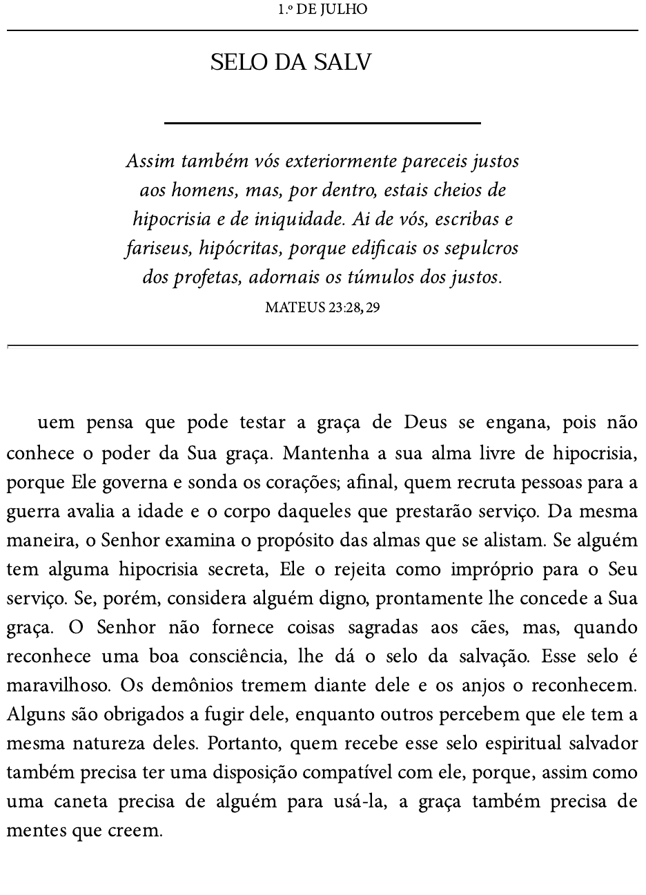 1.º DE JULHO SELO DA SALVAÇÃO CIRILO Assim também vós exteriormente pareceis justos aos homens, mas, por dentro, estais cheios de hipocrisia e de iniquidade. Ai de vós, escribas e fariseus, hipócritas, porque edi�cais os sepulcros dos profetas, adornais os túmulos dos justos. MATEUS 23:28,29 Quem pensa que pode testar a graça de Deus se engana, pois não conhece o poder da Sua graça. Mantenha a sua alma livre de hipocrisia, porque Ele governa e sonda os corações; a�nal, quem recruta pessoas para a guerra avalia a idade e o corpo daqueles que prestarão serviço. Da mesma maneira, o Senhor examina o propósito das almas que se alistam. Se alguém tem alguma hipocrisia secreta, Ele o rejeita como impróprio para o Seu serviço. Se, porém, considera alguém digno, prontamente lhe concede a Sua graça. O Senhor não fornece coisas sagradas aos cães, mas, quando reconhece uma boa consciência, lhe dá o selo da salvação. Esse selo é maravilhoso. Os demônios tremem diante dele e os anjos o reconhecem. Alguns são obrigados a fugir dele, enquanto outros percebem que ele tem a mesma natureza deles. Portanto, quem recebe esse selo espiritual salvador também precisa ter uma disposição compatível com ele, porque, assim como uma caneta precisa de alguém para usá-la, a graça também precisa de mentes que creem. JULHO 1.º DE JULHO: Selo da salvação