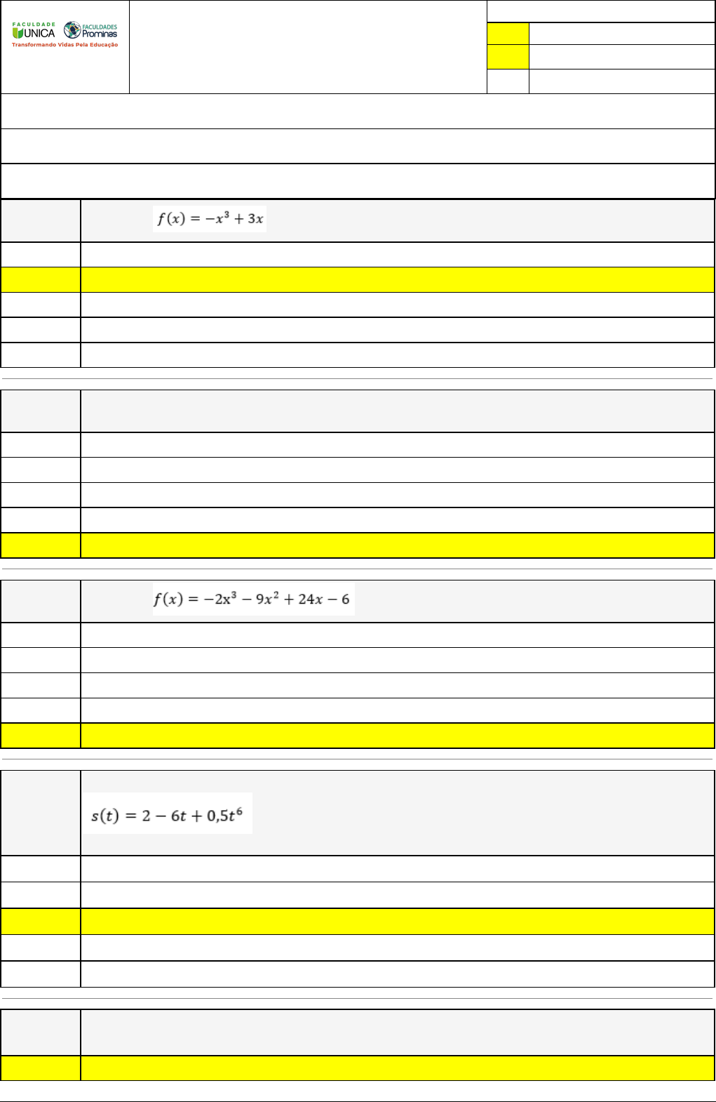 Pincel Atômico - 23/07/2023 15:22:52 1/2 RAPHAEL VIEIRA CORREA Exercício Caminho do Conhecimento - Etapa 12 (19300) Atividade finalizada em 22/07/2023 20:09:03 (925628 / 1) LEGENDA Resposta correta na questão # Resposta correta - Questão Anulada X Resposta selecionada pelo Aluno Disciplina: TEORIA DOS NÚMEROS [855440] - Avaliação com 8 questões, com o peso total de 1,67 pontos [capítulos - 6] Turma: Segunda Graduação: Segunda Graduação 6 meses - Licenciatura em Matemática - Grupo: FPD-FEV2022 - SGegu0A280423 [90758] Aluno(a): 91463497 - RAPHAEL VIEIRA CORREA - Respondeu 7 questões corretas, obtendo um total de 1,46 pontos como nota [353990_39694] Questão 001 A função tem um ponto de máximo relativo para x igual a: X 0 1 1/3 -1 3 [353990_39809] Questão 002 A função f(x) = 2x³ + 9x² - 24x + 6 é decrescente no intervalo: -1 < x < 4 x > 1 x > 0 x < - 4 X – 4 < x < 1 [353990_39697] Questão 003 A função é decrescente no intervalo: x > 1 -1 < x < 4 x > 0 – 4 < x < 1 X x < - 4 ou x > 1 [353990_39699] Questão 004 Um corpo se movimenta, obedecendo à função horária Então podemos afirmar que: A velocidade é definida por v(t) = 6 – 3t5 A velocidade é definida por v(t) = 3t5 X A velocidade é definida por v(t) = - 6 + 3t5 A velocidade é definida por v(t) = -6 – 3t5 A velocidade é definida por v(t) = – 3t5 [353991_39811] Questão 005 Entre todos os retângulos de área igual a 36 m2, o lado daquele que tem o menor perímetro é X o quadrado de lado 6 cm. Pincel Atômico - 23/07/2023 15:22:52 2/2 o quadrado de lado 5 cm. o quadrado de lado 8 cm. o quadrado de lado 7 cm. o quadrado de lado 4 cm. [353990_39698] Questão 006 Entre todos os retângulos de área igual a 64 cm2, o lado daquele que tem o menor perímetro é: o quadrado de lado 7 cm. o quadrado de lado 4 cm. o quadrado de lado 6 cm. o quadrado de lado 5 cm. X o quadrado de lado 8 cm. [353990_39807] Questão 007 Se f(x) = senx + cosx + tgx, então f´(0) é igual a: 1/2 – 1/2 – 1 X 2 1 [353990_39701] Questão 008 A função tem um ponto crítico para x igual a: X 0 -1 2 1 -2
