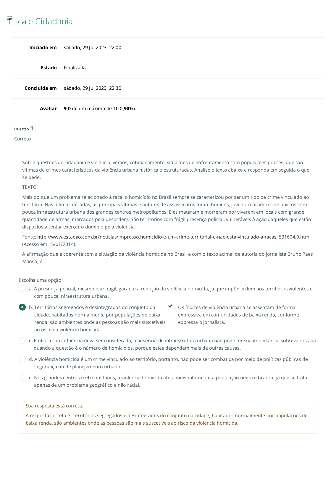 Ética e Cidadania Iniciado em sábado, 29 Jul 2023, 22:00 Estado Finalizada Concluída em sábado, 29 Jul 2023, 22:30 Avaliar 9,0 de um máximo de 10,0(90%) Questão 1 Correto Sobre questões de cidadania e violência, vemos, cotidianamente, situações de enfrentamento com populações pobres, que são vítimas de crimes característicos da violência urbana histórica e estruturadas. Analise o texto abaixo e responda em seguida o que se pede. TEXTO Mais do que um problema relacionado à raça, o homicídio no Brasil sempre se caracterizou por ser um tipo de crime vinculado ao território. Nas últimas décadas, as principais vítimas e autores de assassinatos foram homens, jovens, moradores de bairros com pouca infraestrutura urbana dos grandes centros metropolitanos. Eles mataram e morreram por viverem em locais com grande quantidade de armas, marcados pela desordem. São territórios com frágil presença policial, vulneráveis à ação daqueles que estão dispostos a tentar exercer o domínio pela violência. Fonte: http://www.estadao.com.br/noticias/impresso,homicidio-e-um-crime-territorial-e-nao-esta-vinculado-a-racas, 531604,0.htm. (Acesso em 15/01/2014). A a�rmação que é coerente com a situação da violência homicida no Brasil e com o texto acima, de autoria do jornalista Bruno Paes Manso, é: Escolha uma opção: a. A presença policial, mesmo que frágil, garante a redução da violência homicida, já que impõe ordem aos territórios violentos e com pouca infraestrutura urbana. b. Territórios segregados e desintegrados do conjunto da cidade, habitados normalmente por populações de baixa renda, são ambientes onde as pessoas são mais suscetíveis ao risco da violência homicida. Os índices de violência urbana se assentam de forma expressiva em comunidades de baixa renda, conforme expressa o jornalista. c. Embora sua in�uência deva ser considerada, a ausência de infraestrutura urbana não pode ter sua importância sobrevalorizada quando a questão é o número de homicídios, porque estes dependem mais de outras causas. d. A violência homicida é um crime vinculado ao território, portanto, não pode ser combatida por meio de políticas públicas de segurança ou de planejamento urbano. e. Nos grandes centros metropolitanos, a violência homicida afeta indistintamente a população negra e branca, já que se trata apenas de um problema geográ�co e não racial. Sua resposta está correta. A resposta correta é: Territórios segregados e desintegrados do conjunto da cidade, habitados normalmente por populações de baixa renda, são ambientes onde as pessoas são mais suscetíveis ao risco da violência homicida. http://www.estadao.com.br/noticias/impresso,homicidio-e-um-crime-territorial-e-nao-esta-vinculado-a-racas https://aula.fael.edu.br/ Questão 2 Correto Uma ação pedagógica realmente pautada na diversidade cultural deve ter como princípio uma política curricular da identidade e da diferença. Tem obrigação de ir além das benevolentes declarações de boa vontade para com a diferença, ela coloca em seu centro uma teoria que permita não só reconhecer e celebrar a diferença, mas também questioná-la, a �m de perceber como ela discursivamente está constituída. Leia a seguinte sentença: “Temas como gênero, sexualidade e diversidade sexual estão pautados dentro das políticas sociais e devem ser discutidos em diferentes instâncias da sociedade”. A expressão “gênero”, na sentença transcrita, refere-se: Escolha uma opção: a. Às diferenças entre o masculino e o feminino que foram construídas exclusivamente depois dos movimentos feministas. b. Às diferenças entre o masculino e o feminino que foram construídas a partir do século XXI. c. Às diferenças entre o masculino e o feminino que foram construídas no decorrer da história da humanidade por meio dos costumes, ideias, atitudes, crenças e regras criadas pela sociedade. Essa temática, dentro da escola, é de caráter interdisciplinar e requer do corpo docente conhecimentos nas áreas de fundamentos éticos, conhecimentos jurídicos, noções histórico-geográ�cas, conceitos sócio antropológicos, entendimento na área de linguagens e representações, conhecimentos populacionais, psicológicos e pedagógicos. d. Exclusivamente às características físicas e biológicas entre o corpo do homem e da mulher, depois que eles atingem a maturidade sexual. e. Exclusivamente às características físicas e biológicas entre o corpo do homem e da mulher, do menino e da menina. Sua resposta está correta. A resposta correta é: Às diferenças entre o masculino e o feminino que foram construídas no decorrer da história da humanidade por meio dos costumes, ideias, atitudes, crenças e regras criadas pela sociedade. https://aula.fael.edu.br/ Questão 3 Correto Questão 4 Correto A Gestão Democrática na escola pública é um processo por meio do quais decisões são tomadas, encaminhamentos são realizados, ações são executadas, acompanhadas, �scalizadas e avaliadas coletivamente, isto é, com a efetiva participação de todos os segmentos da comunidade escolar (SEDUC, 2012, p. 7). Sobre Gestão Democrática, leia as seguintes a�rmativas. I. É compreendida como um processo político através do qual as pessoas que atuam na/sobre a escola identi�cam problemas, discutem, deliberam e planejam, encaminham, acompanham, controlam e avaliam o conjunto das ações voltadas ao desenvolvimento da própria escola na busca da solução de problemas. II. Tende a transferir para a escola a rigidez característica de grandes organizações, passando pela delegação de autoridade, a departamentalização e a especialização até aos desempenhos mínimos aceitáveis, consagrados por regras universais e abstratas. III. Trabalha com atores sociais e suas relações com o ambiente, como sujeitos da construção da história humana, gerando participação, corresponsabilidade e