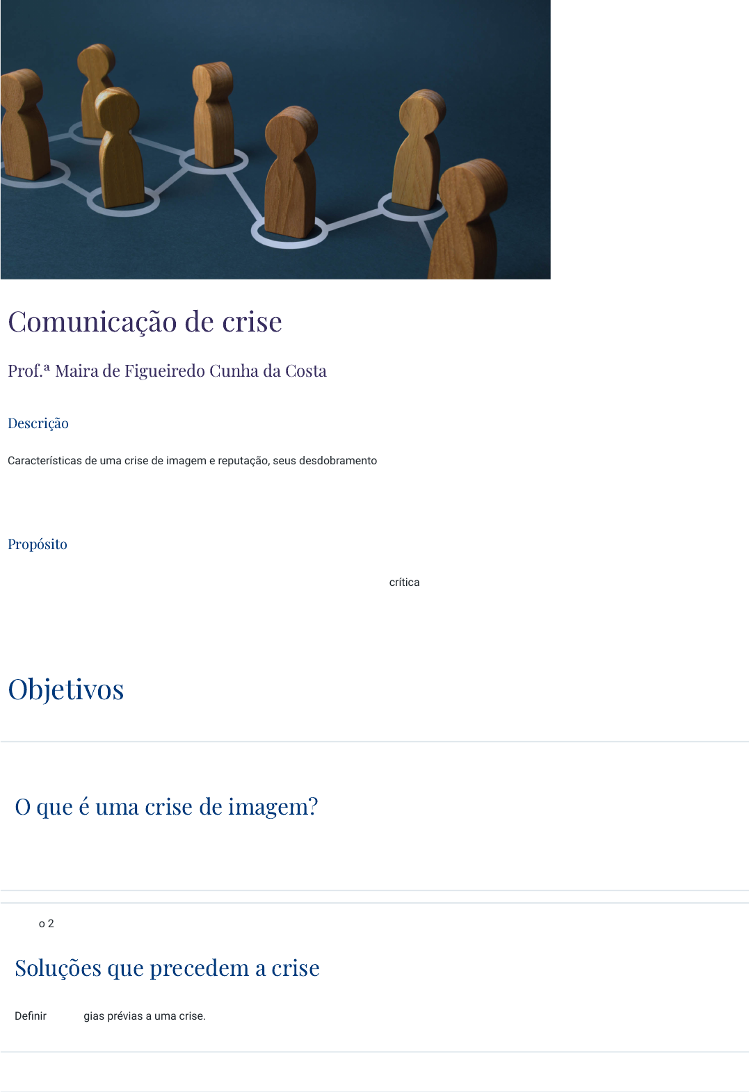 Comunicação de crise Prof.ª Maira de Figueiredo Cunha da Costa Descrição Características de uma crise de imagem e reputação, seus desdobramentos, possíveis impactos e melhores práticas de gestão. Plano de crise com seus principais elementos: cenário, mensagens-chave, preparação do porta-voz, contato com jornalistas, mensuração dos resultados. Definição de gestão de crise. Crises e opinião pública. Imagem de marca e crise. Propósito Compreender a dinâmica de uma crise de imagem, considerando de maneira crítica os elementos envolvidos e escolhendo as melhores estratégias e ferramentas para mitigar o seu impacto na vida de uma empresa ou de uma pessoa, além de apresentar as questões mais fundamentais na relação entre gestão de crise e imagem de marca com exemplos de ação prática. Objetivos Módulo 1 O que é uma crise de imagem? Identificar os principais elementos que definem uma crise de imagem. Módulo 2 Soluções que precedem a crise Definir estratégias prévias a uma crise. Módulo 3 Estruturando um plano de ação Esquematizar o plano de ação. Introdução Nunca a reputação foi tão importante e estratégica para indivíduos e empresas e, ao mesmo tempo, nunca foi tão fácil comprometê-la. Mário Rosa, consultor de imagem, sintetiza bem esse cenário, em que reputações e marcas construídas ao longo de décadas desabam em segundos, “reduzindo a nada a credibilidade, a honra, a imagem de pessoas públicas ou privadas, empresas ou instituições.” Na configuração de comunicação e informação atual, absolutamente ninguém está protegido. A reputação, aliás, se tornou um dos ativos mais valiosos para as empresas. Uma pesquisa do Fórum Econômico Mundial (World Economic Forum) afirma que nada menos que 25% do valor de mercado de uma empresa está relacionado com a sua reputação. É fácil, até intuitivo, entender por quê. Uma boa reputação cria confiança entre os clientes, orgulho entre os colaboradores, gera novos negócios, abre novos mercados e reduz o risco de crises de imagem. Quando algo inesperado acontece, a reputação bem construída ajuda a minimizar os impactos negativos e permite que a empresa supere as dificuldades e obstáculos com menos esforço e de maneira mais rápida. Ao mesmo tempo, em um mercado cada vez mais competitivo, em que produtos viajam entre países a custos inacreditavelmente baixos e consumidores têm o mundo do consumo à sua disposição pelo computador ou celular, uma crise de reputação tem um poder devastador. Neste conteúdo, vamos ver as características de uma crise de imagem, como ela se forma, como preveni-la e, caso ela aconteça, o que fazer para gerenciá-la. 1 - O que é uma crise de imagem? Ao �nal deste módulo, você será capaz de identi�car os principais elementos que de�nem uma crise de imagem. Aprendendo com os erros Warren Buffett, um dos maiores investidores de todos os tempos, tem uma frase famosa que sintetiza essa realidade: Se você perder dinheiro de uma empresa minha por uma decisão ruim, eu entenderei. Mas, se você comprometer a sua reputação, eu serei impiedoso. (BUFFET, 2009) Sua postura se deve ao poder devastador de uma crise de imagem nos dias de hoje. Clientes podem abandonar um fornecedor com muita facilidade. Seja por questões reais, seja por associações simbólicas, uma crise de reputação e imagem pode fazer amargar prejuízos financeiros muito concretos da noite para o dia. Prevenir é fundamental. Mas quando uma crise de reputação se instala, saber gerenciar a situação de maneira adequada pode ser a diferença entre sobreviver ou sair do mercado. Atenção! Em crises de imagem, cada caso é um caso. Não há uma receita para todas as situações. Muitos fatores interferem no desdobramento de uma crise, desde o desempenho do porta-voz até o contexto em que a crise se desenrola. Há empresas que saem devastadas de uma crise de imagem. Outras, depois de passado o furacão, podem até sair fortalecidas. Crise de reputação da imagem O que é uma crise de reputação e imagem, afinal? Muitos profissionais cometem o erro de achar que se trata de uma notícia ruim, mas não é bem assim. Notícias ruins, ou negativas, têm um alcance limitado. Elas não colocam, necessariamente, em xeque os valores básicos das empresas e nem os questionam. Elas relatam algo que aconteceu, mas não afetam a identidade das partes envolvidas. Notícias ruins, acidentes e incidentes podem gerar sentimentos como tristeza ou dor, mas não fazem as pessoas questionarem a ética, a moralidade, a credibilidade de quem está envolvido no fato. Crises de imagem têm outra natureza. Uma crise de reputação e imagem sempre tem por trás uma quebra de expectativa relacionada à identidade da empresa. Em uma crise de imagem o que está sendo questionado não é o que aconteceu, mas sim quem as partes envolvidas são. Não apenas o que elas fizeram. Notícias ruins têm início, meio e fim mais concentrados. Elas duram enquanto durar a geração de novos fatos. Uma crise de imagem tem um comportamento diferente. Algo acontece e a resposta ao que aconteceu não corresponde à expectativa que as pessoas têm das partes envolvidas. Vamos agora entender a diferença entre uma notícia ruim e uma crise de imagem, utilizando como exemplo a explosão de uma caldeira numa refinaria de petróleo. Notícia ruim Uma explosão em uma caldeira em uma refinaria dura enquanto durar o fluxo de informações novas sobre o incidente. O que aconteceu? Como está a situação? Quantas pessoas feridas? Há vítimas fatais? O que está sendo feito para resolver o problema? Enquanto durar o “incêndio” e enquanto houver perguntas não respondidas, a notícia se sustenta, afinal há interesse público sobre o tema. Uma vez terminado, não importa o quanto o fato tenha sido devastador, a notícia acaba. Crise de imagem Uma caldeira explode em uma refinaria, há feridos, a empresa se recusa a