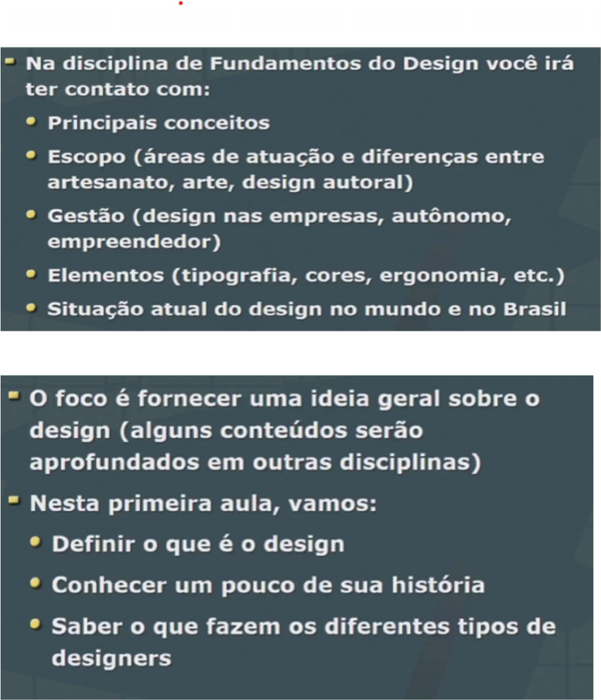FUNDAMENTOS DO DESIGN TEMA 1: O QUE É DESIGN? Uma ideia geral do design, diferentes pos de design que se tem, obter uma visão geral do design. Escopo é até o onde o design vai, o seu limite Sobre a origem, design é uma palavra inglesa que vem do la m Designare, que forma outras duas: desenhar e designar. É interessante que o designer representa conceitos por meio de códigos de expressão visual (desenhar) e conjuga processos capazes de dar forma a estruturas e relações (designar). Hsuan-na (2018) define design como “uma a vidade profissional que envolve toda criação e desenvolvimento de produtos com fim de atender as necessidades da população em favor de uma vida melhor e mais prazerosa”. Mas existem outros pos de design, como o gráfico: "a vidade intelectual, técnica e cria va relacionada não somente à produção de imagens, mas à análise, organização e métodos de apresentação de soluções visuais para problemas de comunicação". Design é o resultado, é o produto; designer é o profissional. O design tem a ver não a ver apenas “com a cereja do bolo”, com deixar ele bonito, mas também “com seus ingredientes”: que farinha você vai usar, quais ingredientes, como você vai misturar e em que ordem você vai misturar esses ingredientes, que recheios você vai colocar e por fim, como você vai enfeitar a cereja. Da mesma forma é o design, quando você vai criar um produto, você não vai pensar em apenas deixa-lo bonito, o design vai se preocupar com tudo, desde como o material que vai ser realizado o produto, qual sua função, etc. É muito mais complexo. Um conceito mais formal do design seria: O Designer não pode realizar o produto apenas baseado na sua expecta va e em seus conceitos de certo e errado, ele tem que desenvolver pensando em quem vai u liza-lo: ele tem que se preocupar em como aquela pessoa vai u lizar aquele produto para a par r dai ir aparando arestas e deixando o produto mais ergonômico para o usuário do produto. O produto tem que ser pensado para os consumidores. TEMA 2: Breve História do Design O design, como o conhecemos, surgiu na revolução industrial (metade do século 19). Mas, para entender melhor sua história, é preciso "recuar" no tempo. No renascimento (sec. 14), o ar sta era visto como intelectual e o artesão era desprezado. Porém, esta ideia foi cri cada mais tarde pela arte moderna. Nesta época surgiu o movimento arts and cra s (artes e o cios), que enfa zava o trabalho artesanal frente a mecanização e produção em massa que a revolução industrial trouxe. Mais tarde, surge outro movimento, a art nouveau (arte nova), que se caracterizava pelas formas orgânicas, femininas e cheias de detalhes, que, apesar de valorizar os trabalhos manuais, se u lizava da indústria ao fazer uso dos novos materiais que a revolução industrial trouxe (ferro, vidro e cimento). Anos depois (1919), surge a Escola Bauhaus, com o pensamento de que forma ar s ca deveria se originar na solução de algum problema (a funcionalidade), fortalecendo a relação entre arte e indústria. TEMA 3: Design de produtos e design de interiores Design de produto é a especialidade que se preocupa em conceber, elaborar, desenvolver e fabricar um produto de configuração sica geralmente tridimensional (Gomes Filho, 2006). Ele se subdivide em várias áreas: produtos de uso (veículos, utensílios domés cos, eletrônicos, joias, embalagens); máquinas e equipamentos em geral; produtos de componentes de ambiente em geral (aqueles que compõem postos de trabalhos, de a vidades); ar gos do lar (cor nas, tapetes, roupas de cama). Já design de interiores (ambientes) é a “especialidade ou área de atuação que envolve a concepção de ambientes: planejamento, organização, decoração e especificação de produtos (móveis, equipamentos, obras de arte e objetos em geral)" (Gomes Filho, 2006, p. 21), ou seja, preocupa-se com a distribuição de elementos em espaços (layout) privados ou públicos, como residências, comércios, indústrias, áreas de lazer, automóveis, navios etc. Preocupa-se com a distribuição de elementos em espaços (layout), privados ou públicos. Conseguimos dividir o design de produto em quatro grades produtos: TEMA 4: Design gráfico e design editorial Design gráfico se refere às a vidades de criação e produção de objetos de comunicação visual impressos ou virtuais. Para isso, u liza-se um suporte (papel ou espaço virtual), a pografia (o visual das letras, números, caracteres) e os elementos visuais (imagens, traços, sombras, cores). Suas principais a vidades são planejar, diagramar e ilustrar (Cardoso, 2008). Por sua vez, o design editorial é uma especialidade do Design gráfico, responsável por realizar o projeto visual de uma edição: planejamento de textos e imagens que compõem uma publicação (Anderson, 2017). Os produtos realizados por um designer editorial são publicações periódicas, como livros, revistas, jornais, agendas, cadernos, inclusive e-books (Anderson, 2017; Gomes Filho, 2006), ou seja, o designer editorial, atualmente, não trabalha apenas com o “papel”, o que levou os designers a se aprimorarem e entenderem de outras áreas e tecnologias (Gomes Filho, 2006). TEMA 5: Design de animação e de games O designer de animação é aquele que planeja e cria animações fazendo uso de técnicas tanto 2D (bidimensional) como 3D (tridimensional), além do stopmo on (sequência de fotos de algo inanimado para simular movimento), com diferentes finalidades e aplicações: cinema, televisão, publicidade, games e até para o ensino (Ma as, 2016). No cinema fará curtas e longas metragens; na TV, vinhetas e aberturas de programas; na publicidade, comercias; e, na educação, animações para cursos (MATIAS, 2016). Já o design de games é o processo de construção e elaboração de jogos que envolve uma série de decisões: qual é a história do jogo, os personagens, as regras, platafo