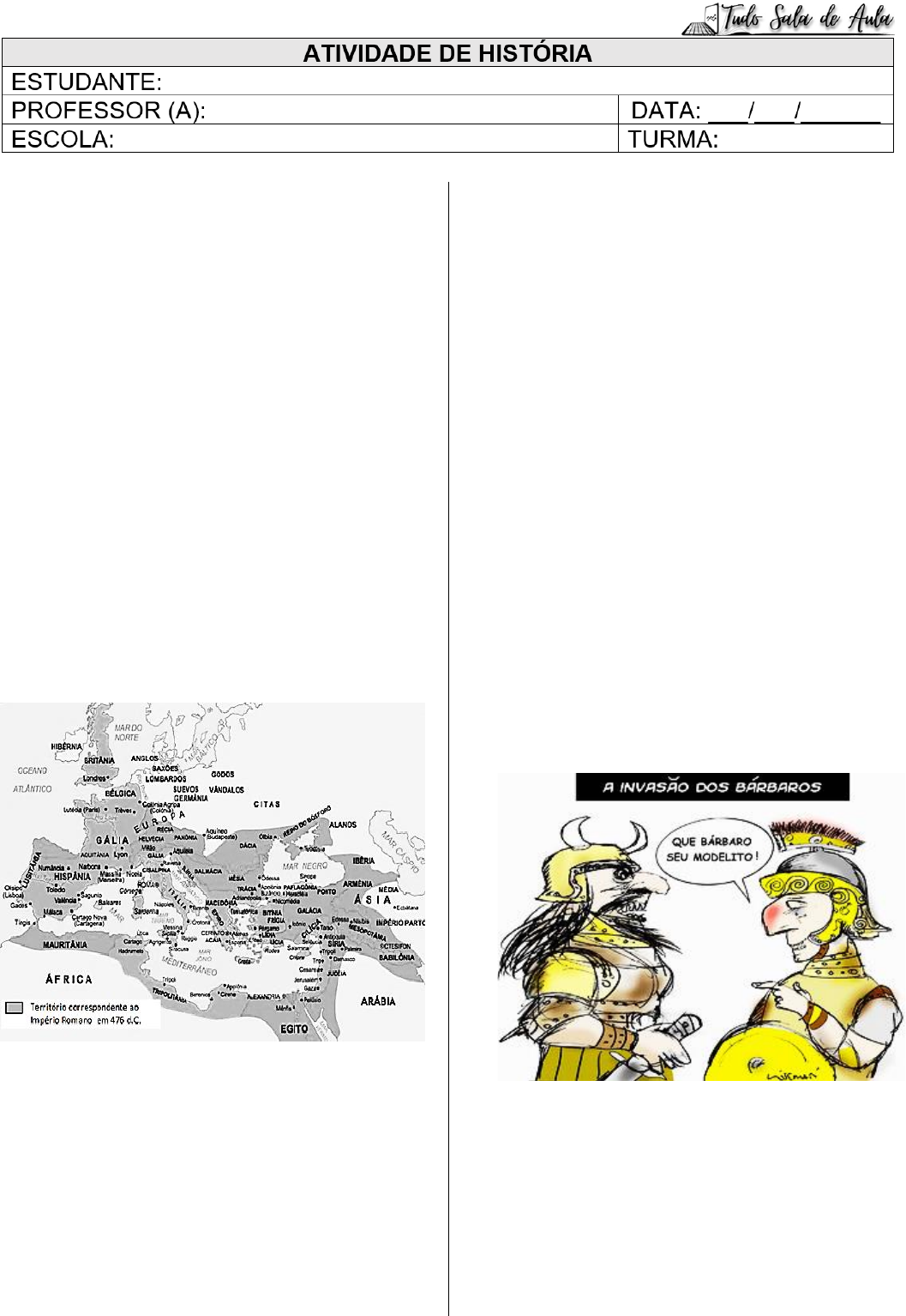 1. O grandioso Império Romano passou por um longo período de expansão e estabilidade. Por cerca de cinco séculos, ele se destacou como o maior dentre todos os impérios da história do ocidente, ganhou grandes proporções e em seu auge chegou a possuir cerca de sete milhões de metros quadrados, ocupando territórios pertencentes aos atuais hemisférios norte e sul. Esse período da história romana ficou conhecido como a) Pax Romana. b) Grande Império. c) Alta Idade Média. d) Baixa Idade Média. Observe a imagem abaixo para responder às questões 2 e 3: MAPA DOS DOMÍNIOS DO IMPÉRIO ROMANO ANTES DA QUEDA DA PARTE OCIDENTAL 2. Com base no texto e no mapa acima, assinale a alternativa correta. a) O Império Romano nunca chegou às margens do Oceano Atlântico. b) O Império Romano chegou a conquistar territórios na Ásia, África e Europa. c) O Império Romano chegou a conquistar territórios na Ásia, África e América. d) O Império Romano nunca chegou a conquistar territórios na Ásia. 3. Mesmo sabendo que a maioria dos países mudou de nome de acordo com o tempo, observe atentamente o mapa e assinale a alternativa que não corresponde a um país dominado pelo Império Romano. a) Egito. b) Bélgica. c) Itália. d) Brasil. 4. A queda do Império Romano em 476 d. C. é considerado o marco de passagem da Idade Antiga para a Idade Média. Nesse contexto, a parte ocidental passou a ser dominada pelos germânicos e a parte oriental, por sua vez, conseguiu manter uma certa unidade e continuaram a se chamar de romanos, porém este passou a ser conhecido como a) Império Sacro-Romano. b) Império Bizantino. c) Império Russo. d) Império Austro-Húngaro. 5. Observe a imagem abaixo. A charge trata de forma bem-humorada a concepção e a definição de Bárbaro, o que para os romanos seria: a) povos que não praticavam a cultura greco- romana. b) povos que não praticavam o Cristianismo. c) povos que viviam exclusivamente do comércio marítimo. d) povos que não conheciam a escrita. 6. O processo que culminou com a queda do Império Romano do Ocidente não teve somente uma motivação, dentre as quais, podem ser destacadas: a) a crise das pedras preciosas e o avanço da Revolução Industrial. b) as grandes navegações e o avanço da colonização espanhola. c) as invasões bárbaras, a crise econômica e a disputa pelo poder. d) as invasões asiáticas, a crise do café e a queda das monarquias. 7. A questão escravagista também teve um papel importantíssimo para a crise do Império, afinal, eram os escravos que sustentavam a economia romana. Quando Roma passou a diminuir as invasões das guerras, o número de escravos diminuiu também e ainda mais à medida que os povos conquistados recebiam a cidadania romana. Qual a principal origem dos escravos do Império Romano? a) Eram trazidos do Continente Africano. b) Eram em sua maioria prisioneiros de guerra. c) Eram capturados conforme a cor da pele. d) Eram exclusivamente cidadãos romanos que praticavam crimes. 8. Apesar da mudança de República para Império, Roma sob o comando de Júlio César continuou a manter algumas instituições próprias da República, como foi o caso do Senado. Alguns dos imperadores, porém, não respeitavam o poder dos senadores, gerando grande desconforto e disputas pelo poder entre políticos e militares. Essas disputas acabaram por favorecer a) o surgimento de uma nova República Romana. b) a ocorrência de Guerras Civis em todo o Império Romano. c) a queda de Júlio César e a ascensão de Ricardo César. d) o crescimento da República Romana Ocidental para a costa americana. 9. Leia as definições a seguir. DEFINIÇÃO I Divisão do território em quatro partes proposto por Diocleciano no intuito de manter o controle do território do Império Romano durante o período de crise do século III. DEFINIÇÃO II Regime de governo do período divisão que Diocleciano propôs ao Império Romano baseado nos princípios da monarquia, despotismo e militarização. Essas definições referem-se, respectivamente, a: a) Tetrarquia e Dominato. b) Dominato e Tetrarquia c) Monarquia e Império. d) Império e Monarquia. 10. Leia a tirinha abaixo. Com a análise do texto e os conhecimentos adquiridos, assinale a alternativa que corresponde a uma afirmação CORRETA. a) A queda do Império Romano do Ocidente marcou o fim da Idade Média. b) A queda do Império Romano do Ocidente marcou o início da Idade Média. c) O império Romano começou com a conversão dos Francos por Clóvis. d) O império Franco começou com a conversão dos Unos por Clóvis.