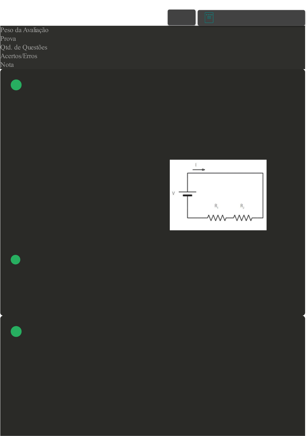 Prova Impressa GABARITO | Avaliação I - Individual (Cod.:771762) Peso da Avaliação 1,50 Prova 58458259 Qtd. de Questões 10 Acertos/Erros 8/2 Nota 8,00 A figura apresenta duas cargas resistivas ligadas em série. Sobre os passos necessários para o cálculo da queda de tensão na carga R1 e R2, quando se utiliza somente a lei de Ohm, ordene os itens a seguir: I- Encontrar o valor da corrente elétrica total. II- Calcular a resistência equivalente do circuito. III- A tensão aplicada no resistor R2 (VR2) pode ser calculada pela corrente que circula pelo circuito ou pela subtração de VR1 da tensão da fonte. IV- Usar o valor da corrente para o cálculo da queda de tensão no resistor R1 (VR1). Assinale a alternativa que apresenta a sequência CORRETA: A I - II - IV - III. B II - I - IV - III. C III - IV - I - II. D IV - I - II - III. O intercâmbio de medidas e informações técnicas, utilizando medidas de grandezas elétricas, foi padronizado mundialmente através do Sistema Internacional de Unidades (SI). Esse padrão também é adotado no Brasil. Com relação às grandezas elétricas utilizadas no estudo e aplicação da eletricidade, classifique V para as sentenças verdadeiras e F para as falsas: ( ) A corrente elétrica é a grandeza utilizada para especificar o fluxo de elétrons de um ponto para outro dentro de um circuito elétrico. ( ) A tensão elétrica é a grandeza utilizada para especificar a força eletromotriz, ou diferença de potencial, existente entre dois pontos distintos num circuito elétrico. ( ) A resistência elétrica é a grandeza utilizada para especificar a facilidade que um material oferece para viabilizar um fluxo de elétrons. Quanto mais fácil, maior a resistência. ( ) A carga elétrica é a grandeza utilizada para especificar a quantidade de elétrons que fluem por um VOLTAR A+ Alterar modo de visualização 1 2 condutor elétrico de um ponto ao outro. Assinale a alternativa que apresenta a sequência CORRETA: A F - V - V - F. B V - V - F - V. C V - V - F - F. D V - F - F - V. No estudo e utilização da eletricidade são contempladas diversas grandezas físicas. Essas grandezas possuem uma padronização mundial em suas unidades de medida, definidas conforme o Sistema Internacional (SI). Sabendo que cada grandeza elétrica possui a sua unidade de medida, analise as sentenças a seguir: I- A grandeza elétrica, chamada de corrente elétrica, tem como unidade no Sistema Internacional (SI) o ampère (A). II- A grandeza elétrica, chamada de carga elétrica, tem como unidade no Sistema Internacional (SI) o siemens (S). III- A grandeza elétrica, chamada de tensão elétrica, tem como unidade no Sistema Internacional (SI) o volt (V). IV- A grandeza elétrica, chamada de resistência elétrica, tem como unidade no Sistema Internacional (SI) o coulomb (C). Assinale a alternativa CORRETA: A As sentenças III e IV estão corretas. B As sentenças I e II estão corretas. C As sentenças I e IV estão corretas. D As sentenças I e III estão corretas. As engenharias possuem uma série de definições que ajudam a padronizar e a referenciar as grandezas e unidades, a fim de facilitar o dimensionamento e aplicação de máquinas, equipamentos e sistemas. Em termos de definições, analise as afrimativas a seguir: I- Diferença de potencial está associada à excitação que promove o deslocamento dos elétrons. II- Corrente elétrica é um termo utilizado para definir a ligação que existe entre os elétrons dentro dos condutores. III- Resistência elétrica pode ser definida como sendo um elemento que oferece dificuldade ao deslocamento ordenado de elétrons. IV- Potência elétrica pode ser calculada pelo produto da diferença de potencial em determinado componente eletroeletrônico pela corrente que circula por este componente em um determinado tempo. 3 4 Assinale a alternativa CORRETA: A As afirmativas I e III estão corretas. B As afirmativas I, III e IV estão corretas. C As afirmativas III e IV estão corretas. D As afirmativas I, II e III estão corretas. A figura anexa apresenta um esquema de ligação em que quatro cargas resistivas são ligadas entre si, alimentadas por uma fonte de tensão de 25 V. O valor das cargas são de: R1=120 ohms; R2=180 ohms; R3=220 ohms; R4=250 ohms. Com base na teoria de comportamento das grandezas elétricas em função do tipo de ligação, observe o circuito da figura e classifique V para as sentenças verdadeiras e F para as falsas: ( ) A potência dissipada pela resistência R3 é de 2,841 W ( ) A potência total dissipada pelo circuito é de 10 W. ( ) A corrente que circula pelo resistor R1 é da ordem de 208 mA. ( ) A corrente dissipada pela fonte, para atender a necessidade das cargas resistivas é da ordem de 800 mA. Assinale a alternativa que apresenta a sequência CORRETA: A V - F - V - F. B V - F - F - V. C F - V - V - F. D V - V - V - F. Um circuito monofásico de iluminação, ligado em CC, possui potência nominal de 60 W e deve operar a uma tensão de 127 V. Sendo o fator de potência desconhecido, estime a corrente nominal desse circuito e assinale a alternativa CORRETA: A 472,24 mA. B 363,63 mA. C 5 6 47,224 mA. D 529,74 mA. Resistência elétrica é o nome que se dá a componentes que oferecem dificuldade na passagem de corrente elétrica. As resistências podem ser agrupadas em série, paralelo ou de forma mista. Quando ligadas em série, o cálculo da resistência total é feito pela soma das resistências que estão ligadas em série, e a soma da queda de tensão em cada resistor é igual a tensão total aplicada ao circuito. Para um circuito que possui resistências de 100 ohms, 150 ohms e 470 ohms ligadas em série e alimentado por uma tensão de 50 V, qual será o valor da corrente elétrica, da potência total e da queda de tensão em cada resistor? A 69,44 mA; 3,472 W; 6,945 V; 10,41 V; 32,63 V. B 333,33 mA; 52,22 W; 33,34 V; 10,45 V; 6,21 V. C 500 mA; 18,0 W; 25 V; 16 V; 9 V. D 49,44 mA; 