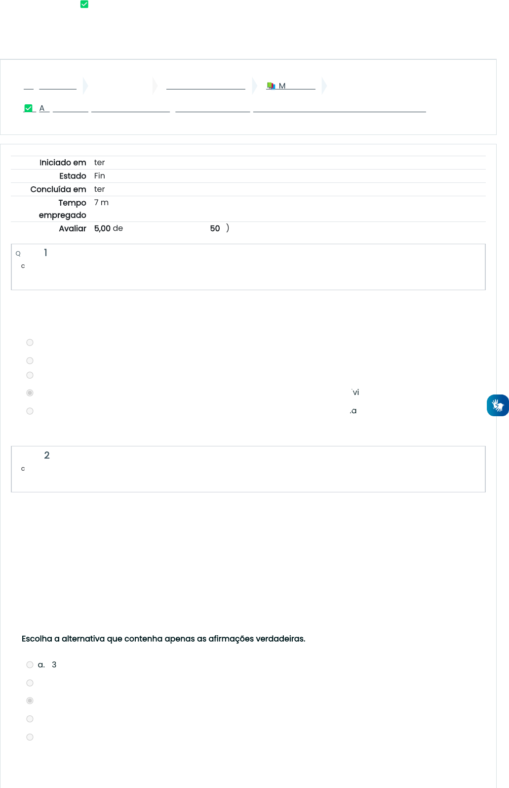 13/06/2023, 09:50 ✅ [A4] – Avaliação do Módulo 4 – Algoritmos de ordenação elementares não recursivos e recursivos: Revisão da tentativa https://ava.ufms.br/mod/quiz/review.php?attempt=670116&cmid=616917 1/5 Página inicial Meus cursos 32010001906-2023-1 📚 Módulo 4 ✅ [A4] – Avaliação do Módulo 4 – Algoritmos de ordenação elementares não recursivos e recursivos Iniciado em terça, 13 jun 2023, 09:43 Estado Finalizada Concluída em terça, 13 jun 2023, 09:51 Tempo empregado 7 minutos 6 segundos Avaliar 5,00 de um máximo de 10,00(50%) Questão 1 Incorreto Atingiu 0,00 de 1,00 Questão 2 Incorreto Atingiu 0,00 de 1,00 Em relação ao algoritmo de ordenação rápida, escolha uma afirmação que contenha uma sentença correta. a. O pivô pode ficar em qualquer posição do vetor. b. O algoritmo que escolhe o pivô do vetor sempre escolhe um pivô que fica no final do vetor. c. O algoritmo que escolhe o pivô do vetor sempre escolhe um pivô que fica no início do vetor. d. É possível que um valor escolhido como pivô não possa ser utilizado para dividir o vetor. e. O algoritmo que escolhe o pivô do vetor sempre escolhe um pivô que fica na metade do vetor. Em relação aos algoritmos de ordenação, considere as afirmações abaixo: 1. Os algoritmos de ordenação recursivos são melhores que os algoritmos de ordenação não recursivos em qualquer situação. 2. O algoritmo de ordenação por bolha utiliza da recursividade para trocar elementos sucessivos, até que o vetor esteja totalmente ordenado. 3. O algoritmo de ordenação por intercalação utiliza, além da recursividade, um método iterativo para “misturar” os subproblemas. 4. O algoritmo de ordenação rápida (quick sort) é o que ordena qualquer vetor da maneira mais rápida possível, independente do conteúdo da entrada. Escolha a alternativa que contenha apenas as afirmações verdadeiras. a. 3. b. 2 e 3. c. 1 e 3 d. 1 e 2. e. 3 e 4. https://ava.ufms.br/ https://ava.ufms.br/course/view.php?id=44592 https://ava.ufms.br/course/view.php?id=44592#section-5 https://ava.ufms.br/mod/quiz/view.php?id=616917 13/06/2023, 09:50 ✅ [A4] – Avaliação do Módulo 4 – Algoritmos de ordenação elementares não recursivos e recursivos: Revisão da tentativa https://ava.ufms.br/mod/quiz/review.php?attempt=670116&cmid=616917 2/5 Questão 3 Incorreto Atingiu 0,00 de 1,00 Questão 4 Correto Atingiu 1,00 de 1,00 Questão 5 Incorreto Atingiu 0,00 de 1,00 Dado um vetor V de inteiros que já está ordenado, os algoritmos de ordenação por bolha, por inserção e por seleção detectarão que o vetor já está ordenado e não realizarão nenhuma comparação. Escolha uma opção: Verdadeiro Falso Quando um algoritmo de ordenação é invocado para um vetor que já está ordenado, o algoritmo em questão ordenará o vetor na ordem inversa. Ou seja, se o vetor estava em ordem não decrescente, o algoritmo fará com que o vetor fique em ordem não crescente. Escolha uma opção: Verdadeiro Falso Dados valores i, j e k tais que V[i..j] e V[j+1..k] são dois subvetores válidos de um vetor V, o procedimento de intercalação dos subvetores V[i..j] e V[j+1..k] (utilizado no algoritmo de ordenação por intercalação) fará com que o vetor V[i..k] esteja ordenado. A intercalação só produzirá o resultado esperado se os vetores V[i..j] e V[j+1..k] estiverem ordenados. Escolha uma opção: Verdadeiro Falso 13/06/2023, 09:50 ✅ [A4] – Avaliação do Módulo 4 – Algoritmos de ordenação elementares não recursivos e recursivos: Revisão da tentativa https://ava.ufms.br/mod/quiz/review.php?attempt=670116&cmid=616917 3/5 Questão 6 Correto Atingiu 1,00 de 1,00 Questão 7 Correto Atingiu 1,00 de 1,00 O algoritmo abaixo apresenta um pseudocódigo da ordenação rápida. quicksort(A[0...n - 1], inicio, fim) 02. | se(inicio < fim) 03. | | q = particao(A, inicio, fim) 04. | | quicksort(A, inicio, q - 1) 05. | | quicksort(A, q + 1, fim) 06. | fim_se 07. fim_quicksort Escolha uma sentença que apresenta uma afirmação verdadeira sobre esse algoritmo. a. A variável q representa o pivô, que só pode ser a posição que fica na metade do vetor. b. O algoritmo que cria a partição não muda nenhuma posição do vetor. c. O algoritmo funciona independente da posição do vetor. Entretanto, seu desempenho pode mudar. d. O algoritmo só funciona se as duas partições tiverem pelo menos três elementos. e. Nenhuma das alternativas anteriores. O algoritmo de ordenação por bolha realiza trocas sucessivas em posições consecutivas . O algoritmo de ordenação por inserção desloca elementos até encontrar a posição final de um elemento. Já o algoritmo de ordenação por seleção descobre o menor/maior e o coloca na sua posição final a cada iteração do algoritmo. 13/06/2023, 09:50 ✅ [A4] – Avaliação do Módulo 4 – Algoritmos de ordenação elementares não recursivos e recursivos: Revisão da tentativa https://ava.ufms.br/mod/quiz/review.php?attempt=670116&cmid=616917 4/5 Questão 8 Incorreto Atingiu 0,00 de 1,00 Questão 9 Correto Atingiu 1,00 de 1,00 O pseudocódigo abaixo apresenta o algoritmo de ordenação por intercalação. Esse algoritmo recebe um vetor V de valores inteiros e o coloca em ordem não decrescente. mergesort(V, esq, dir) se esq < dir então centro = piso((esq+dir)/2) mergesort(V, esq, centro) mergesort(V, centro+1, dir) intercalar(V, esq, centro+1, dir) O algoritmo intercalará os vetores V[esq..centro] e V[centro+1,dir] de tal maneira a fazer com que o vetor V[esq..dir] esteja ordenado. Esse algoritmo só funcionará corretamente se, a cada divisão do vetor V pela metade, o tamanho dos subvetores gerados for exatamente igual. Escolha uma opção: Verdadeiro Falso O método de ordenação por seleção tem como objetivo selecionar o menor elemento do vetor e colocá-lo na primeira posição do vetor. Uma vez encontrado o menor elemento, o algoritmo agora buscará o segundo menor el
