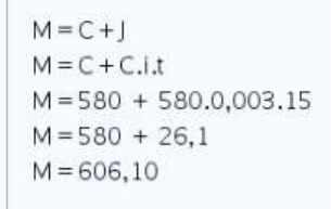 Juros Simples 1. A conta de água de um condomínio deve ser paga até o quinto dia útil de cada mês. Para pagamentos após o vencimento, é cobrado juros de 0,3% por dia de atraso. Se a conta de um morador for de R$580,00 e ele pagar essa conta com 15 dias de atraso, qual será o valor pago? Dados C = 580 i = 0,3% = 0,003 t = 15 Objetivo Determinar o total a ser pago pela conta atrasada, considerando os juros. Conclusão: O morador terá que pagar R$ 606,10 pela conta de água.