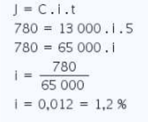 Juros Simples 1. Uma dívida de R$13 000,00 foi paga 5 meses após contraída e os juros pagos foram de R$ 780,00. Sabendo que o cálculo foi feito usando juros simples, qual foi a taxa de juros? Dados J = 780 C = 13 000 t = 5 meses Objetivo Determinar a taxa aplicada. Resolução Conclusão A taxa de juros é de 1,2% ao mês.