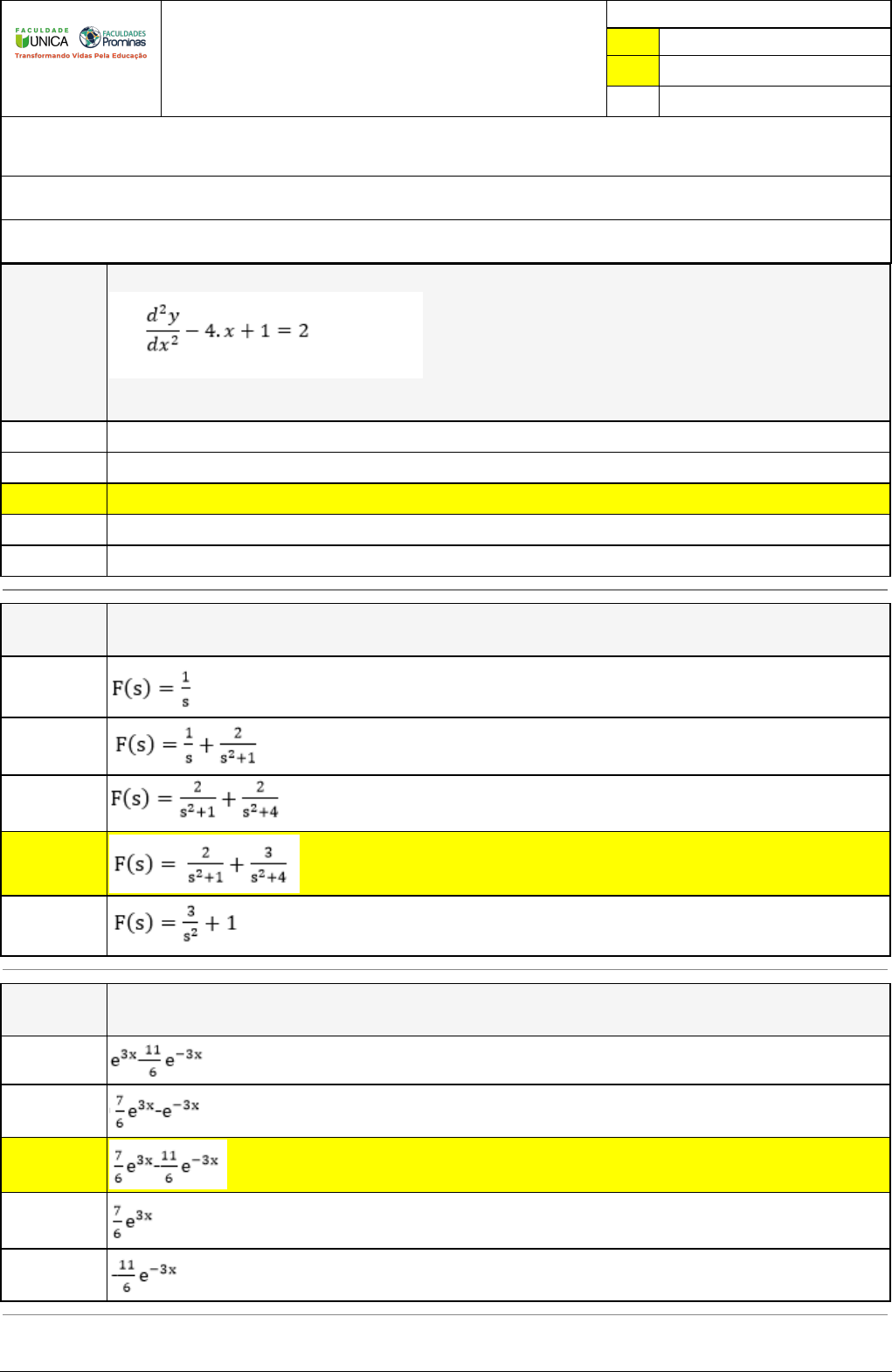 Pincel Atômico - 05/07/2023 11:21:36 1/3 ILSE TERESINHA BAUMGARTNER Exercício Caminho do Conhecimento - Etapa 12 (19357) Atividade finalizada em 05/07/2023 11:20:51 (1061387 / 1) LEGENDA Resposta correta na questão # Resposta correta - Questão Anulada X Resposta selecionada pelo Aluno Disciplina: PRÁTICA PEDAGÓGICA INTERDISCIPLINAR: EQUAÇÕES DIFERENCIAIS ORDINÁRIAS [829238] - Avaliação com 8 questões, com o peso total de 3,33 pontos [capítulos - 6] Turma: Segunda Graduação: Segunda Graduação 6 meses - Licenciatura em Matemática - Grupo: FPD-FEV2022 - SGegu0A160323 [86994] Aluno(a): 91444278 - ILSE TERESINHA BAUMGARTNER - Respondeu 8 questões corretas, obtendo um total de 3,33 pontos como nota [360347_110808] Questão 001 Analise a expressão dada abaixo: Representa uma equação diferencial de ordem n. equação transcendental de primeira ordem. X equação diferencial de segunda ordem. equação linear de primeira ordem. equação diferencial de primeira ordem. [360347_174163] Questão 002 A transformada de Laplace da função: f(x)=2senx+3 cosâ•¡2x é: X [360347_174155] Questão 003 A solução particular da equação y'' - 9y=0, para y (0)=3 e y' (0)= -2. X Pincel Atômico - 05/07/2023 11:21:36 2/3 [360348_110819] Questão 004 Analise a equação abaixo: A solução geral para e equação é X [360347_174159] Questão 005 Determinar o valor de α de acordo com a condição dada: 2y''-2y'+4y=0 e uma raiz da equação característica é -3. X (-2)/3 1/2 (-1)/3 2 -4 [360348_110821] Questão 006 Analise a expressão abaixo: y(x)=A.sen(x) A expressão dada pode ser um conjunto solução de qual equação diferencial indicada abaixo? X [360347_174169] Questão 007 As raízes da equação característica (2α+2) y''+(4 - 4α) y'-(α - 2)y=0 e K1+K2=2 , K1.K2=1; X -1 e 1 0 e 2 Pincel Atômico - 05/07/2023 11:21:36 3/3 2 e 6 -1 e -2 3 e 4 [360347_110810] Questão 008 Analise a expressão abaixo: De acordo com a expressão dada, avalie as afirmativas abaixo: I. A expressão dada representa uma equação diferencial de segunda ordem. II. O conjunto das soluções para a expressão representada pode ser dado por y(x)=A.sen(xt)+B.cosâ•¡(xt), onde A e B são constantes quaisquer. III. Obter uma única solução para a expressão dada é o mesmo que obter todo o conjunto de soluções. É correto o que se afirma em II, apenas. I e III, apenas. I e II, apenas. III, apenas. X I, apenas.