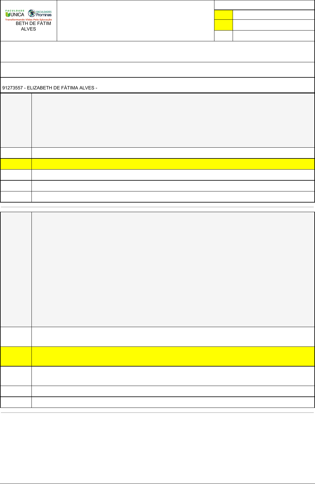 Pincel Atômico - 01/08/2023 11:18:04 1/2 ELIZABETH DE FÁTIMA ALVES Avaliação Online (SALA EAD) Atividade finalizada em 15/09/2022 19:25:21 (471514 / 1) LEGENDA Resposta correta na questão # Resposta correta - Questão Anulada X Resposta selecionada pelo Aluno Disciplina: TEORIA E PRÁTICA DE ENSINO: SUPERDOTAÇÃO E ALTAS HABILIDADES [421688] - Avaliação com 5 questões, com o peso total de 15,00 pontos [capítulos - 1,2,3] Turma: Segunda Graduação: Educação Especial p/ Licenciados - Grupo: JANEIRO/2022 - SEGEDES-LIC [63468] Aluno(a): 91273557 - ELIZABETH DE FÁTIMA ALVES - Respondeu 5 questões corretas, obtendo um total de 15,00 pontos como nota [361004_1730 84] Questão 001 Existiram movimentos educacionais revolucionários para o Brasil e para os demais países do mundo, entretanto, se estes movimentos se originaram na Europa ou nos Estados Unidos por exemplo, demoravam anos ou até décadas para que seus efeitos fossem observados por aqui. Existe um grande movimento divisor de águas e que favoreceu a compreensão das dificuldades de aprendizagem em sala de aula. Assinale a alternativa CORRETA que apresenta este movimento. A promulgação da BNCC em 2017. X O movimento dos pioneiros da Escola Nova em 1932. O final da ditadura militar em 1985. A promulgação da Constituição Federal em 1988. A promulgação da LDB em 1996. [361004_1737 95] Questão 002 Leia atentamente o trecho a seguir, extraído do E-book da Unidade 1: (...) comumente estes alunos permanecem “invisíveis” no contexto educacional, pois não são reconhecidos ou, mesmo sendo informalmente identificados, não recebem, muitas vezes, o acompanhamento educacional necessário para o avanço em suas potencialidades (RECH et al., 2017, p. 7877) Fonte: RECH, Andréia; BULHÕES, Priscila; PEREIRA, Cássia. Altas habilidades/superdotação e a inclusão: o potencial da pesquisa na desconstrução de mitos. XIII EDUCERE – Congresso Nacional de Educação, 2017. Disponível em: https://educere.bruc.com.br/arquivo/pdf2017/26101_13456.pdf. Acesso em: 07/janeiro/2022. Na linha histórica do tempo traçada na unidade inicial desta disciplina verificamos poucas menções às pessoas AH/SD, podemos afirmar que em termos documentais, a sociedade começa a pensar essas pessoas: Em 1932, no Manifesto dos Pioneiros da Escola Nova, Movimentos dos Escola Novistas. X Em 1924 em documento do autor Ulisses Pernambuco, distinguindo as “crianças supernormais” das “precoces”. Em 1938 quando foi instituída a Sociedade Pestalozzi, criada exclusivamente para atendimento de crianças com AH/SD. Em 1996 na Lei de Diretrizes e Bases da Educação Nacional. Em 1988, na Constituição Federal, no artigo 205. Pincel Atômico - 01/08/2023 11:18:04 2/2 [361004_1738 09] Questão 003 A respeito do comportamento do aluno AH/SD, analise com critério as asserções a seguir e a relação que se estabelece entre elas: I - Quando imaginamos um aluno AH/SD, frequentemente, remetemos a ideia de bom comportamento, porém, esta pré-concepção não mostra-se verdadeira PORQUE II – Como o aluno consegue finalizar as tarefas com maior facilidade acaba tornando- se impaciente, agitado e pouco propenso a respeitar regras de convivência e autoridade na escola. A respeito das frases acima, assinale a alternativa CORRETA: Ambas estão corretas, porém não há relação entre elas. I está correta e II está incorreta. X Ambas estão corretas e II justifica corretamente I. Ambas estão erradas. I está incorreta e II está correta. [361004_1730 87] Questão 004 A este respeito da Educação Especial, podemos afirmar que: I – Trata-se de uma modalidade de ensino assim como a Educação de Jovens e Adultos e Educação Profissional. II – Trata-se de um nível de ensino, assim como a Educação Básica e o Ensino Superior. III – Configura-se como uma modalidade transversal, ou seja, que perpassa as demais modalidades e níveis da Educação Básica. Está correto o que se afirma em: I, II e III. Apenas I e II. Apenas II e III. X Apenas I e III. Apenas II. [361006_1731 05] Questão 005 Existem algumas autoras importantes na área de AH/SD, dentre elas Mettrau e Virgolim. Esta última esclarece por que devemos optar em chamar esta população de alunos com altas habilidades, em detrimento da expressão superdotação. Sobre esta temática, está CORRETO falarmos em altas habilidades, pois (Assinale a alternativa CORRETA). O aluno com Altas habilidades é um mini gênio. Esta ideia remente a concepção de um ser humano perfeito. Altas habilidades diz respeito a um aluno com habilidades elevadas em todas as áreas do saber e do fazer. O aluno com Altas habilidades é predestinado ao sucesso acadêmico e profissional, em consequência de sua inteligência. X A concepção de altas habilidades remete a presença de uma ou mais habilidades elevadas ou acima da média populacional.
