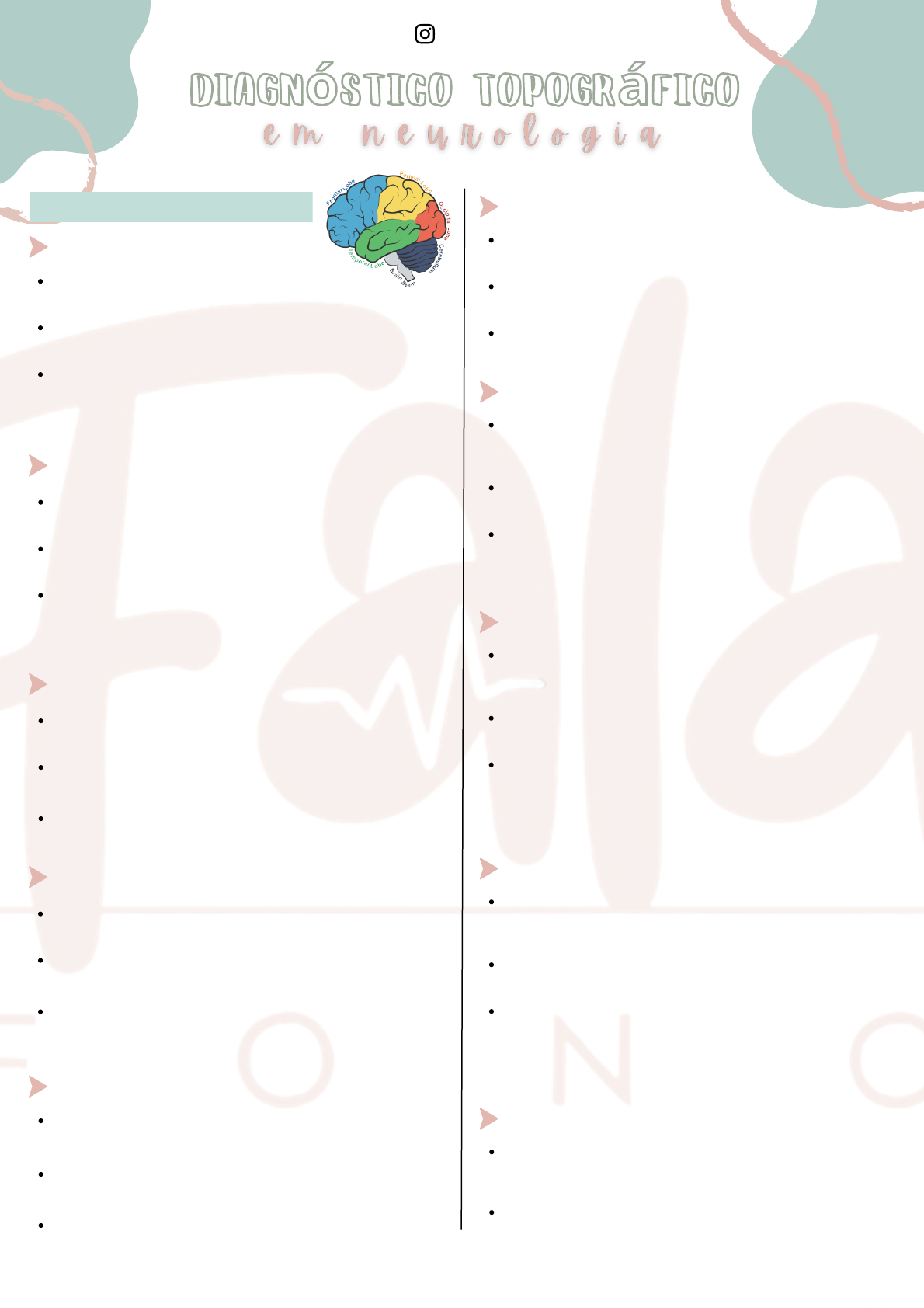 diagnóstico topográficodiagnóstico topográfico Lobo Frontal falafon0 localização neurologica Lobo Temporal Lobo Occiptal Tálamo Cápsula Interna Funções: Lesões comuns: Lesões: Cognição, personalidade, fala, capacidade de raciocínio. AVE, TCE e tumores. Transtornos cognitivos (demência), desvio do olhar para o lado da lesão, abulia (lentidão de resposta), afasia não-fluente, hemiparesia, crises convulsivas parciais. 01 Funções: Lesões comuns: Lesões: Memória e emoções. Tumores e traumatismos. Distúrbios de memória, hemianopsia homônima, afasia (quando do hemisfério dominante), crises parciais ou complexas. Funções: Lesões comuns: Lesões: Visão. AVE, TCE e tumores. Hemianopsia homônima ou cegueira. Funções: Lesões comuns: Lesões: Integração de funções sensitivas. AVE. Disestesia e dor do lado oposto, desvio do olhar, geralmente para o lado da lesão. Funções: Lesões comuns: Lesões: Via para sistemas motores e sensitivos. AVE. Hemiparesia contralateral e déficits hemissensitivos. Cerebelo Funções: Lesões comuns: Lesões: Equilíbrio e coordenação. AVE e tumores. Ataxia, dismetria e incoordenação. Mesencéfalo Funções: Lesões comuns: Lesões: Integração dos movimentos oculares verticais, funções sensitivas e motoras. AVE. Midríase, paralisia, oftalmoplegia com hemiparesia contralateral, tremor ou ataxia, paresia do olhar para cima. Ponte Funções: Lesões comuns: Lesões: Funções vitais (respiração, consciência, cardiovascular) motricidade, sensibilidade e abdução ocular. AVE e EM. Hemiplegia ou tetraplegia, pupilas puntiformes, paralisia do olhar horizontal, oftalmoplegia, coma ou estado de "encarceramento", nistagmo com abalos ascendentes é comum. Bulbo (medula oblonga) Funções: Lesões comuns: Lesões: Deglutição, funções cardíacas, equilíbrio, movimentos da língua, funções motora e sensitiva. AVE e siringe. Síndrome bulbar lateral ou de Wallenberg (sínd. sensitiva cruzada: dormência de um lado da face e do lado oposto do corpo), disfonia, disfagia, sínd. bulbar medial (desvio ips. da língua e hemiparesia contralateral). Medula espinhal cervical Funções: Lesões comuns: Funções motora e sensitiva de extremidades. Espondilose (doença degenerativa articular cervical), EM e TRM. 02 Lesões: Tetraparesia ou paraparesia, espasticidade de extremidades com Babinski (+), nível sensitivo na área cervical, retenção urinária, perda do sentido posicional. Medula espinhal torácica Funções: Lesões comuns: Lesões: Motoras e sensitiva MMII, vesical. Metástase em osso ou tumor intradural (meningioma, neurofibroma), acidente vascular e hérnia de disco são raros. Paraparesia espástica ou paraplegia com Babinski (+), nível sensitivo torácico, retenção urinária, perda do sentido posicional nos ´pés (exceto sínd. da art. espinal ant, onde coluna post. é poupada). Medula espinhal torácica Funções: Lesões comuns: Lesões: Motoras e sensitiva MMII, vesical. Metástase em osso ou tumor intradural (meningioma, neurofibroma), acidente vascular e hérnia de disco são raros. Paraparesia espástica ou paraplegia com Babinski (+), nível sensitivo torácico, retenção urinária, perda do sentido posicional nos ´pés (exceto sínd. da art. espinal ant, onde coluna post. é poupada). Cone medular Funções: Lesões comuns: Lesões: Vesical e intestinal. Tumores em L1. Anestesia em sela, disfunção vesical e intestinal, dor tardia em MMII. Cauda Equina Funções: Lesões comuns: Lesões: Motora e sensitiva nas pernas, função vesical e intestinal. Geralmente hérnias de disco lombares ou câncer meníngeo. Dor e fraqueza esparsa MMII, diminuição dos reflexos patelar e/ou aquiliano, disfunção vesical e intestinal. Corno Anterior Funções: Lesões comuns: Lesões: Motora e em músculos individuais . Doença do neurônio motor (ex: ELA). Fraqueza, flacidez, fasciculações e atrofia na distribuição da unidade motora, arreflexia. Raízes nervosas Funções: Lesões comuns: Lesões: Sensitiva e motora em músculos individuais . Hérnia de disco. Dor e parestesia em dermátomo e fraqueza em miótomo.