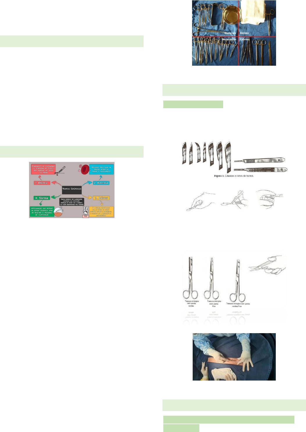 Fios e Suturas INTRODUÇÃO Base para procedimento cirúrgico de sucesso. Escolha ou realização de procedimentos com material inadequado pode causar problemas trans/pós- operatórios. Particularidades da espécie devem ser levadas em consideração. Barato pode sair caro. TEMPOS CIRÚRGICOS Diérese: cada tipo de cirurgia vai ter o seu tipo de diérese, por exemplo, a quantidade de tecidos que vou ter que passar para acessar a cavidade abdominal é bem maior do que eu ter que passar para fazer uma cirurgia por exemplo de desmotomia. Hemostasia: não necessariamente vou precisar fazer todas as vezes, por exemplo se fiz garrote a quantidade de sangue que pode me atrapalhar nessa região é mínima. Exérese: cirurgia propriamente dita. Exemplo: laparotomia exploratória, abre a cavidade para achar o problema, diagnostico e resolvo o problema. Síntese: fechar o que foi aberto. Pode ser também que não precise fazer. Separação e escolha dos materiais será baseado nestes tempos. DIÉRESE Dividir, cortar, separar. Rompimento da continuidade dos tecidos. Mecânica x Física. Tipos de lâminas de bisturi para cada tipo de diérese que vou fazer, ou seja, para cada tipo de situação tem uma lâmina mais adequada. HEMOSTASIA Processo pelo qual se previne, detém ou impede o sangramento. Pode ser realizado de várias maneiras: Pinçamento de vasos Ligadura de vasos Compressão Eletrocoagulação EXÉRESE Momento da cirurgia em que o procedimento é efetivamente realizado. O objetivo é sempre retorno o tecido ou o órgão ao fisiológico, se precisa fazer cirurgia é porque não está normal e se eu não ajeitar o animal vai ficar ruim e vai vir a óbito seja rápido ou ao longo do tempo. Material para exérese tem e não tem (depende da cirurgia), por exemplo em uma cirurgia de cólica o material é a mão e a força. SÍNTESE Coaptação de bordos de uma lesão. Escolha do material afeta diretamente resultado. Tipo de sutura e material variam com afecção. FIO DE SUTURA IDEAL Ser absorvível e resistente à tensão em tempo uniforme. Se não absorvível, se encapsular sem reação inflamatória. Ser corado. Fácil manuseio e boa flexibilidade. Não alérgico, não tóxico, não corrosivo e não carcinogênico. Não favorecer o desenvolvimento de infecção e/ou fístulas. Possibilitar a realização de nós seguros. Causar mínima fricção e trauma ao penetrar nos tecidos Não ter atrito e ter elasticidade. Não ser capilar, nem eletrolítico. Ser barato e disponível. Fácil de esterilizar e re-esterilizar. Não ser ferromagnético. FIO DE SUTURA O fio ideal não existe! :’( Próximo do ideal. Baseado no procedimento. CLASSIFICAÇÃO DOS FIOS Intestino não sutura com fio absorvível multifilamentar (melhor não fazer do que usar esse fio), o certo é absorvível monofilamentar sintético (sintético causa menos reação). Materiais orgânicos absorvíveis: intestino cirúrgico (categute cromado), colágeno. Materiais sintéticos absorvíveis: ácido poliglicólico, poliglactina 910, polidioxanona, poligliconato, poliglecaprone 25. Materiais orgânicos não-absorvíveis: algodão, linho e outras fibras vegetais (usados no passado), seda (usada atualmente). Materiais sintéticos não-absorvíveis: poliamida, polibutéster, poliéster, polietileno, polipropileno, caprolactama Fio de sutura metálico: aço inoxidável. CLASSIFICAÇÃO DOS FIOS – PRINCÍPIOS GERAIS Força do tecido: Uma sutura deve ser pelo menos tão forte quanto o tecido através do qual ela passa . A capacidade do tecido em segurar as suturas sem se romper depende de sua força (teor de colágeno) e da orientação das fibrilas de colágeno. A pele e as fáscias são os mais fortes, os músculos são relativamente fracos e a gordura é a mais fraca. Em geral, os tecidos viscerais se situam entre a gordura e os músculos quanto à força. A força do órgão varia dentro do mesmo órgão e também com a idade e o tamanho do animal Força tênsil do nó: A força tênsil do nó é medida pela força (em quilogramas) que o fio de sutura consegue suportar antes de se romper quando ligado com nó. Os fios de sutura devem ser tão fortes quanto o tecido através do qual estão sendo aplicados. A força não deve exceder em muito a do tecido. Tamanho do fio de sutura: Deve-se usar o fio de menor diâmetro que segure adequadamente o tecido ferido, minimizando o traumatismo à medida que o fio de sutura passa através do tecido e diminuindo a quantidade de material estranho no ferimento. Um fio de sutura não precisa ser mais forte que o tecido suturado . A escolha do tamanho do fio de sutura se baseia na força tênsil do tecido, bem como na do material de sutura. O uso do menor tamanho possível de sutura para o fechamento de um ferimento resulta em menor traumatismo tecidual, permite que se dê nós menores e força o cirurgião a manipular mais cuidadosamente as suturas e o tecido. As suturas muito grandes podem na verdade enfraquecer o ferimento por meio de uma reação e um estrangulamento tecidual excessivo. Flexibilidade: A flexibilidade de um fio de sutura é determinada por sua rigidez e seu diâmetro em torção, que influenciam sua manipulação e seu uso. Fios flexíveis são indicados para ligar vasos ou realizar padrões contínuos de sutura. Não se pode usar fios de sutura menos flexíveis (por exemplo, de aço) para ligar vasos pequenos. O náilon e o categute cirúrgico são relativamente rígidos em comparação ao fio de seda; os fios de poliéster trançados têm rigidez intermediária. Capilaridade: A capilaridade é o processo pelo qual fluidos e bactérias são transportados para o interior dos interstícios das fibras multifilamentares. Como neutrófilos e macrófagos são muito grandes para entrarem nos interstícios das fibras, bactérias ficam aí abrigadas, criando uma barreira eficiente para a fagocitose, persistindo assim a infecção (particularmente em fios de sutura não-absorvíveis). Tod