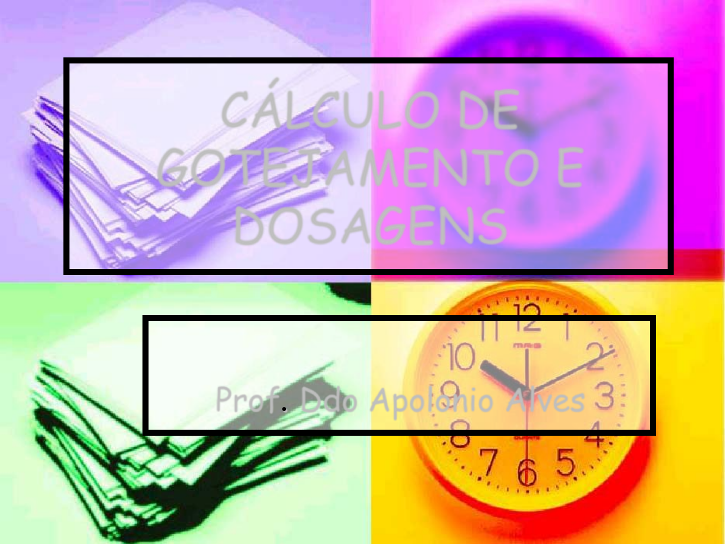 Prof. Ddo Apolonio Alves CÁLCULO DE GOTEJAMENTO E DOSAGENS Considerações Iniciais Para a administração de medicamentos com segurança e de maneira exata para os clientes, o Enfermeiro deve ter a compreensão da farmacocinética, crescimento e desenvolvimento, anatomia, nutrição e matemática. (Potter e Perry,2004) Considerações Iniciais Responsabilidade de abertura do horário da Prescrição do cliente; Exigir Prescrição legível; Conhecer dosagem e vias de administração de medicamentos; O uso dos 10 certos: cliente, droga, via, dose, hora, documentação, ação, forma e resposta. (Validade) 1. Em primeiro lugar devemos realizar a conferência da prescrição. E avaliar o paciente para nos certificarmos que a prescrição está apropriada ao seu estado geral, idade, entre outros. 2. Após a conferência da prescrição devemos confeccionar o rótulo do soro ou do medicamento de acordo com a prescrição. No rótulo devemos colocar o gotejamento. Neste caso, um soro de 500ml está prescrito em 8 horas. Como calcular o número de gotas por minuto? Fórmula para cálculo de gotejamento de soro: Nº de gotas/minuto = ___VT___ = 500__ = 500/24 = 21gts Tx 3 8X3 3. Após o preparo do rótulo, deve-se selecionar e organizar o material Para preparo do soro. Além disso, vale observar o acesso venoso do paciente. De nada adianta ter um soro preparado para instalar em um acesso obstruído, ou local com início de flebite, entre outras. Nestes casos se fará necessária nova punção. 4. Devemos fazer a assepsia com álcool 70% nas ampolas de eletrólitos a serem acrescentados. 5. Quebrar a ampola após assepsia. 6. Aspirar a medicação sem contaminar, ou seja, sem esbarrar a agulha em outros locais que não o próprio medicamento. 7. Adicionar os eletrólitos prescritos. 8. Adaptar o equipo de soro 9. Identificar o frasco de soro com o rótulo. Anote a data, hora de inicio da infusão e o nome de quem preparou. Ao colar o rótulo no Frasco, lembre-se que ao pendurar o mesmo, este será invertido. Antes de preencher o equipo com soro devemos encher a câmara de gotejamento (copinho). Se houver ar no equipo este deve ser retirado por meio de “petelecos” que farão o ar subir, retornando à câmara de gotejamento. Controlar o gotejamento de soro após instalar o mesmo no cliente Será preciso calcular quantas gotas por minuto. Para isso utilizamos a fórmula: No de gotas/minuto= __VT___ T(h)X3 Onde: V= volume em ml T= tempo em horas Assim, teremos 1000/ 6x3 = 1000/18 =55,5= 56gts/min O soro pode estar prescrito, por exemplo, “SG5% 1000 ml de 6 em 6 horas” CÁLCULO DE GOTEJAMENTO 1 ml = 20 gts 1gt = 3 mcgts 1 medida = 10 ml Bomba de Infusão CÁLCULO DE GOTEJAMENTO Gotas/min.: Gotas min Mililitros/hora: mL h CÁLCULO DE GOTEJAMENTO Nºde gts/min= v(ml) T(h)x3 Nº gts/min= Vx20 Nº de min Nº de microgts/min = vol. em mL tempo em (h) Nº de microgts= Nº de gtsx3 CÁLCULO DE GOTEJAMENTO 20gotas para cada 1mL: Transformação de ml/h para gotas/min Número de gotas = vol. em mL tempo em (h) x 3 CÁLCULO DE GOTEJAMENTO Cálculo: Ex. Qual deverá ser o gotej. em gotas/min de uma sol. de 500mL em 24h? Resposta: 1mL---------20gts 500mL------ Y Y= 500x20gts CÁLCULO DE GOTEJAMENTO 1h----------60min 24h---------W W=24x60 Cálculo= 500x20 = 10000 = 6,9=7 gts/min de got. 24x60 1440 OU Cálculo= 500 = 500= 6,9 = 7 gts/min de got. 24x3 72 Número de gotas = vol. em mL tempo em (h) x 3 CÁLCULO DE GOTEJAMENTO Nº gts/min=V X 20 Nº de minutos EXERCÍCIO: Calcule o nº de gts/min das seguintes prescrições médicas : a)1000ml de SG a 5% EV em 24hs –nº gts/min: b)500ml de SG a 5% EV de 6/6hs –nº de gts/min: c)1000ml de SG a 5%EV de 8/8hs- nº de gts/min: d)500ml de SG a 5% EV de 12/12hs- nº de gts/min: e)SG a 5%---------300ml EV de 12/12 horas SF a 0,9%-------100ml f)SG a 5% 250ml EV em 24hs- nº microgotas/min: RESPOSTA DO EXERCÍCIO a)14gts/min; b)28gts/min; c)42gts/min; d)14gts/min; e)11gts/min; f) 10 microgts/min. CÁLCULO DE GOTEJAMENTO Regra prática: Em 24h: Sabendo que uma fase de soro corresponde a 500mL Cada fase de soro equivale a 07 gts/min, mais de 01 fase multiplica-se o número de fases por 07. Ex.: 1000mL de SF a 0,9% em 24h= 02 fases de soro = 2x7 =14 gts/min CÁLCULO DE GOTEJAMENTO Cada fase de soro equivale a 21 ml/h, mais de 01 fase multiplica-se o número de fases por 21. EX.: 3000mL de SRL em 24h = 6 fases de hdt (hidratação) = 21x6= 126ml/h CÁLCULO DE GOTEJAMENTO 1.Para perfundir 520mL de soroterapia no período de 10 às 18h, deve-se instalar um gotejamento, em mL/h, e em gotas/min, aproximadamente igual a: CÁLCULO DE GOTEJAMENTO 2. Para infundir 2500ml de soro fisiológico a 0,9%, de acordo com a prescrição médica, o enfermeiro programou a bomba de infusão para administrar 105ml/h que corresponde a quanto em gts/min? CÁLCULO DE GOTEJAMENTO 3. Em uma prescrição médica encontra-se: SG a 5% - 1500ml Nacl a 20% - 14ml na 1º e na 3º fase Kcl a 10% - 10ml na 1º e na 2º fase Para que essa prescrição seja administrada em 12 horas, em quantas gotas por minuto deve ser infundido o soro? Cálculo de Transformação de Solução. Nem sempre temos disponível a concentração da solução prescrita. Nesta situação, precisamos resolver o problema de modo que o cliente seja atendido conforme prescrito. Nestes casos tomaremos como padrão as seguintes informações: 1-Frasco de soro 500ml 2-ampola de glicose 10 ml 3-ampola de cloreto de sódio 10 ml Cálculo de Transformação de Solução Ex: Transformar SG a 5% em SG a 10%: 1º Passo: SG a 5% 100 ml de SG a 5% -------- 5 gG x = 500 x 5 = 25gG 500ml--------------------------- X 100 2º Passo: SG A 10% 100ml de SG a 10% ------ 10gG x = 500 x 10 = 50gG 500ml ---------------------------X 100 3º Passo: Dispomos de ampolas de glicose a 50% com 10ml: 100ml ----------------50gG x = 25 = 5 gG 10ml ----------------X 5 4º Passo: Concluímos que cada ampola de glicose a 50 % tem 5g de glicose. 1 ampola ------------
