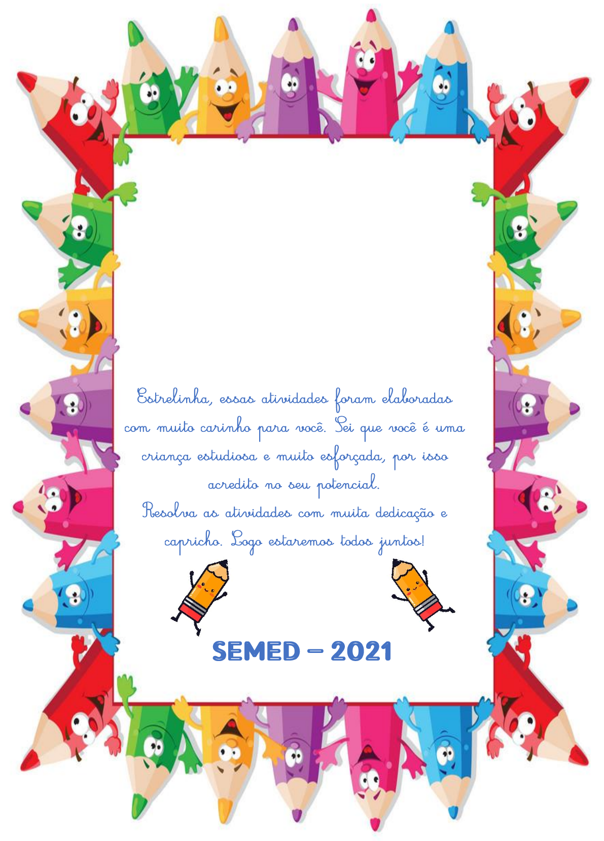 SERVIÇO PÚBLICO MUNICIPAL PREFEITURA MUNICIPAL DE CAMETÁ SECRETARIA MUNICIPAL DE EDUCAÇÃO Caderno de Atividades 01 Diagnóstico 1º Ano Fundamental Nome: _________________________________________________________ Data: ______________ Atividade de Língua Portuguesa 1ª) Escreva seu nome no quadro abaixo: 2ª) Procure e pinte no quadro abaixo, as letras que formam o seu nome: • Agora responda: a) Qual a primeira letra do seu nome? b) Quantas letras tem o seu nome? 3ª) Pinte o numeral que representa a sua idade: 4ª) Escreva o alfabeto nos quadrinhos e depois pinte as vogais: 5ª) Agora, complete com a letra vizinha: Nome: _________________________________________________________ Data: ______________ Atividade de Língua Portuguesa 1ª) Na imagem abaixo, pinte apenas as vogais e circule as consoantes: 2ª) Pinte os balões seguindo a legenda: 3ª) Escreva na linha abaixo as palavrinhas que você já sabe ler: 3ª) Observe a palavra e depois responda: PIPOCA • Qual a letra inicial? _______ • Qual a letra final? ________ • Quais são as vogais da palavra? ________ • Quais são as consoantes da palavra? ________ • Quantas letras ao todo? ______ 4ª) Escreva na linha abaixo as palavrinhas que você já sabe ler: _______________________________________________________________ 5ª) Vamos formar palavrinhas? Depois leia bem bonito: Nome: _________________________________________________________ Data: ______________ Atividade de Língua Portuguesa 1ª) Pinte a primeira e a última palavra que aparece no texto: O SAPO NÃO LAVA O PÉ NÃO LAVA PORQUE NÃO QUER ELE MORA LÁ NA LAGOA, NÃO LAVA O PÉ PORQUE NÃO QUER, MAS QUE CHULÉ! 2ª) Agora complete a cantiga com as palavrinhas faltosas: O _______ NÃO LAVA O PÉ NÃO LAVA PORQUE ______ QUER ELE MORA LÁ NA _______, NÃO LAVA O _____ PORQUE NÃO QUER, MAS QUE ______! 3ª) Pinte os troncos em que aparecem palavras com 4 letras: 4ª) Pinte as nuvenzinhas que contém as sílabas que formam o nome das imagens abaixo: BE DA FA LU MI DO FA MA BO PE LA CO 6ª) Pinte o quadro que aparece o nome das imagens: BONECA PIPOCA FOCA COPO SAPATO SOLDADO CANETA PANELA COCADA Nome: _________________________________________________________ Data: ______________ Atividade de Língua Portuguesa 1ª) Muitas histórias são conhecidas pelos nomes de seus personagens. Veja a capa do livro a seguir: a) Você conhece essa história? _______________________________________________________ b) Qual o nome do personagem? ________________________________________________________ c) Contorne com canetinha na imagem da capa do livro a primeira letra do nome do personagem: d) Agora, escreva três palavrinhas que comecem com a letra que você circulou: ____________________________________ ____________________________________ ____________________________________ 2ª) Leia a frase e circule a imagem que ela representa: 3ª) Agora, escreva outra frase com as imagens abaixo: Nome: _________________________________________________________ Data: ______________ Atividade de Matemática 1ª) Complete a sequência numérica até 30: 2ª) Agora, de acordo com a 1ª questão, responda: a) O número que vem antes do 11 é _______. b) O número que está entre o 27 e o 29 é _______. c) O último número da 1ª linha é _______. d) O 1º número da 3ª linha é ________. e) O número que vem depois do 19 é ______. f) Esta sequência vai até o número ______. 2ª) Vamos completar com os números vizinhos? a) Quem vem antes? b) Quem vem depois? c) Quem está entre? 3ª) Circule ao lado o numeral que corresponde aos conjuntos abaixo: 2 – 4 – 5 – 8 - 10 3 – 6 – 7 – 9 - 10 2 – 4 – 6 – 8 - 10 1 – 3 – 5 – 7 - 9 Nome: _________________________________________________________ Data: ______________ Atividade de Matemática 1ª) Quatro amigos foram ao parque e decidiram que os ingressos seriam comprados pelo colega mais alto do grupo: Quem comprou os ingressos? PEDRO JÚLIA LUCAS PEDRO JÚLIA LUCAS 2ª) Veja a imagem abaixo e faça o que se pede: • Pinte de verde o coelho que está em cima da mesa. • Pinte de azul o coelho que está embaixo da mesa. • Circule o coelho que está ao lado da mesa. 3ª) Observe os desenhos e complete: 4ª) Camila e Pedro levaram balões para distribuir com os colegas de classe. Observe a cena e responda: a) Quantos balões tem cada criança? _________. b) Camila segura os balões na mão: ( ) direita ( ) esquerda c) Pedro segura os balões na mão: ( ) direita ( ) esquerda d) Quantos balões ao todo? ______. Nome: _________________________________________________________ Data: ______________ Atividade de Matemática 1ª) Observe os desenhos e marque o certo: a) O pincel está: ( ) Debaixo da mesa ( ) Em cima da mesa ( ) Ao lado da mesa ( ) Longe da mesa b) A menina segura o balão com a mão: ( ) Direita ( ) Esquerda c) O que está em cima da mesa é: ( ) O gato ( ) A mochila ( ) O pincel d) O gatinho está indo em direção: ( ) À direita ( ) À esquerda e) Em que lado da mesa a menina está: ( ) Direito ( ) Esquerdo 2ª) Paulinha está vendendo algodão doce. Observe a cena e responda: a) Quantos algodões-doces tem no carrinho? b) Se Paulinha vender dois, quantos sobrarão? c) Paulinha irá fazer mais 3 algodões-doces. Quantos ficarão? 3ª) Pinte: Nome: _________________________________________________________ Data: ______________ Atividade de Matemática 1ª) Encontre e desenhe os resultados: 2ª) Pinte cada maçã de acordo com o resultado da adição: 3ª) Resolva as continhas: 4ª) Resolva as subtrações e pinte conforme a legenda: Nome: ______________________________________________ Data: _____________ Atividade de História e Geografia 1ª) Todos nós temos uma história.A sua começou no dia em que você nasceu. Agora responda, ou peça ajuda de um adulto de sua família, para responder as perguntas sobre a história de sua vida: a) Em que ano você nasceu? ________________________________________________________ b)