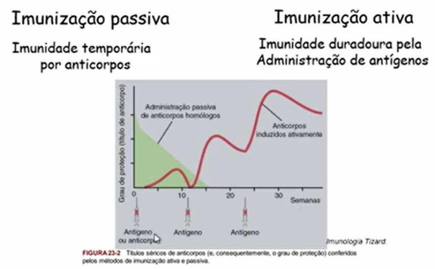 IMUNIDADE PASSIVA X ATIVA Imunização ativa: Confere uma imunidade duradoura cujo contato com os antígenos estimula a produção constante de anticorpos. É um processo lento mas gera memória (ativa células B com antígenos timo- dependentes). O contato pode ocorrer de forma natural com o agente infeccioso com ativação do sistema imune e resposta efetora. PROBLEMA: pode haver uma rápida replicação do patógeno e surgir sintomas graves antes que haja a ativação do sistema imune e a produção de anticorpos. - Vacinação: contato artificial com o agente atenuado/morto > ativação do sistema imune e resposta efetora. A vacina ideal deve gerar uma resposta forte e duradoura, ser protetora tanto pra mãe quando para o feto, sendo livre de reação adversa. Além de ser estável, de baixo custo e aceitável para a vacinação em massa, a vacina também deve induzir anticorpos neutralizantes, evitar que outras células sejam infectadas e desenvolver uma resposta T e B forte. Imunização passiva: o número de anticorpos no soro decai com o tempo. Apesar de ser uma imunidade imediata, ela é temporária e não produz memória. - Natural: o indivíduo adquire Igs prontos (placenta ou amamentação) - Artificial: transferência de anticorpos prontos de um indivíduo para outro (via endovenosa, geralmente). Essa estratégia de imunização requer que os anticorpos sejam produzidos em animais por imunização ativa para serem transferidos a outros animais. Obs.: As aves transferem as IgY séricas da galinha para a gema. Imunidade passiva natural Uma falha na transferência de anticorpos maternos para o filhote pode ser devido a intervenção humana, ao nascimento de animais fracos que pode acarretar no atraso na primeira amada (colostro, no caso), na baixa produção desse colostro e/ou aos baixos níveis de anticorpos maternos no sangue, a morte da mãe ou a uma lactação prematura. Obs.: Colostro – contém anticorpos IgG que, ao ser ingerido pelo bezerro caem na circulação sanguínea, conferindo uma proteção temporária ao animal. Com o tempo a concentração de anticorpos maternos decai no bezerro. Essa transferência passiva natural é importante pois, em vacas, a placenta cotiledonária não permite que os anticorpos atravessem. Para a COVID-19 estudaram o uso de soros de cavalos previamente inoculados com o vírus para a obtenção de anticorpos. Esses anticorpos seriam, então, purificados e utilizados como tratamento (soros hiperimunes) em pacientes infectados. Obs.: A degradação de Igs em espécies heterólogas é mais rápida pois ocorre uma maior ativação dos sistema imune e produção de Ig anti-anticorpo. ESTUDO DIRIGIDO 1. Diferencie a imunização passiva da imunização ativa. 2. Como ocorre a imunização ativa natural? Qual é a desvantagem desta? Cite um exemplo. 3. A imunização ativa artificial é feita através da vacinação. Descreva as características essenciais para uma vacina ideal. 4. Qual a diferença entre a imunização passiva natural e artificial? 5. Em que pode implicar um tratamento com soro hiperimune? Explique o que ocorre nessa situação. 6. A degradação de anticorpos ocorre na mesma frequência quando transferidos artificialmente entre uma mesma espécie e quando é feito entre espécies diferentes? Justifique. VACINAS Imunização ativa artificial Resposta lenta (15 dias), com geração de memória e aumento da quantidade de Igs a cada dose. Vários tipos de vacina 1) Atenuado: isolamento e cultivo do vírus em uma célula não-específica para a infecção. Dessa forma, o vírus muta para que ele possa crescer bem e se replicar nessas células não específicas. Essas mutações adquiridas o atenuam e ele passa a não se adaptar novamente as células humanas, podendo ser utilizado na vacina. Ou, o atenuamento também pode ser feito por técnicas de DNA recombinante, onde identifica- se a região do DNA que codifica o fator de virulência que causa a infecção e a retira ou introduz mutações, deixando o patógeno seguro para ser utilizado. 2) Inativado: o organismo é inativado por um tratamento químico ou por calor e é utilizado na vacina. Esse tipo de vacina é mais estável (não reverte para uma forma virulenta) e não necessita de refrigeração. No entanto, é uma vacina que necessita de estímulos (adjuvantes ou mais doses). Como um exemplo de uso da técnica de atenuação por cultura de células podemos citar o vírus da peste bovina (atenuado em cultura de células de coelho) e o vírus da cinomose canina (cultivado em células renais caninas, uma vez que apresenta preferência para a replicação em células linfoides). Obs.: Os adjuvantes são substâncias adicionadas as vacinas para que haja o aumento de sua imunogenicidade, ou seja, que ocorra uma maior probabilidade de se gerar uma resposta imune e produção de anticorpos ao particular o antígeno vacinal. Existem 3 tipos de adjuvantes, os de depósito (que provocam uma remoção mais lenta do antígeno levando a uma resposta imune mais prolongada também), os particulados (que aumentam a apresentação do antígeno) e os imunoestimuladores (estimulam os receptores TLRs). Esses 2 últimos levam ao aumento da produção de citocinas pelas APC e, consequentemente, ao aumento da resposta de células TH, acarretando no aumento da imunidade mediada por essas células, bem como no aumento da produção de anticorpos. Ex.: Al2OH3 – gera um precipitado junto ao antígeno (gera partículas do antígeno) levando a uma maior resposta e produção de anticorpos. 3) Vacinas de subunidade: são criadas a partir de antígenos purificados de patógenos (antígenos recombinantes, polissacarídeos ou epítopos imunodominantes) ou por toxinas inativadas (toxóides). Geralmente são administradas com adjuvantes para que aumente sua imunogenicidade. A presença de antígenos específicos diminuem as ocorrências de reações adversas da vacinação, porém esse tipo de vacina é 