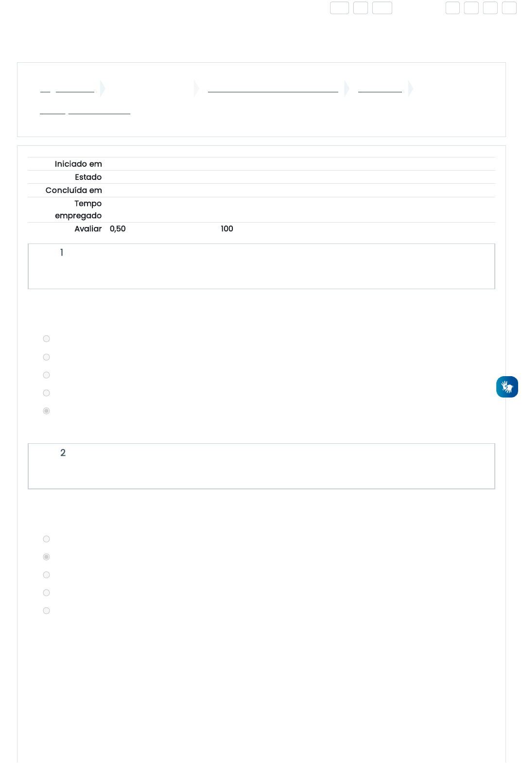 Página inicial Minhas disciplinas 2023/3 - ELETRÔNICA ANALÓGICA UNIDADE IV Avaliação - Unidade IV Iniciado em quarta, 2 ago 2023, 20:17 Estado Finalizada Concluída em quarta, 2 ago 2023, 20:22 Tempo empregado 5 minutos 14 segundos Avaliar 0,50 de um máximo de 0,50(100%) Questão 1 Completo Atingiu 0,05 de 0,05 Questão 2 Completo Atingiu 0,05 de 0,05 Quando um MOSFET-D canal n tem Id > Idss ele a. É danificado. b. Está polarizada diretamente. c. Modo amplificado. d. Opera no modo depleção. e. Opera no modo de crescimento. A maioria dos FETs de potência é usada em: a. Circuitos mistos. b. Aplicações de alta potência. c. Circuitos Integrados. d. Computadores digitais. e. Estágios de RF. Tamanho da fonte A- A A+ Cor do site R A A A https://ambienteonline.uninga.br/ https://ambienteonline.uninga.br/course/view.php?id=20870 https://ambienteonline.uninga.br/course/view.php?id=20870§ion=6 https://ambienteonline.uninga.br/mod/quiz/view.php?id=577652 Questão 3 Completo Atingiu 0,05 de 0,05 Questão 4 Completo Atingiu 0,05 de 0,05 Questão 5 Completo Atingiu 0,05 de 0,05 Quando um JFET está em corte, as camadas de depleção estão: a. Barrado. b. Se tocando. c. Bem juntas. d. Conduzindo. e. Bem afastadas. A transcondutância aumenta quando a corrente no dreno se aproxima de: a. 0 b. Id (sat) c. Iv d. Is e. Idss O canal de um JFET está entre o a. coletor – emissor. b. drain and source. c. input and output. d. gate and source. e. gate e drain. Tamanho da fonte A- A A+ Cor do site R A A A Questão 6 Completo Atingiu 0,05 de 0,05 Questão 7 Completo Atingiu 0,05 de 0,05 Questão 8 Completo Atingiu 0,05 de 0,05 Um amplificador de base comum pode ser aplicado quando: a. Todas acima. b. É preciso um ganho de tensão sem ganho de corrente. c. Existe necessidade estrita em amplificar baixas frequências . d. Há uma relação de impedância baixa para alta. e. É preciso amplificar altas frequências. Um MOSFET-D é considerado um a. Dispositivo normalmente em corte. b. Dispositivo passivo. c. Dispositivo controlado por corrente. d. Chave de alta potência. e. Dispositivo normalmente em condução. A impedância de entrada de um JFET a. Aproxima-se de 0. b. Aproxima-se do infinito. c. 0. d. Aproxima-se de 1. e. É impossível prever. Tamanho da fonte A- A A+ Cor do site R A A A Questão 9 Completo Atingiu 0,05 de 0,05 Questão 10 Completo Atingiu 0,05 de 0,05 A transcondutância indica a eficácia da tensão de entrada em controlar a. A tensão da fonte. b. O ganho de tensão. c. A corrente de saída. d. A resistência de entrada. e. A corrente no gate. Numa polarização por divisor de tensão com um transistor pnp, você deve usar: a. Terra. b. Uma fonte de alimentação negativa. c. Resistores. d. Uma fonte de alimentação positiva. e. Fonte CA. Atividade an ter io r ◄ Slides Videoaula 2 Seguir para... P ró xima atividade Conclusão da Disciplina ► Manter contato UNINGÁ https://www.uninga.br Mobile : 0800 800 5009 Obter o aplicativo para dispositivos móveis Tamanho da fonte A- A A+ Cor do site R A A A https://ambienteonline.uninga.br/mod/resource/view.php?id=577651&forceview=1 https://ambienteonline.uninga.br/mod/page/view.php?id=577653&forceview=1 https://www.uninga.br/ tel:Mobile : 0800 800 5009 https://www.facebook.com/uninga.edu.br/ https://www.youtube.com/channel/UCFfrZpSpL4DflIFl78P2TSQ https://www.instagram.com/uningaoficial/?hl=pt https://api.whatsapp.com/send?phone=44%2099825-1515 https://download.moodle.org/mobile?version=2020061502.11&lang=pt_br&iosappid=633359593&androidappid=com.moodle.moodlemobile