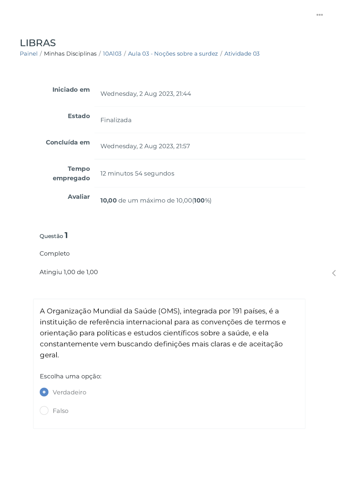Painel / Minhas Disciplinas / 10A103 / Aula 03 - Noções sobre a surdez / Atividade 03 LIBRAS Iniciado em Wednesday, 2 Aug 2023, 21:44 Estado Finalizada Concluída em Wednesday, 2 Aug 2023, 21:57 Tempo empregado 12 minutos 54 segundos Avaliar 10,00 de um máximo de 10,00(100%) Questão 1 Completo Atingiu 1,00 de 1,00 A Organização Mundial da Saúde (OMS), integrada por 191 países, é a instituição de referência internacional para as convenções de termos e orientação para políticas e estudos cientí�cos sobre a saúde, e ela constantemente vem buscando de�nições mais claras e de aceitação geral. Escolha uma opção: Verdadeiro Falso https://ava.politecnicabr.com.br/my/ https://ava.politecnicabr.com.br/course/view.php?id=830 https://ava.politecnicabr.com.br/course/view.php?id=830#section-4 https://ava.politecnicabr.com.br/mod/quiz/view.php?id=21124 https://ava.politecnicabr.com.br/ Questão 2 Completo Atingiu 1,00 de 1,00 Assinale a alternativa correta. O termo de�ciente auditivo é empregado para: Escolha uma opção: Questão 3 Completo Atingiu 1,00 de 1,00 A funcionalidade e a incapacidade são vistas como atributos pessoais, como um conjunto complexo relacionado à interação, positiva ou negativa, entre as condições próprias da pessoa, a sua participação como indivíduo e o seu meio social. Escolha uma opção: a. Os indivíduos com perda auditiva e di�culdade na fala. b. Os indivíduos que não ouvem nem falam. c. Os indivíduos com perda leve, moderada ou grave. d. Os indivíduos com perda auditiva muito grave. Verdadeiro Falso https://ava.politecnicabr.com.br/ Questão 4 Completo Atingiu 1,00 de 1,00 Faça a associação do grau de audição com o nível no audiômetro: De�ciência moderada De�ciência profunda (surdez) Audição normal De�ciência leve Questão 5 Completo Atingiu 1,00 de 1,00 Indivíduos com perda auditiva muito grave, para os quais não há benefício por meios de ampli�cação sonora. A a�rmativa acima se refere a: Escolha uma opção: 41 – 60 dB. 81 dB ou mais. 25 dB ou menos. 26 – 40 dB. a. Surdo-mudo. b. Mudo. c. De�ciente auditivo. d. Surdez. https://ava.politecnicabr.com.br/ Questão 6 Completo Atingiu 1,00 de 1,00 No caso dos conceitos de de�ciência, que inclui o de de�ciência auditiva e surdez, os problemas de compreensão e entendimento são reforçados pelo intenso debate contemporâneo baseado na luta pelos direitos humanos, que estimulam a discussão acerca de uma linguagem não discriminatória que oriente ações de governos e a re�exão social. Escolha uma opção: Questão 7 Completo Atingiu 1,00 de 1,00 A denominação de surdo é o que tem signi�cado médico correto, ao invés de surdo-mudo, pois a perda da audição refere-se exclusivamente às de�ciências do ouvido e não às cordas vocais (pregas vocais, na terminologia cientí�ca), que mantêm a sua funcionalidade. Escolha uma opção: Verdadeiro Falso Verdadeiro Falso https://ava.politecnicabr.com.br/ Questão 8 Completo Atingiu 1,00 de 1,00 O ensino da Libras, como a modalidade linguística mais adaptada às condições físicas da surdez, tornou-se fator fundamental para que se reconheça e estimule o desenvolvimento pleno das capacidades dos surdos, na escola e fora dela. Escolha uma opção: Questão 9 Completo Atingiu 1,00 de 1,00 Quando há prejuízo na transmissão do som entre o conduto auditivo do ouvido externo, o ouvido médio (tímpano, bigorna e estribo) e o ouvido interno (cóclea e nervo auditivo). A a�rmativa se refere a: Escolha uma opção: Verdadeiro Falso a. De�ciência auditiva mista. b. De�ciência auditiva condutiva. c. De�ciência auditiva neurossensorial. d. De�ciência auditiva sensorial. https://ava.politecnicabr.com.br/ © 2022 - Escola Politécnica Brasileira Questão 10 Completo Atingiu 1,00 de 1,00 A CIF (OMS, 2001) relaciona funcionalidade e incapacidade através de conceitos interativos, são eles, EXCETO: Escolha uma opção: a. Os fatores contextuais (ambientais e pessoais) que in�uenciam essas experiências (fatores contextuais). b. As atividades e as tarefas que a pessoa exerce nas diferentes áreas da sua vida (atividades e participação). c. Um conjunto complexo relacionado à interação. d. As funções e estruturas do corpo das pessoas e o seu estado de saúde. Entre em Contato https://www.politecnicabr.com.br 0800 084 2627 0800 084 2627 Links Úteis Dicas da nossa Diretora Acadêmica Planner de Estudos Declaração de Matrícula Orientações do AVA Abertura de Ticket Fale com o Tutor Cronograma de Estudos Manual de Estágio Manual de Competência Siga-nos nas redes sociais https://ava.politecnicabr.com.br/mod/quiz/0 https://www.politecnicabr.com.br/ https://soundcloud.com/user-501638417/sets/escola-politecnica-brasileira https://storage.googleapis.com/sirius-pubstore/semestre_plannerdeestudo%20poli.pdf https://storage.googleapis.com/sirius-pubstore/declaracao_matricula.pdf https://storage.googleapis.com/sirius-pubstore/orientacoes_ava.pdf https://storage.googleapis.com/sirius-pubstore/abertura_ticket.pdf https://storage.googleapis.com/sirius-pubstore/fale_com_tutor.pdf https://storage.googleapis.com/sirius-pubstore/cronograma_estudos.pdf https://storage.googleapis.com/sirius-pubstore/manual_estagio.pdf https://storage.googleapis.com/sirius-pubstore/manual_competencia.pdf https://www.facebook.com/politecnicabr https://www.instagram.com/politecnicabr_oficial https://ava.politecnicabr.com.br/ https://ava.politecnicabr.com.br/