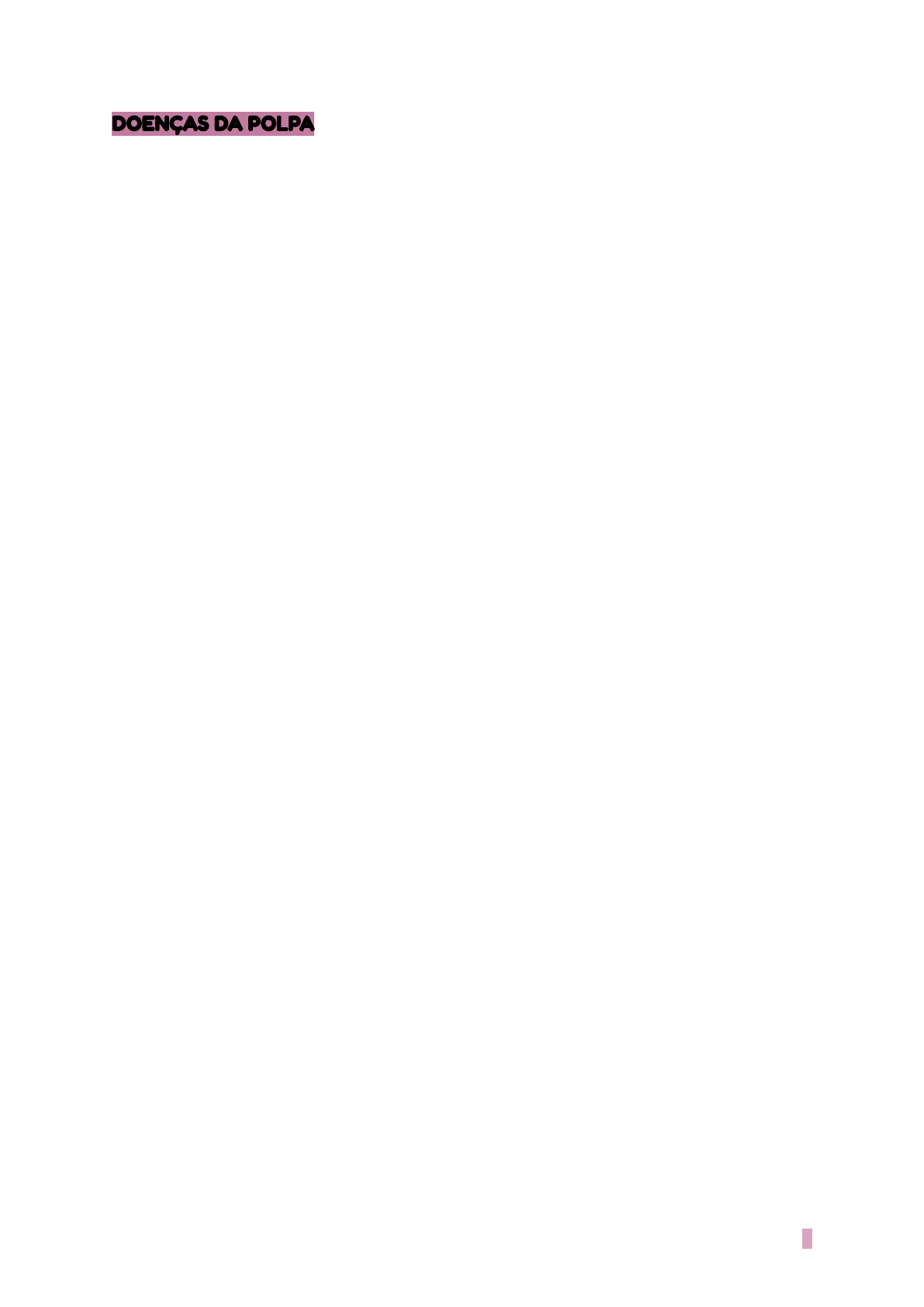 Giselly Silva UPE 108 DOENÇAS DA POLPA Patologia ● Assim como o cérebro, a polpa dental está confinada em tecido duro que pode alterar a resposta às agressões locais. A dentina circundante proporciona suporte mecânico rígido e proteção contra a cavidade oral rica em bactérias. Uma violação focal desta barreira pode afetar de modo adverso a saúde da polpa dental. As alterações vasculares inflamatórias aumentam o volume da polpa, mas o inchaço é restrito devido às paredes dentinárias circundantes, frequentemente desencadeando dor ● Se o processo inflamatório flexível não for contido, a polpa dental é exclusivamente impedida em sua resposta porque a única fonte de vascularização entra pelo forame apical (vênula e arteríola) sem um suprimento sanguíneo colateral. ● A dor relacionada à pulpite é um mecanismo de defesa importante que pode levar à intervenção terapêutica antes do desenvolvimento de complicações graves. ETIOLOGIA: ➔ Existem quatro tipos principais de estímulos nocivos que são causas comuns de inflamação pulpar (pulpite) ★ Danos mecânicos: As fontes mecânicas de lesão incluem os acidentes traumáticos, o dano iatrogênico decorrente de procedimentos dentários, atrito, abrasão e alterações barométricas. ★ Lesão térmica: Os estímulos térmicos graves podem ser transmitidos por grandes restaurações metálicas não isoladas ou podem ocorrer em procedimentos dentários como a preparação da cavidade, polimento e reações químicas exotérmicas dos materiais dentais. ★ Irritação química: O dano químico pode surgir de erosão ou do uso inadequado de materiais dentais ácidos. ★ Efeitos bacterianos: As bactérias podem danificar a polpa através de toxinas ou diretamente após a extensão das cáries ou do transporte via vasculatura. CLASSIFICADAS EM: ★ Pulpite reversível ★ Pulpite irreversível ★ Necrose pulpar 1 Giselly Silva UPE 108 CARACTERÍSTICAS CLÍNICAS: ➔ A avaliação da dor pulpar inclui uma combinação da apresentação clínica e da resposta do dente a uma série de procedimentos de teste de vitalidade ➔ O profissional deve utilizar todos os recursos disponíveis e informações clínicas com a tentativa de formular uma diagnóstico e tratamento adequado. POLPA CLINICAMENTE NORMAL: ★ Não exibe sinais ou sintomas ★ Respondem ao frio com dor branda que se resolve em um a dois segundos ★ A dor na percussão não será evidente e o exame radiológico do osso perirradicular estará nos limites normais. PULPITE REVERSÍVEL: ➔ Indica um nível de inflamação pulpar em que o tecido é capaz de voltar normalmente para um estado de saúde se os estímulos nocivos forem removidos. ★ Muito doloroso quando um estímulo (normalmente frio, doces, calor, ácido) é aplicado, mas o desconforto se resolve em poucos segundos após a eliminação do estímulo. ★ A mobilidade e a sensibilidade à percussão não ocorrem ★ Um dente fissurado ou um restauração defeituosa costuma estar presente nesse padrão de dor pulpar associado ao desconforto ao morder. PULPITE IRREVERSÍVEL: ➔ Implica um nível de inflamação mais elevado que se desenvolveu, no qual a polpa dental foi danificada além do ponto de recuperação. ★ Os pacientes geralmente têm dor aguda e grave mediante estímulo térmico e a dor continua por um período de tempo maior após a remoção do estímulo. ★ O frio é particularmente desconfortável, embora o calor ou os alimentos doces e ácidos também despertam dor. ★ A dor pode ser espontânea ou contínua e pode ser exacerbada quando o paciente deita. ★ Nos estágios iniciais de pulpite irreversível, a dor pode ser localizada facilmente no dente danificado, no entanto com o aumento do desconforto, o paciente pode ser incapaz de identificar o dente danificado dentro de um quadrante. ★ Nos estágios finais, a dor aumenta de intensidade é sentida como uma pressão pulsante que pode manter os pacientes acordados à noite. → Nesse ponto o calor aumenta a dor, e o frio pode produzir alívio NECROSE PULPAR: 2 Giselly Silva UPE 108 ➔ .O dente não responde ao teste de sensibilidade elétrica ou térmica. ★ Os dentes com polpas necróticas apresentam sintomas que variam de nenhuma dor até uma dor aguda, com ou sem sensibilidade na mordida. PULPITE HIPERPLÁSICA CRÔNICA: ➔ Padrão único de inflamação pulpar - crianças e adultos jovens- ➔ Grandes exposições da polpa nas quais o teto dentinário inteiro está ausente. ★ Molares decíduos ou sucedâneos, que têm grandes câmaras pulpares nesses grupos etários. ★ A irritação mecânica e a invasão bacteriana resultam em um nível de inflamação crônica que produz tecido de granulação hiperplásico que se projeta da camada e frequentemente preenche o defeito dentinário associado. ★ O dente é assintomático, exceto quando há uma possível sensação de pressão colocada na função mastigatória. Características Histopatológicas → Basicamente, a histopatologia é de interesse principalmente acadêmico e normalmente não afeta o tratamento de maneira significativa. Muitas investigações demonstraram uma surpreendente falta de correlação entre os achados histopatológicos e os sintomas clínicos na maioria das polpas examinadas. ★ Pulpite reversível, a polpa exibe hiperemia, edema e algumas células inflamatórias sob a áreas dos túbulos dentinários afetados. ★ Pulpite irreversível, demonstra a congestão das vênulas que resulta em necrose focal. ★ Pulpite hiperplásica, demonstra um tampão de granulação com inflamação subaguda que preenche todo o espaço da câmara pulpar e lembra histopatologicamente um granuloma piogênico. TRATAMENTO E PROGNÓSTICO: ★ A pulpite reversível é tratada pela remoção do irritante local, medicações analgésicas, com prognóstico bom se forem tomadas medidas com antecedência suficiente. ★ A pulpite hiperplásica e a crônica sã