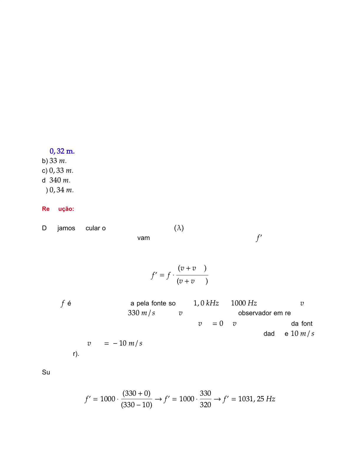 Tiago Lima - Instagram: @professor_disciplinas_exatas / WhatsAPP: (51) 991875503 Visite meu perfil e/ou meu grupo no site Passei Direto, confira mais questões ou deixe alguma no grupo para ser resolvida: Perfil - https://www.passeidireto.com/perfil/tiago-pimenta/ Grupo - https://www.passeidireto.com/grupos/109427150/publicacoes (UFJF-MG) Um trem se aproxima, apitando, a uma velocidade de 10 m/s em relação à plataforma de uma estação. A frequência sonora do apito do trem é 1,0 kHz, como medida pelo maquinista. Considerando a velocidade do som no ar como 330 m/s, podemos afirmar que um passageiro parado na plataforma ouviria o som com um comprimento de onda de: a) 0, 32 m. b) 33 m. c) 0, 33 m. d) 340 m. e) 0, 34 m. Resolução: Desejamos calcular o comprimento de onda , percebido pelo passageiro que está parado λ( ) na plataforma, porém, primeiro, vamos encontrar a frequência aparente usando a fórmula f' do efeito Doppler: f' = f ⋅ (v + v ) (v + v ) obs fonte onde: é a frequência emitida pela fonte sonora ( ou , neste caso), é a f 1, 0 kHz 1000 Hz v velocidade do som no meio ( no ar), velocidade do observador em relação ao 330 m / s vobs meio (nesse caso, o passageiro está parado, logo e é velocidade da fonte v = 0obs vfonte sonora em relação ao meio (nesse caso, o trem se aproxima com velocidade de , 10 m / s sendo assim, (o sinal negativo indica que a fonte se aproxima do v = - 10 m / sfonte observador). Substituindo os valores em 1 e resolvendo, vem; f' = 1000 ⋅ f' = 1000 ⋅ f' = 1031, 25 Hz (330 + 0) (330 - 10) → 330 320 → (1) Com o valor da frequência aparente que é percebida pelo passageiro , 1031, 25 Hz( ) podemos calcular o comprimento de onda , usando a velocidade do som no ar e a λ( ) relação: 𝜆 = v f' Substituindo e resolvendo; 𝜆 = 330 1031, 25 𝜆 = 0, 32 m (Resposta)