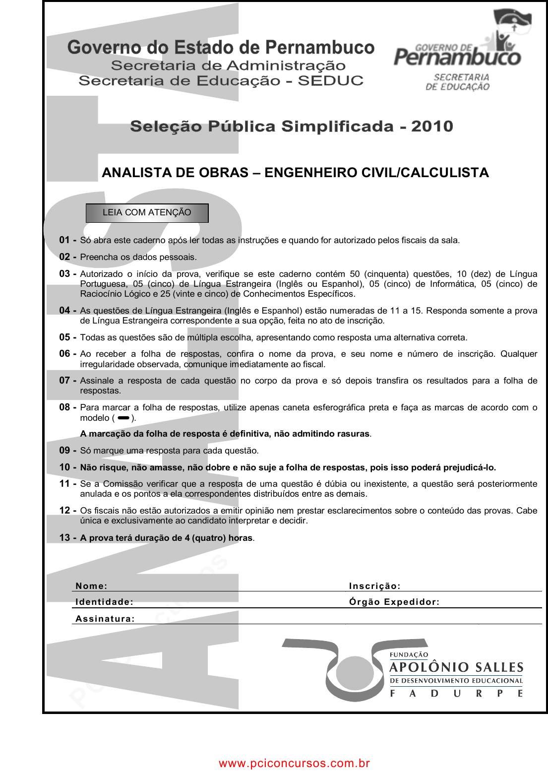 pcimarkpci MjgwNDowMTRkOjE0ODQ6ODNkZTpkYzRmOmI4NjQ6YTA2ZDoxNTFi:V2VkLCAwMiBBdWcgMjAyMyAyMjoxOTo1MyAtMDMwMA== www.pciconcursos.com.br Nome: Inscr ição: Ident idade: Órgão Expedidor: Assinatura: LEIA COM ATENÇÃO ANALISTA DE OBRAS – ENGENHEIRO CIVIL/CALCULISTA 01 - Só abra este caderno após ler todas as instruções e quando for autorizado pelos fiscais da sala. 02 - Preencha os dados pessoais. 03 - Autorizado o início da prova, verifique se este caderno contém 50 (cinquenta) questões, 10 (dez) de Língua Portuguesa, 05 (cinco) de Língua Estrangeira (Inglês ou Espanhol), 05 (cinco) de Informática, 05 (cinco) de Raciocínio Lógico e 25 (vinte e cinco) de Conhecimentos Específicos. 04 - As questões de Língua Estrangeira (Inglês e Espanhol) estão numeradas de 11 a 15. Responda somente a prova de Língua Estrangeira correspondente a sua opção, feita no ato de inscrição. 05 - Todas as questões são de múltipla escolha, apresentando como resposta uma alternativa correta. 06 - Ao receber a folha de respostas, confira o nome da prova, e seu nome e número de inscrição. Qualquer irregularidade observada, comunique imediatamente ao fiscal. 07 - Assinale a resposta de cada questão no corpo da prova e só depois transfira os resultados para a folha de respostas. 08 - Para marcar a folha de respostas, utilize apenas caneta esferográfica preta e faça as marcas de acordo com o modelo ( •••••••••••••• ). A marcação da folha de resposta é definitiva, não admitindo rasuras. 09 - Só marque uma resposta para cada questão. 10 - Não risque, não amasse, não dobre e não suje a folha de respostas, pois isso poderá prejudicá-lo. 11 - Se a Comissão verificar que a resposta de uma questão é dúbia ou inexistente, a questão será posteriormente anulada e os pontos a ela correspondentes distribuídos entre as demais. 12 - Os fiscais não estão autorizados a emitir opinião nem prestar esclarecimentos sobre o conteúdo das provas. Cabe única e exclusivamente ao candidato interpretar e decidir. 13 - A prova terá duração de 4 (quatro) horas. www.pciconcursos.com.br pcimarkpci MjgwNDowMTRkOjE0ODQ6ODNkZTpkYzRmOmI4NjQ6YTA2ZDoxNTFi:V2VkLCAwMiBBdWcgMjAyMyAyMjoxOTo1MyAtMDMwMA== www.pciconcursos.com.br PORTUGUÊS TEXTO 1 Nada na língua é por acaso Em contraposição à noção de “erro”, e à tradição da “queixa” dela derivada, a ciência linguística oferece os conceitos de variação e mudança. Enquanto a Gramática Tradicional tenta construir uma “língua” como uma entidade homogênea e estável, a Linguística reconhece a língua como uma realidade intrinsecamente heterogênea, variável, mutante, em estreito vínculo com a dinâmica social e com os usos que dela fazem os seus falantes. Uma sociedade extremamente dinâmica e multifacetada só pode apresentar uma língua igualmente dinâmica e multifacetada. Ao contrário da Gramática Tradicional, que afirma que existe apenas uma forma certa de dizer as coisas, a Linguística demonstra que todas as formas de expressão verbal têm organização gramatical, seguem regras e têm uma lógica linguística perfeitamente demonstrável. Ou seja: nada na língua é por acaso. Por exemplo: para os falantes urbanos escolarizados, pronúncias como broco, ingrês, chicrete, pranta etc. são feias, erradas e toscas. Essa avaliação se prende essencialmente ao fato dessas pronúncias caracterizarem falantes socialmente desprestigiados (analfabetos, pobres, moradores da zona rural etc.) No entanto, a transformação do L em R nos encontros consonantais ocorreu amplamente na história da língua portuguesa. Muitas palavras que hoje têm um R apresentavam um L na origem, como em clavu (latim) cravo (português). Assim, o suposto “erro” é, na verdade, perfeitamente explicável: trata-se do prosseguimento de uma tendência muito antiga no português (e em outras línguas) que os falantes rurais ou não escolarizados levam adiante. Esse fenômeno tem até um nome técnico na Linguística histórica: rotacismo. Muitas dessas palavras com R estão documentadas nos textos escritos do português medieval, indício de que em algum momento da história elas gozaram de prestígio antes de serem substituídas no século XVI, no período da relatinização pelas formas com L. Isso para não mencionar a ocorrência de pranta, pruma, pubrica, ingres, na obra prima de Camões, os Lusíadas (1572), em pleno período renascentista. Esse é só um mínimo exemplo de que tudo que é chamado de “erro” tem uma explicação científica, tem uma razão de ser, que pode ser de ordem fonética, semântica, sintática, pragmática, discursiva etc. Falar em erro na língua, dentro do ambiente pedagógico, é negar o valor das teorias científicas e da busca de explicações racionais para os fenômenos que nos cercam. (Marcos Bagno. Nada na língua é por acaso. São Paulo: Editorial Parábola, 2007, pp. 73-74). 01. O Texto 1 precisa ser entendido como um texto de caráter: A) narrativo: é evidente sua sequência em torno de personagens e fatos, situados em um cenário reconhecível. B) descritivo: seu fluxo, já no início, prevê a simples identificação de um objeto do mundo concreto, apresentado objetivamente. C) dissertativo: uma ideia central serve de ‘tema’, a partir da qual o autor levanta hipóteses e emite suas opiniões pessoais. D) expositivo: conceitos são tomados como objeto de análise, conforme princípios cientificamente fundamentados. E) injuntivo: uma série de procedimentos são apontados numa sequência que leva ao êxito de uma atividade concreta. 02. O Texto 1 pretende: A) destacar a noção de “erro” e outras dela derivadas como sendo o objeto principal da ciência linguística e da gramática tradicional. B) ressaltar a natureza sistemática da língua, pela qual os falantes tentam resistir à demanda de mudanças e adaptações da língua. C) informar os interessados em quest