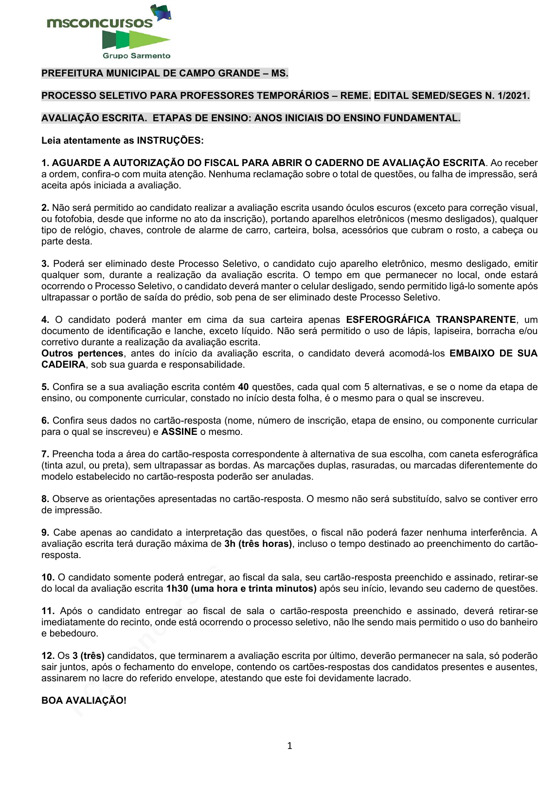pcimarkpci MjgwNDowMTRkOjE0ODQ6ODNkZTpkYzRmOmI4NjQ6YTA2ZDoxNTFi:V2VkLCAwMiBBdWcgMjAyMyAxNzowNjo0MiAtMDMwMA== www.pciconcursos.com.br 1 PREFEITURA MUNICIPAL DE CAMPO GRANDE – MS. PROCESSO SELETIVO PARA PROFESSORES TEMPORÁRIOS – REME. EDITAL SEMED/SEGES N. 1/2021. AVALIAÇÃO ESCRITA. ETAPAS DE ENSINO: ANOS INICIAIS DO ENSINO FUNDAMENTAL. Leia atentamente as INSTRUÇÕES: 1. AGUARDE A AUTORIZAÇÃO DO FISCAL PARA ABRIR O CADERNO DE AVALIAÇÃO ESCRITA. Ao receber a ordem, confira-o com muita atenção. Nenhuma reclamação sobre o total de questões, ou falha de impressão, será aceita após iniciada a avaliação. 2. Não será permitido ao candidato realizar a avaliação escrita usando óculos escuros (exceto para correção visual, ou fotofobia, desde que informe no ato da inscrição), portando aparelhos eletrônicos (mesmo desligados), qualquer tipo de relógio, chaves, controle de alarme de carro, carteira, bolsa, acessórios que cubram o rosto, a cabeça ou parte desta. 3. Poderá ser eliminado deste Processo Seletivo, o candidato cujo aparelho eletrônico, mesmo desligado, emitir qualquer som, durante a realização da avaliação escrita. O tempo em que permanecer no local, onde estará ocorrendo o Processo Seletivo, o candidato deverá manter o celular desligado, sendo permitido ligá-lo somente após ultrapassar o portão de saída do prédio, sob pena de ser eliminado deste Processo Seletivo. 4. O candidato poderá manter em cima da sua carteira apenas ESFEROGRÁFICA TRANSPARENTE, um documento de identificação e lanche, exceto líquido. Não será permitido o uso de lápis, lapiseira, borracha e/ou corretivo durante a realização da avaliação escrita. Outros pertences, antes do início da avaliação escrita, o candidato deverá acomodá-los EMBAIXO DE SUA CADEIRA, sob sua guarda e responsabilidade. 5. Confira se a sua avaliação escrita contém 40 questões, cada qual com 5 alternativas, e se o nome da etapa de ensino, ou componente curricular, constado no início desta folha, é o mesmo para o qual se inscreveu. 6. Confira seus dados no cartão-resposta (nome, número de inscrição, etapa de ensino, ou componente curricular para o qual se inscreveu) e ASSINE o mesmo. 7. Preencha toda a área do cartão-resposta correspondente à alternativa de sua escolha, com caneta esferográfica (tinta azul, ou preta), sem ultrapassar as bordas. As marcações duplas, rasuradas, ou marcadas diferentemente do modelo estabelecido no cartão-resposta poderão ser anuladas. 8. Observe as orientações apresentadas no cartão-resposta. O mesmo não será substituído, salvo se contiver erro de impressão. 9. Cabe apenas ao candidato a interpretação das questões, o fiscal não poderá fazer nenhuma interferência. A avaliação escrita terá duração máxima de 3h (três horas), incluso o tempo destinado ao preenchimento do cartão- resposta. 10. O candidato somente poderá entregar, ao fiscal da sala, seu cartão-resposta preenchido e assinado, retirar-se do local da avaliação escrita 1h30 (uma hora e trinta minutos) após seu início, levando seu caderno de questões. 11. Após o candidato entregar ao fiscal de sala o cartão-resposta preenchido e assinado, deverá retirar-se imediatamente do recinto, onde está ocorrendo o processo seletivo, não lhe sendo mais permitido o uso do banheiro e bebedouro. 12. Os 3 (três) candidatos, que terminarem a avaliação escrita por último, deverão permanecer na sala, só poderão sair juntos, após o fechamento do envelope, contendo os cartões-respostas dos candidatos presentes e ausentes, assinarem no lacre do referido envelope, atestando que este foi devidamente lacrado. BOA AVALIAÇÃO! pcimarkpci MjgwNDowMTRkOjE0ODQ6ODNkZTpkYzRmOmI4NjQ6YTA2ZDoxNTFi:V2VkLCAwMiBBdWcgMjAyMyAxNzowNjo0MiAtMDMwMA== www.pciconcursos.com.br 2 LÍNGUA PORTUGUESA. Leia o poema para responder às próximas três questões. Quem é você que me faz ouvir músicas românticas, que ao mesmo tempo que me faz sorrir...me faz chorar? Quem é você que me faz ter vontade de acordar todos os dias? Quem é você que está sendo sempre meu herói, quando eu preciso? Quem é você que sempre está em meus pensamentos? Quem é você que está sempre onde preciso? Você é um super-herói? Eu posso pegar sua mão e voar para qualquer lugar? Você lê minha mente, como se fosse um outdoor...e sempre diz tudo que eu quero ouvir. Você está sendo meu herói, está sendo tudo que eu preciso. Se você é o garoto certo para mim, como a gravidade, ninguém vai me parar. Porque eu, eu posso ser tudo que você precisa. (Vanessa Pimentel - https://www.pensador.com/autor/vanessa_pimentel/). 01. De acordo com o poema, assinale a alternativa incorreta. a) O eu lírico pergunta quem é este amor que faz com que ele ouça músicas românticas. b) O eu lírico reclama que este amor, quando ele precisa, está sempre ausente, não lhe faz companhia, não pode contar com ele. c) O eu lírico, diz que este alguém, é seu herói, é tudo que ele precisa. d) O eu lírico menciona, que ao mesmo tempo que este amor a faz sorrir, também a faz chorar. e) O eu lírico afirma “eu posso ser tudo que você precisa.” 02. Quanto a encontros vocálicos, as palavras do texto (dia, sua, voar) são: a) Hiato / hiato / hiato. b) Ditongo / ditongo / ditongo. c) Ditongo / ditongo / hiato. d) Hiato / hiato / ditongo. e) Hiato, tritongo, hiato. 03. “Você lê minha mente, como se fosse um outdoor...e sempre diz tudo que eu quero ouvir”. A oração grifada é: a) Oração coordenada assindética. b) Oração coordenada sindética adversativa. c) Oração coordenada sindética explicativa. d) Oração coordenada sindética aditiva. e) Oração coordenada sindética conclusiva. 04. Quanto ao emprego de classes de palavras, assinale a alternativa incorreta. a) Onde, como pronome relativo, refere-se a um antecedente, equivale a em que, no qual, e pode ser regido de preposição. b) O pronome indefinid