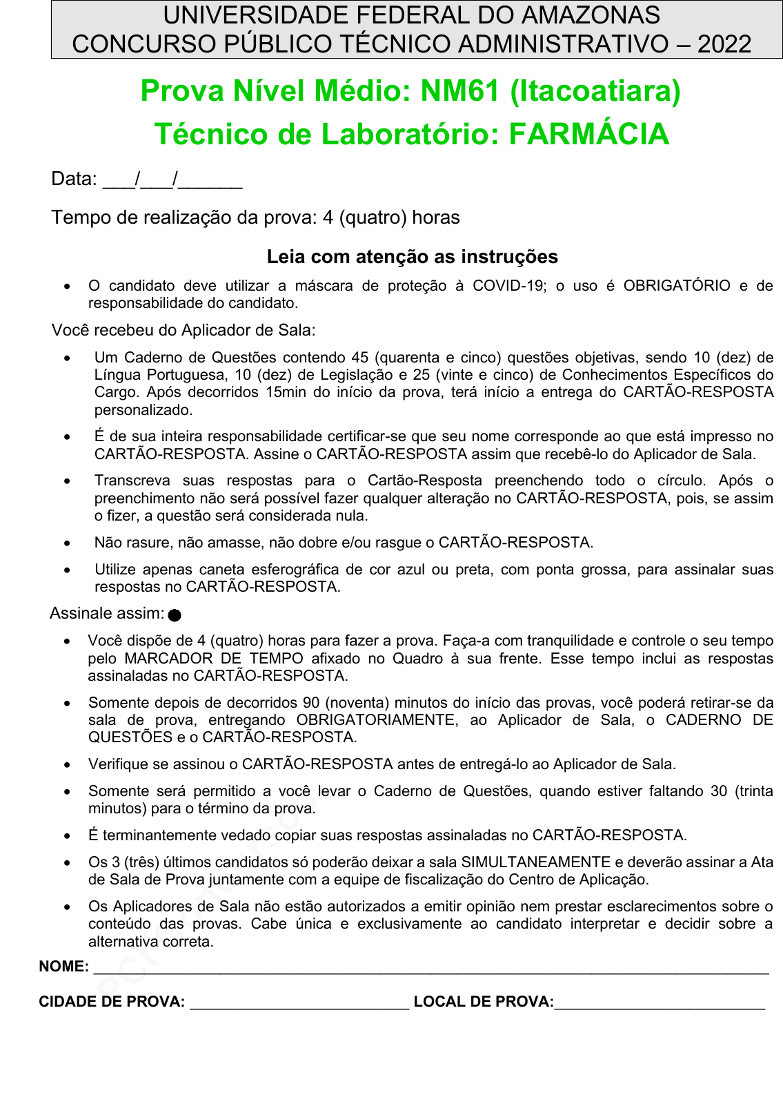 pcimarkpci MjgwNDowMTRkOjE0ODQ6ODNkZTpkYzRmOmI4NjQ6YTA2ZDoxNTFi:V2VkLCAwMiBBdWcgMjAyMyAxNjoxMTo0MiAtMDMwMA== www.pciconcursos.com.br UNIVERSIDADE FEDERAL DO AMAZONAS CONCURSO PÚBLICO TÉCNICO ADMINISTRATIVO – 2022 Prova Nível Médio: NM61 (Itacoatiara) Técnico de Laboratório: FARMÁCIA Data: ___/___/______ Tempo de realização da prova: 4 (quatro) horas Leia com atenção as instruções • O candidato deve utilizar a máscara de proteção à COVID-19; o uso é OBRIGATÓRIO e de responsabilidade do candidato. Você recebeu do Aplicador de Sala: • Um Caderno de Questões contendo 45 (quarenta e cinco) questões objetivas, sendo 10 (dez) de Língua Portuguesa, 10 (dez) de Legislação e 25 (vinte e cinco) de Conhecimentos Específicos do Cargo. Após decorridos 15min do início da prova, terá início a entrega do CARTÃO-RESPOSTA personalizado. • É de sua inteira responsabilidade certificar-se que seu nome corresponde ao que está impresso no CARTÃO-RESPOSTA. Assine o CARTÃO-RESPOSTA assim que recebê-lo do Aplicador de Sala. • Transcreva suas respostas para o Cartão-Resposta preenchendo todo o círculo. Após o preenchimento não será possível fazer qualquer alteração no CARTÃO-RESPOSTA, pois, se assim o fizer, a questão será considerada nula. • Não rasure, não amasse, não dobre e/ou rasgue o CARTÃO-RESPOSTA. • Utilize apenas caneta esferográfica de cor azul ou preta, com ponta grossa, para assinalar suas respostas no CARTÃO-RESPOSTA. Assinale assim: • Você dispõe de 4 (quatro) horas para fazer a prova. Faça-a com tranquilidade e controle o seu tempo pelo MARCADOR DE TEMPO afixado no Quadro à sua frente. Esse tempo inclui as respostas assinaladas no CARTÃO-RESPOSTA. • Somente depois de decorridos 90 (noventa) minutos do início das provas, você poderá retirar-se da sala de prova, entregando OBRIGATORIAMENTE, ao Aplicador de Sala, o CADERNO DE QUESTÕES e o CARTÃO-RESPOSTA. • Verifique se assinou o CARTÃO-RESPOSTA antes de entregá-lo ao Aplicador de Sala. • Somente será permitido a você levar o Caderno de Questões, quando estiver faltando 30 (trinta minutos) para o término da prova. • É terminantemente vedado copiar suas respostas assinaladas no CARTÃO-RESPOSTA. • Os 3 (três) últimos candidatos só poderão deixar a sala SIMULTANEAMENTE e deverão assinar a Ata de Sala de Prova juntamente com a equipe de fiscalização do Centro de Aplicação. • Os Aplicadores de Sala não estão autorizados a emitir opinião nem prestar esclarecimentos sobre o conteúdo das provas. Cabe única e exclusivamente ao candidato interpretar e decidir sobre a alternativa correta. NOME: ________________________________________________________________________________ CIDADE DE PROVA: __________________________ LOCAL DE PROVA:_________________________ pcimarkpci MjgwNDowMTRkOjE0ODQ6ODNkZTpkYzRmOmI4NjQ6YTA2ZDoxNTFi:V2VkLCAwMiBBdWcgMjAyMyAxNjoxMTo0MiAtMDMwMA== www.pciconcursos.com.br pcimarkpci MjgwNDowMTRkOjE0ODQ6ODNkZTpkYzRmOmI4NjQ6YTA2ZDoxNTFi:V2VkLCAwMiBBdWcgMjAyMyAxNjoxMTo0MiAtMDMwMA== www.pciconcursos.com.br Concurso UFAM 2022 NÍVEL MÉDIO: Técnico de Laboratório - Farmácia 1 LÍNGUA PORTUGUESA 01. Leia o texto a seguir. Para fins de elaboração da questão, ele foi dividido em seis trechos, mas a sua sequência forma um enunciado coerente. Foi retirado e adaptado do livro Raízes do Brasil, de Sergio Buarque de Holanda (Companhia das Letras, 2016, p. 61-62): I. Pioneiros da conquista do trópico para a civilização, tiveram os portugueses, nessa proeza sua maior missão histórica. Apesar de tudo quanto se possa alegar contra sua obra, forçoso é reconhecer que foram não somente os portadores efetivos como os portadores naturais dessa missão. II. Nenhum outro povo do Velho Mundo achou-se tão bem armado para se aventurar à exploração regular e intensa das terras próximas à linha equatorial, onde os homens depressa degeneram, segundo o conceito generalizado na era quinhentista. III. Essa exploração dos trópicos não se processou, em verdade, por um empreendimento metódico e racional, não emanou de uma vontade construtora e enérgica fez-se antes com desleixo e certo abandono. IV. Dir-se-ia mesmo que se fez apesar de seus autores. E o reconhecimento desse fato não constitui desprezo, à grandeza do esforço português se o julgarmos conforme os critérios morais e políticos nele dominantes, pois encontraremos muitas e sérias falhas. V. Nenhuma, porém, que leve com justiça à opinião extravagante defendida por um número não pequeno de detratores da ação dos portugueses no Brasil, muitos dos quais optariam, de bom grado, pelo triunfo da colonização holandesa, convictos de que nos teria levado a melhores e mais gloriosos rumos. VI. No entanto antes de abordar esse tema, é preferível encarar certo aspecto, que parece singularmente instrutivo das determinantes psicologias do movimento de expansão colonial portuguesa pelas terras de nossa América. Assinale as alternativas que apresentam os trechos CORRETAMENTE pontuados: a) Somente os trechos I, II e IV estão corretos. b) Somente os trechos I, III e V estão corretos. c) Somente os trechos I, IV e VI estão corretos. d) Somente os trechos II e V estão corretos. e) Somente os trechos III e VI estão corretos. 02. Assinale a alternativa em que o plural do substantivo composto está CORRETAMENTE escrito: a) Naquela clínica odontológica há muitos e competentes cirurgiões-dentistas. b) Não escreva “açucena” com dois cê-cedilhas, mas com apenas um. c) Podemos considerar o Vasco e a Portuguesa como clubes lusos-brasileiros. d) Gosto de verduras, mas couves-flor eu não consigo digerir. e) Dois arcos-íris apareceram no céu após as chuvas. 03. Passando a frase “O cientista não só inaugurou o primeiro planetário, como convidou técnicos especializados para trabalhar com ele” para o futuro do pretérito, os verbos em negrito assumem, respectivamente, as