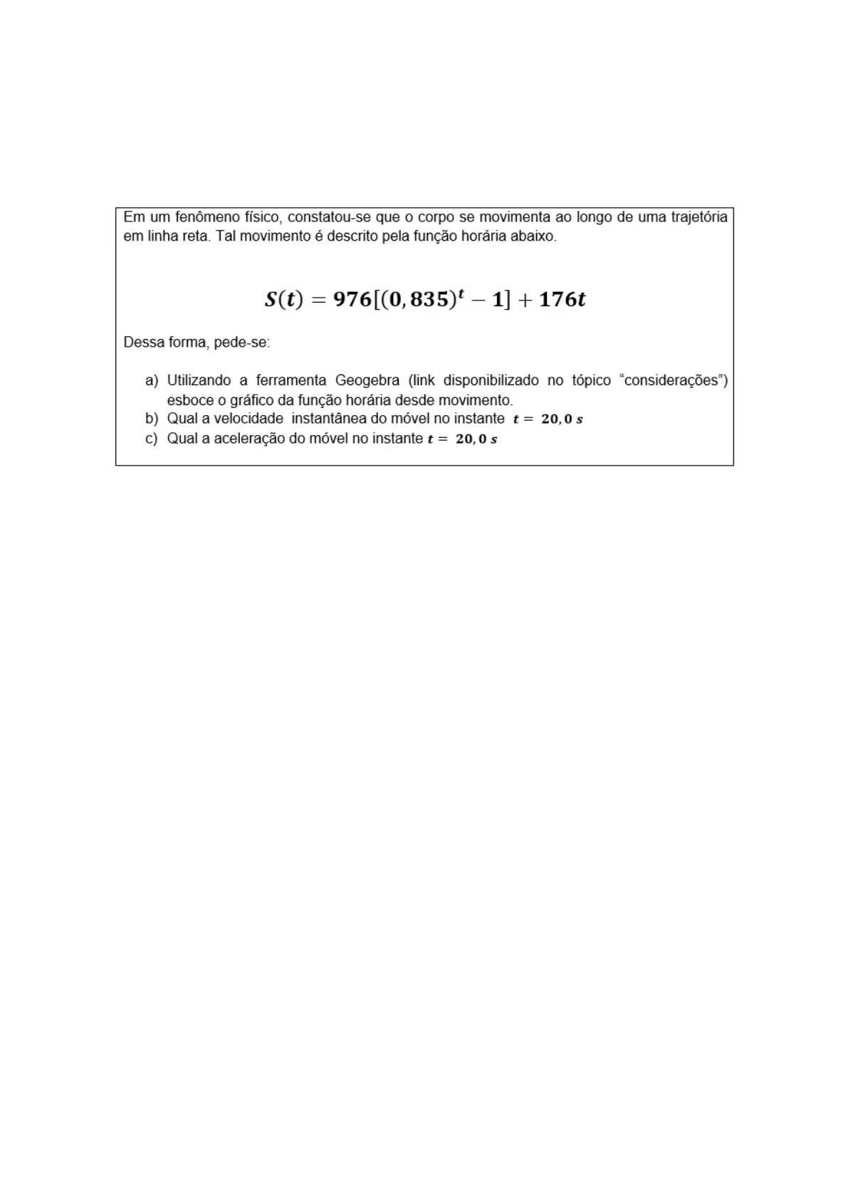 PROPOSTA DA ATIVIDADE Diante do contexto apresentado acima, solucione o problema exposto abaixo: Resposta: b) Primeira derivada S'(20)= ~171,22 m/s c) Segunda derivada S''(20)=~0,86 m/s²