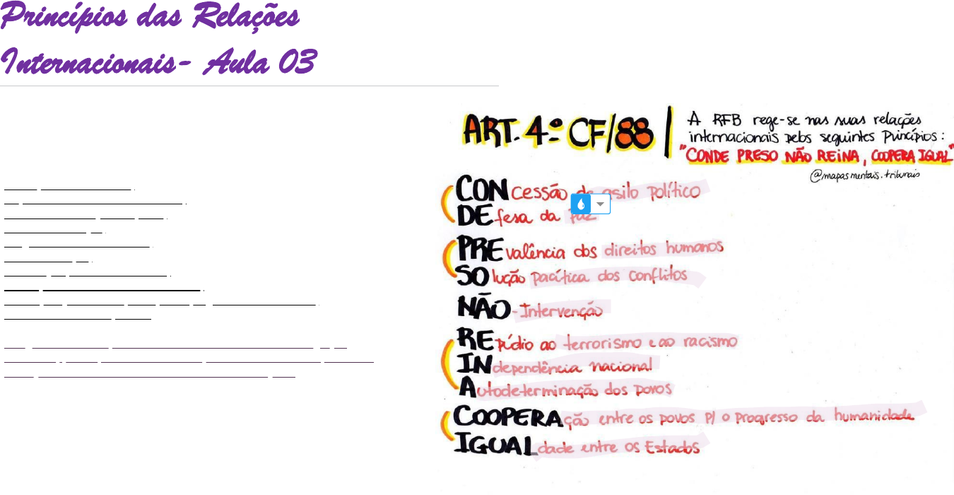 Princípios das Relações Internacionais- Aula 03 Saturday, January 18, 2020 8:57 PM Art. 4º A República Federativa do Brasil rege-se nas suas relações internacionais pelos seguintes princípios: I - independência nacional; II - prevalência dos direitos humanos; III - autodeterminação dos povos; IV - não-intervenção; V - igualdade entre os Estados; VI - defesa da paz; VII - solução pacífica dos conflitos; VIII - repúdio ao terrorismo e ao racismo; IX - cooperação entre os povos para o progresso da humanidade; X - concessão de asilo político. Parágrafo único. A República Federativa do Brasil buscará a integração econômica, política, social e cultural dos povos da América Latina, visando à formação de uma comunidade latino-americana de nações. 10. O Estado brasileiro deve obediência irrestrita à própria Constituição, mas, ainda assim, assumiu, nos termos desse estatuto político, o compromisso de reger-se, nas suas relações internacionais, pelo princípio da: (a) prevalência dos direitos humanos.