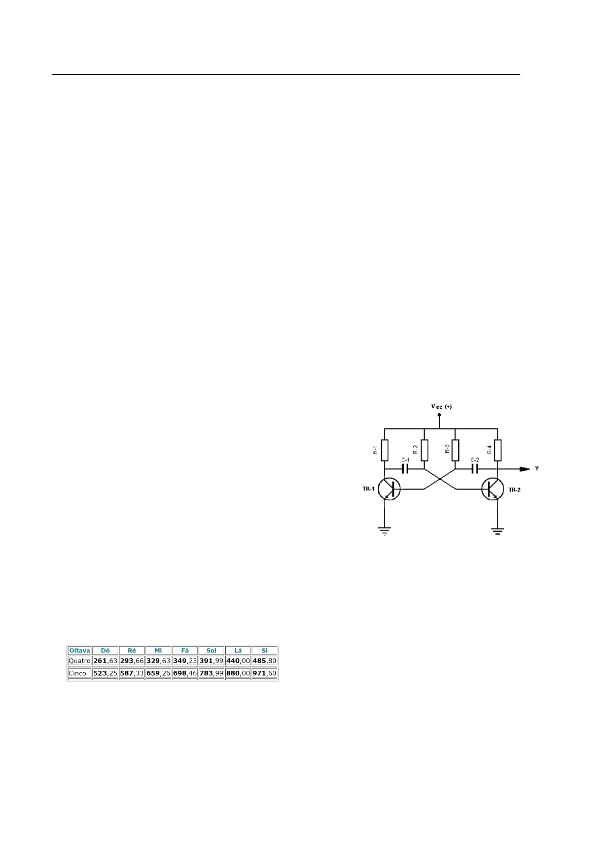 Disciplina: Experimental de Eletrônica Analógica I – Prof. Dr. Sérgio Ricardo de Jesus Oliveira DESENVOLVIMENTO DE UM TECLADO MUSICAL COM 2 OITAVAS (14 TECLAS) Garcia. Maria Vitória, Buiati. Rodrigo Nascimento e Silva. João Vitor Faculdade de Engenharia Elétrica - UFU, Uberlândia, Brasil e-mail: maria.garcia1@ufu.br Resumo: A partir do oscilador transistorizado, capacitor, resistor e fonte, foi projetado um circuito eletrônico analógico na intenção de atingir frequências específicas que se assemelham na frequência de notas musicais e assim, reproduzir um um teclado musical de 14 notas, o princípio básico da reprodução da frequência se deu por chaveamento(através do acionamento do botão) de resistências distintas e portanto, a reprodução da nota musical, na qual tinha como saída do circuito um alto falante para saída do som. Palavras-chave: frequência, oscilador transistorizado, capacitor, transistor, teclado musical. Introdução A música é uma forma de arte, uma prática cultural conhecida desde o período pré-histórico. É constituída pela combinação de vários sons e ritmos, seguindo uma pré-organização ao longo do tempo. O teclado musical por sua vez é um instrumento de teclas temperado, capazes de executar melodias e notas, formando uma harmonia. Composto por um conjunto de teclas adjacentes, que quando pressionadas produzem sons em determinadas frequências originando diferentes notas musicais, atualmente é incorporado aos mais diversos estilos musicais existentes. Tabela 1: Notas musicas e suas frequências características. Dessa forma o presente projeto tem como objetivo criar um dispositivo com oscilador transistorizado capaz de reproduzir várias notas musicais a partir da transformação de um sinal contínuo aplicado na entrada do circuito através de uma fonte externa, em um sinal com Modulação por Largura de Pulso (PWM), para uma abordagem didática do ensino de eletrônica analógica. Teclado Musical Para o desenvolvimento do projeto foi selecionado um oscilador do tipo astavel, composto por um circuito eletrônico que tem dois estados que nos permite controlar o tempo gasto em cada estado, ou seja, sua modulação e frequência pela carga ou descarga de um capacitor através de um resistor. Figura 1: Desenho do circuito utilizado. Seu funcionamento se baseia no processo de alternância nos estados dos transistores em estado de corte e saturação. Inicialmente, ao acionar o circuito, o transistor que estiver com maior condução entra em estado de saturação, e devido ao elo de realimentação mútua entre eles, o outro transistor é colocado na condição de corte. Um capacitor é colocado em cada um dos elos de realimentação, e a presença dos mesmos causa uma rotação de fase na realimentação para os dois transistores. Enquanto um dos transistores se encontra saturado, o capacitor que está conectado à sua base, através de uma corrente elétrica que percorre o elo de realimentação passando pelo resistor de coletor do transistor que se encontra em estado de corte. Em simultâneo, o capacitor ligado à base do transistor em corte permanece inerte neste primeiro momento, pois ainda não recebeu carga vinda de corrente elétrica. Quando o capacitor em processo de carga está próximo Disciplina: Experimental de Eletrônica Analógica I – Prof. Dr. Sérgio Ricardo de Jesus Oliveira de completar este processo, a realimentação positiva diminui, restando apenas o resistor ligado a base a polarizar este transistor, reduzindo drasticamente a sua corrente de coletor, fazendo com que neste momento, o outro transistor que estava em corte, entre numa condição que favorece a condução de corrente elétrica neste transistor. A partir deste momento, uma corrente começa a circular pelo coletor do transistor que se encontrava em corte, o que reduz os níveis de condutividade do transistor previamente saturado. Neste momento, este transistor que entrou em estado de condução, atinge rapidamente o estado de saturação, o que leva o outro transistor a atingir o estado de corte. Em decorrência desta inversão de estados dos transistores, o capacitor que antes se encontrava carregado, é forçado a descarregar através do resistor ligado à base do transistor em corte e através do transistor em saturação. Com isso, o capacitor que até então encontrava-se inerte no circuito, começa agora o processo de carga, via transistor saturado e resistor de coletor do transistor em corte. Repetidamente, este ciclo se repetirá enquanto o circuito se manter alimentado. Dessa forma, a modulação dos pulsos gerados foram realizadas pela adição de switches em série com resistores de base variados de acordo com a frequência desejada, possibilitando que o circuito atinja as notas musicais desejadas. Materiais e métodos Para a montagem do projeto em questão, foram utilizados os respectivos materiais: - 01 - Fonte de alimentação 3,3V. - 02 - Transistores NPN BC547C . - 02 - Resistores de Coletor de 1K. - 01 - Resistor fixo de Base de 8,2K. - 14 - Resistores variáveis para modulação da frequência. - 14 - Botões para acionamento do oscilador. - 02 - Capacitores cerâmicos de 130 nF. - 01 - Transistor BC337-25 para ganho de corrente - 01 - Caixa de PLA impressa em 3D O cálculo das frequências das notas musicais foram realizados a partir de uma equação, já pré-estabelecida para o oscilador do tipo astável, no qual, depende dos valores das resistências e capacitores de base para chegar no valor de frequência para aquela combinação. (1)𝑓 = 10,69*(𝑅1*𝐶1+𝑅2*𝐶2) Como os valores de capacitância e resistência do R2 já haviam sido definidos e as frequências desejadas já eram conhecidas, a equação foi colocada em função da frequência e à partir disso por possível chegar nos respectivos valores de R1: Tabela 2: Nota musical, frequência característica e resistor calculado. Oitava Nota Musical Frequênci a