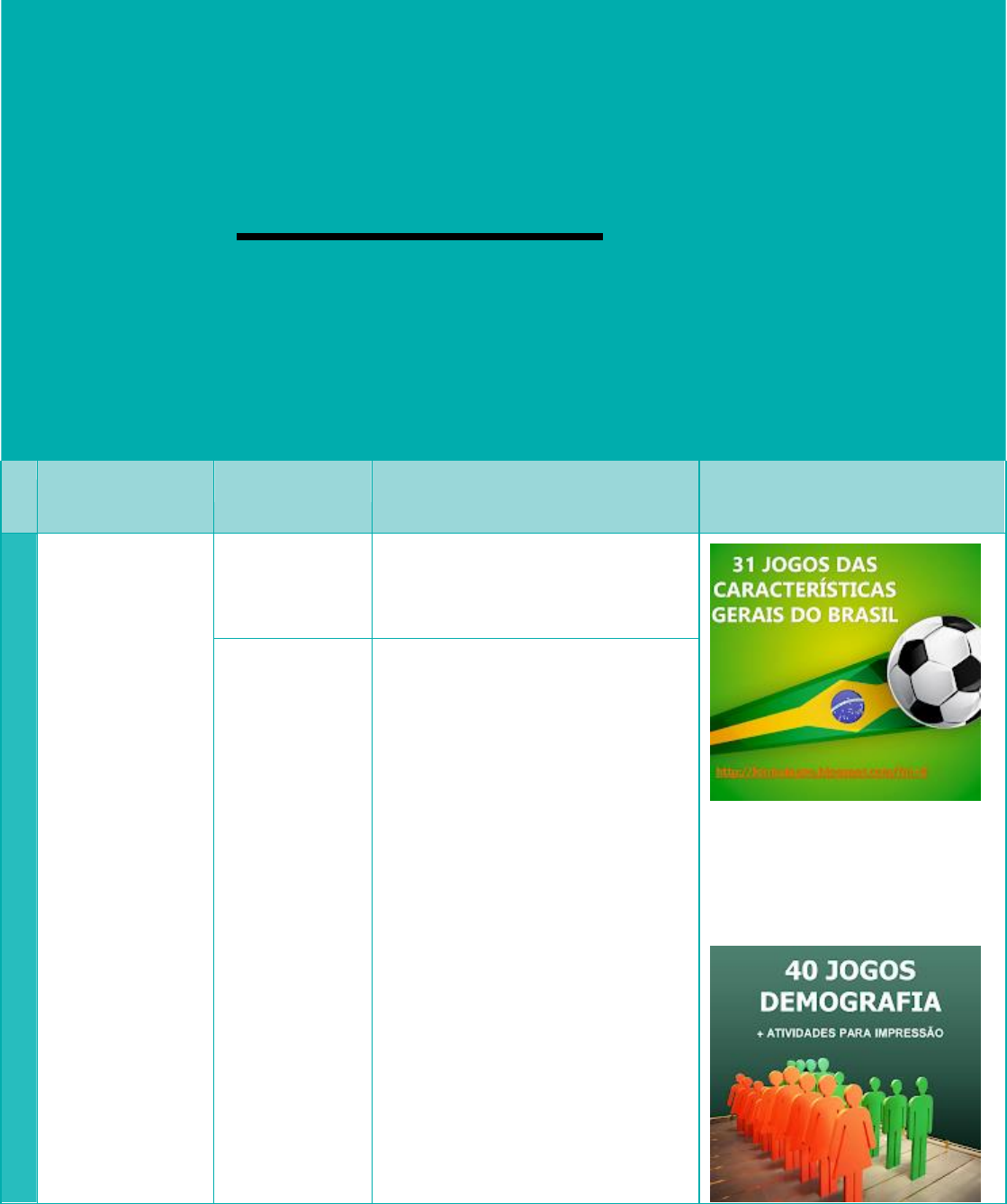 7º ANO - JOGOS E ATIVIDADES BNCC– GEOGRAFIA CLIQUE NA IMAGEM PARA BAIXAR ATIVIDADES E TER ACESSESOS AOS JOGOS ... FAÇA A DIFERENÇA PROFESSOR/PROFESSORA Unidades e Capítulos Objetos de conhecimento Habilidad es Jogo e ativida des 1 o B I M E S T R E UNIDADE I O TERRITÓRIO BRASILEIRO CAPÍTULO 1 A localização geográfica brasileira e as paisagens CAPÍTULO 2 Características do território brasileiro CAPÍTULO 3 Meio ambiente, sustentabilidade e fontes de energia CAPÍTULO 4 Formação e regionalização do território brasileiro Ideias e concepções sobre a formação territorial do Brasil EF07GE01: Avaliar, por meio de exemplos extraídos dos meios de comunicação, ideias e estereótipos acerca das paisagens e da formação territorial do Brasil. Formação territorial do Brasil EF07GE02: Analisar a influência dos fluxos econômicos e populacionais na formação socioeconômica e territorial do Brasil, compreendendo os conflitos e as tensões históricas e contemporâneas. EF07GE03: Selecionar argumentos que reconheçam as territorialidades dos povos indígenas originários, das comunidades remanescentes de quilombos, de povos das florestas e do cerrado, de ribeirinhos e caiçaras, entre outros grupos sociais do campo e da cidade, como direitos legais dessas comunidades. Características da população brasileira EF07GE04: Analisar a distribuição territorial da população brasileira, considerando a diversidade étnico- cultural (indígena, africana, europeia e asiática), assim como aspectos de renda, sexo e idade nas regiões brasileiras. https://drive.google.com/file/d/1K1xePRlZjKzl_pJlR6P0ACYO8ehjietU/view?usp=sharing https://drive.google.com/file/d/1Jq9czuJFINMlRp2wmNxsVMdQ4qIFG_l4/view?usp=sharing Produção, circulação e consumo de mercadorias EF07GE05: Analisar fatos e situações representativas das alterações ocorridas entre o período mercantilista e o advento do capitalismo. EF07GE06: Discutir em que medida a produção, a circulação e o consumo de mercadorias provocam impactos ambientais, assim como influem na distribuição de riquezas, em diferentes lugares. Mapas temáticos do Brasil EF07GE09: Interpretar e elaborar mapas temáticos e históricos, inclusive utilizando tecnologias digitais, com informações demográficas e econômicas do Brasil (cartogramas), identificando padrões espaciais, regionalizações e analogias espaciais. EF07GE10: Elaborar e interpretar gráficos de barras, gráficos de setores e histogramas, com base em dados socioeconômicos das regiões brasileiras. Biodiversidade brasileira EF07GE11: Caracterizar dinâmicas dos componentes físico-naturais no território nacional, bem como sua distribuição e biodiversidade (Florestas Tropicais, Cerrados, Caatingas, Campos Sulinos e Matas de Araucária). EF07GE12: Comparar unidades de conservação existentes no Município de residência e em outras localidades brasileiras, com base na organização do Sistema Nacional de Unidades de Conservação (SNUC). Nesta Unidade, espera-se que o estudante seja capaz de: • compreender como a localização e dimensão do Brasil contribuem para a diversidade natural do país; • relacionar elementos naturais e culturais da paisagem brasileira; • identificar e localizar questões relacionadas à geração de energia no Brasil; • identificar e entender as principais regionalizações do território brasileiro; • conhecer os principais problemas do Brasil referentes ao meio ambiente e listar ações existentes que visam a preservação e a sustentabilidade. https://drive.google.com/file/d/1F60Www8UgtE5T7x4LRlvLldJ5bYtK5xt/view?usp=sharing https://drive.google.com/file/d/1pOeJF5B7JS70AWm-6QRVrvd20v8FLl19/view?usp=sharing https://drive.google.com/file/d/1N3sX6sTLKRWdUwqe9BnKF9SyLG1yMsov/view?usp=sharing Unidades e Capítulos Objetos de conhecimento Habilidad es Jogos e atividades para impressão 2 o B IM E S T R E UNIDADE II POPULAÇÃO BRASILEIRA CAPÍTULO 5 Aspectos demográficos e sociais CAPÍTULO 6 A heterogeneidade da população brasileira CAPÍTULO 7 População e trabalho Ideias e concepções sobre a formação territorial do Brasil EF07GE01: Avaliar, por meio de exemplos extraídos dos meios de comunicação, ideias e estereótipos acerca das paisagens e da formação territorial do Brasil. Formação territorial do Brasil EF07GE02: Analisar a influência dos fluxos econômicos e populacionais na formação socioeconômica e territorial do Brasil, compreendendo os conflitos e as tensões históricas e contemporâneas. EF07GE03: Selecionar argumentos que reconheçam as territorialidades dos povos indígenas originários, das comunidades remanescentes de quilombos, de povos das florestas e do cerrado, de ribeirinhos e caiçaras, entre outros grupos sociais do campo e da cidade, como direitos legais dessas comunidades. Características da população brasileira EF07GE04: Analisar a distribuição territorial da população brasileira, considerando a diversidade étnico- cultural (indígena, africana, europeia e asiática), assim como aspectos de renda, sexo e idade nas regiões brasileiras. Desigualdade social e o trabalho EF07GE07: Analisar a influência e o papel das redes de transporte e comunicação na configuração do território brasileiro. EF07GE08 Estabelecer relações entre os processos de industrialização e inovação tecnológica com as transformações socioeconômicas do território brasileiro. Mapas temáticos do Brasil EF07GE09: Interpretar e elaborar mapas temáticos e históricos, inclusive utilizando tecnologias digitais, com informações demográficas e econômicas do Brasil (cartogramas), identificando padrões espaciais, regionalizações e analogias espaciais. EF07GE10: Elaborar e interpretar gráficos de barras, gráficos de setores e histogramas, com base em dados socioeconômicos das regiões brasileiras. https://drive.google.com/file/d/1UM3C3HeUADY6qc9Sc1fxnnGk31xjmxBv/view?usp=sharing https://drive.googl