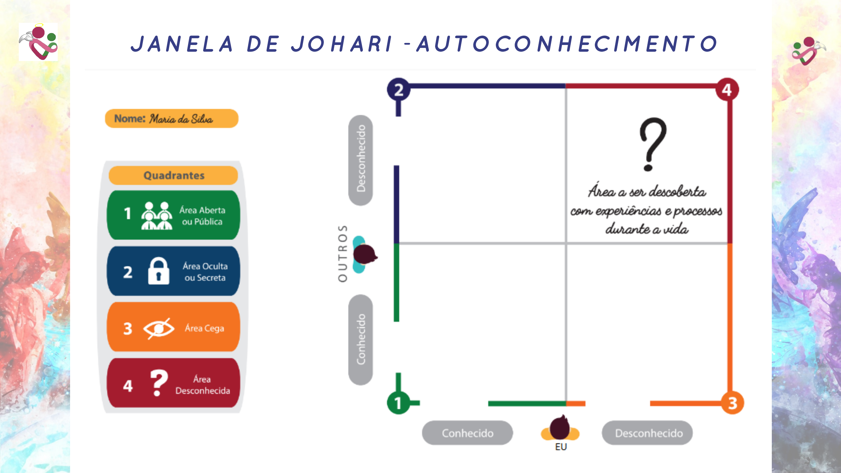 GAEC A M O R FRATERNO .C O M .B R GAEC A M O R FRATERNO .C O M .B RJANELA DE JOHARI -AUTOCONHECIMENTO GAEC A M O R FRATERNO .C O M .B R GAEC A M O R FRATERNO .C O M .B RJANELA DE JOHARI -AUTOCONHECIMENTO O que você acredita que são as minhas habilidades? Como você me descreveria em 3 palavras? E as características não tão positivas, quais são? Em sua opinião, Quais são as minhas competências? Em sua opinião, Quais são as minhas paixões? Em sua opinião, Quais são os meus medos? Ex: Medo de não ser relevante ao mundo. Para facilitar um pouco o seu processo, vou destacar abaixo algumas perguntas que você pode utilizar como exemplo para encaminhar às pessoas de seu convívio: GAEC A M O R FRATERNO .C O M .B R GAEC A M O R FRATERNO .C O M .B RJANELA DE JOHARI -AUTOCONHECIMENTO Veja um Exemplo já preenchido: