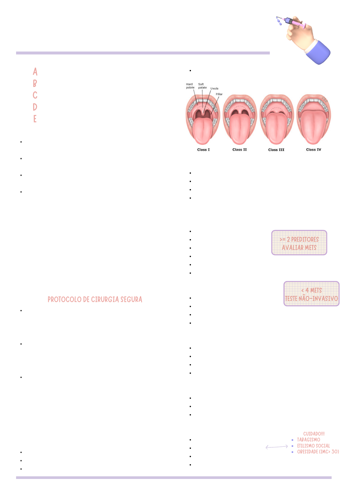 Classe IV: palato duro Líquidos claros - 2 horas Leite materno - 4 horas Fórmula láctea e outros leites - 6 horas Sólidos e não claros - 6 a 8 horas Coronariopatia ICC DRC (Cr > 2) DM insulinodependente Doença cerebrovascular (AVC ou AIT) Grande cirurgia (torácica, abdominal ou vascular) 1 MET - cuidados próprios 4 METs - subir 1 lance de escadas 4 a 10 METs - limpar a casa/arrastar móveis > 10 METs - pratica esportes Angina instável ICC descompensada Arritmia grave Valvopatia grave Valor ideal: < 140 x 90 mmHg Suspender cirurgia: > 180 x 110 mmHg (se eletiva) Tempo ideal para controle da PA: 30 dias ASA I - sem doença ASA II - doença (não limita) ASA III - limita, mas não incapacita ASA IV - incapacita 4. Jejum CARDIOVASCULAR Índice de risco cardíaco revisado (IRCR) Capacidade funcional Cardiopatias graves - Não operar Hipertensão arterial CLASSIFICAÇÃO DE ASA Amanda Vieira Sampaio - Medicina UFMA PHO AA BB CC DD EE PROTOCOLO DE CIRURGIA SEGURAPROTOCOLO DE CIRURGIA SEGURA PRÉ-OPERATÓRIO ntibioticoprofilaxia edside questions ardiovascular rogas xames complementares Limpa - não invade tratos contaminados - nunca utilizar (exceção osso ou prótese) Limpa contaminada - invade sob controle (boa téncnica asséptica) - sempre utilizar Contaminada - sem controle ou inflamação - sempre utilizar Suja ou infectada - infecção ativa ou víscera perfurada - antibioticoterapia Qual antibiótico profilático? Nome, cirurgia e lado ANTIBIOTICOPROFILAXIA 1. R: cefazolina (S. aureus e S. coagulase negativo) 2. Quando fazer? R: 30 a 60 min antes da incisão (indução anestésica) 3. Quando interromper? R: Ao final da cirurgia. Aceito até 24 horas. BEDSIDE QUESTIONS 1. Sign in Time out Sign out Classe I: fauce pilares Classe II: ponta da úvula Classe III: base da úvula Antes da indução anestésica Identificação, procedimento, lateralidade, consentimento, reserva de sangue e CTI Antes da incisão na pele Identificação, procedimento, lateralidade, ATBprofilaxia, materiais e imagens Antes de sair de sala Instrumentos, compressas, perfurocortantes, identificar amostras e problemas ocorridos 2. Alergias Drogas, esparadrapo e látex (primeira cirurgia do dia) 3. Via aérea difícil - Mallampati >= 2 PREDITORES>= 2 PREDITORES AVALIAR METSAVALIAR METS < 4 METS< 4 METS TESTE NÃO-INVASIVOTESTE NÃO-INVASIVO TABAGISMOTABAGISMO ETILISMO SOCIALETILISMO SOCIAL OBESIDADE (IMC> 30)OBESIDADE (IMC> 30) CUIDADO!!!CUIDADO!!! 5 dias < 45 anos: nada 45 a 54 anos: ECG (H) 55 a 70 anos: ECG + hemograma > 70 anos: + U/Cr + eletrólitos + glicose < 40 anos: nada 40 a 49 anos: ECG (H) + hemograma 50 a 64 anos: ECG (M) + hemograma ≥ 65 anos: + U/Cr + eletrólitos + glicose + RX de tórax Coagulograma: estimativa de perda > 2 litros ou cirurgia cardíaca, torácia ou neurocirurgia RX de tórax: cirurgia cardíaca ou torácica Antiagregantes (AAS mantém) Varfarina (INR ≤ 1,5) NOTA: Gingko (36h), Alho (7 dias) e Ginseng (7 dias) EXAMES COMPLEMENTARES Idade Outros ASA V - moribundo ASA VI - morte encefálica Manter No dia 2 dias NOTA: Emergência - sufixo E DROGAS Corticoide (hidrocortisona IV) Anti-hipertensivo Insulina (glicemia 80 a 180 mg/dL) Psicotrópico e Levotiroxina Antidiabéticos orais (iSGLT2 3 a 4 dias) Heparinas (HNF 6h/HBPM 24h) Novos anticoagulantes Metformina AINEs Amanda Vieira Sampaio - Medicina UFMA PHO PRÉ-OPERATÓRIO SABISTONSABISTON USP-SPUSP-SP