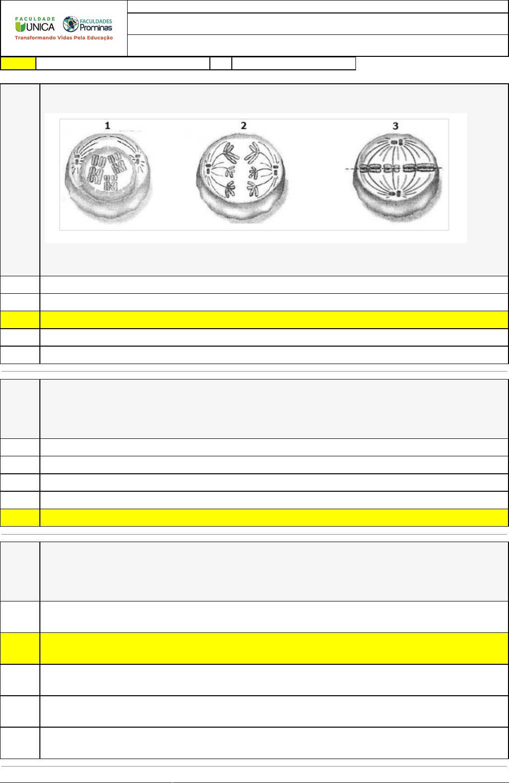 03/08/2023 17:49:20 1/3 REVISÃO DE SIMULADO Nome: JOSÉ RAIMUNDO SOARES MOTA Disciplina: Citologia e Histologia Respostas corretas são marcadas em amarelo X Respostas marcardas por você. Questão 001 (UFRGS)Os diagramas abaixo se referem a células em diferentes fases da meiose de um determinado animal. Os diagramas 1, 2 e 3 correspondem, respectivamente, a: A) prófase I, metáfase I e telófase II. B) prófase II, anáfase II e telófase I. X C) prófase I, anáfase I e metáfase II. D) prófase II, anáfase I e telófase I. E) prófase I, metáfase II e anáfase II. Questão 002 Mitose e meiose são processos de divisão celular que, apesar de suas diferenças, podem estar relacionados à reprodução. De maneira geral, essa é a função da meiose em organismos pluricelulares, e, da mitose, em organismos unicelulares. Dessa forma, nos organismos unicelulares, a mitose será responsável por A) produzir número equivalente de células da meiose. B) formar gametas de alta fecundidade. C) estimular o crescimento do organismo. D) produzir esqueletos de carbono. X E) gerar descendentes geneticamente iguais. Questão 003 (UFSC) A meiose caracteriza-se pela ocorrência de apenas uma duplicação do material genético para cada duas divisões nucleares, e é responsável pela formação de células haploides a partir de células diploides. Em relação a esse tipo de divisão celular, analise as opções assinale a alternativa errada. A) A meiose ocorre durante o processo de produção das células reprodutivas e possibilita o aumento da variabilidade genética dos seres vivos que a realizam. X B) O crossing over ocorre na prófase da meiose I e caracteriza-se pela permuta entre os segmentos das cromátides irmãs do mesmo cromossomo. C) Na metáfase I, os pares de cromossomos homólogos duplicados encontram-se na placa equatorial da célula. D) A redução, pela metade, do número cromossômico confere à meiose uma importância fundamental na manutenção do número constante de cromossomos da espécie. E) Na anáfase I ocorre a separação dos pares de homólogos, havendo a migração polar dos cromossomos duplicados. 03/08/2023 17:49:20 2/3 Questão 004 Os osteócitos, osteoblastos e osteoclastos têm como características e funções? A) Células cuboides com atividade fagocítica; células em atividade de síntese; células achatadas dentro de lacunas com metabolismo baixo. B) Todas são células achatadas que ficam dentro das lacunas e têm variação de atividade metabólica. C) Células em atividade de síntese; células achatadas dentro de lacunas com metabolismo baixo; células cuboides com atividade fagocítica. D) Todas as células têm atividade de síntese e fagocitose. X E) Células achatadas dentro de lacunas com metabolismo baixo; células em atividade de síntese; células cuboides com atividade fagocítica. Questão 005 As espécies que apresentam reprodução sexuada podem ser divididas em dois grupos: o grupo das espécies com fecundação interna, em que os zigotos recebem proteção dos pais, como no caso dos mamíferos; e o grupo formado por espécies de fecundação externa, em que os zigotos são abandonados pelos pais (zigotos órfãos), como ocorre em um grande número de espécies de vertebrados e invertebrados. Após a fecundação, formados os zigotos, tem início o processo de divisão celular com a duplicação do DNA (fase S) e divisão celular por mitose, até a formação da gástrula. Em um dos dois grupos, a divisão celular é muito rápida, pois são suprimidas a fase G2, na qual são reparados eventuais erros de duplicação, e a fase G1, de preparação da fase S. No outro grupo a divisão celular é mais longa, pois inclui as fases G1 e G2, que são demoradas. As duas estratégias são adaptações que se originam na ação da seleção natural. Agora observe os gráficos A e B a seguir: Qual o gráfico que representa o grupo de espécies com cuidado parental e o que corresponde ao grupo sem cuidado parental (órfãos)? A) A e B com cuidado parental. X B) A sem cuidado parental B com cuidado parental. C) A e B sem cuidado parental. D) A com cuidado parental e B sem cuidado parental. E) Nenhuma das alternativas acima. 03/08/2023 17:49:20 3/3 Questão 006 Em células eucariotas, a cromatina pode se apresentar como eucromatina, uma forma não espiralada, ou como heterocromatina, uma forma muito espiralada. Na metáfase, muitas regiões de eucromatina se transformam em heterocromatina, formando cromossomos bastante espiralados, conforme mostra o esquema. Considerando uma mitose típica, a formação do cromossomo bastante espiralado favorece o seguinte processo: A) nenhuma das alternativas está correta. X B) distribuição do DNA para células-filhas. C) sedução do cariótipo original. D) transcrição dos genes pela RNA polimerase. E) síntese de proteínas nos ribossomos. Questão 007 (UEL) A organela citoplasmática responsável pela síntese de proteínas o qual é originada a partir do nucléolo é o A) ribossomo. B) cloroplasto. X C) centríolo. D) complexo de golgi. E) lisossomo. Questão 008 (VUNESP) O ciclo celular envolve a interfase e as divisões celulares, que podem ser mitose ou meiose. A meiose é um tipo de divisão celular que originará quatro células com o número de cromossomos reduzido pela metade. Com base no texto e em seus conhecimentos sobre o assunto, é correto afirmar que: A) na telófase I os cromossomos separados em dois lotes sofrem duplicação do material genético e as membranas nucleares se reorganizam. B) o crossing-over ocorre em todos os cromossomos não homólogos. X C) na anáfase I cada cromossomo de um par de cromossomos homólogos é puxado para um dos polos da célula. D) interfase é um período em que ocorre apenas a duplicação do material genético. E) quiasmas são as permutas que ocorrem entre cromátides irmãs que permitem a variedade de gametas.