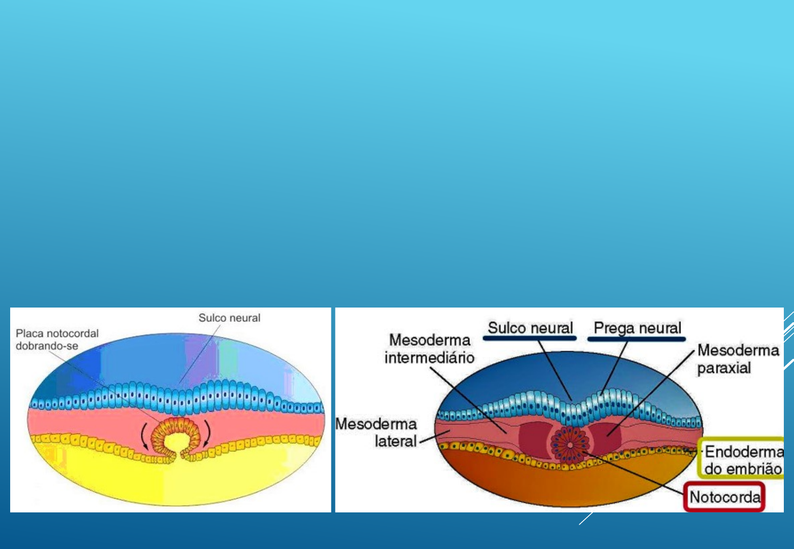 Além da formação da linha primitiva, durante a gastrulação surgem a placa precordal e a notocorda, duas estruturas muito importantes. As células mesenquimais saem do nó e da fosseta primitiva e formam o processo notocordal. Este adquire um canal notocordal e cresce até a placa precordal, uma região onde o endoderma e ectoderma estão firmemente ligados. A notocorda surge através da transformação do processo notocordal. EMBRIOLOGIA NEURULAÇÃO E NOTOCORDA EMBRIOLOGIA NEURULAÇÃO Algumas células mesenquimais, que ingressaram através da linha primitiva e, como consequência, tiveram destinos de células do mesoderma, migram cefalicamente do nó e da fosseta primitivos, formando um cordão celular mediano, o processo notocordal. Esse processo logo adquire uma luz, o canal notocordal. O processo notocordal cresce cefalicamente entre o ectoderma e o endoderma até alcançar a placa precordal, uma pequena área circular de células endodérmicas colunares, onde o ectoderma e o endoderma estão em contato. EMBRIOLOGIA NEURULAÇÃO A Neurulação consiste da etapa onde ocorre a todos os processos envolvidos na formação da placa neural e pregas neurais e fechamento dessas pregas para formar o tubo neural. Esses processos terminam quando ocorre o fechamento do neuroporo caudal. EMBRIOLOGIA Com o desenvolvimento da notocorda, o ectoderma embrionário acima dela se espessa, formando uma placa alongada, em forma de chinelo, de células epiteliais espessadas, a placa neural. O ectoderma da placa neural (neuro ectoderma) dá origem ao SNC — encéfalo e medula espinhal. Inicialmente, a placa neural alongada corresponde, em comprimento, à notocorda. Ela aparece cefalicamente ao nó primitivo e dorsalmente à notocorda e ao mesoderma. Enquanto a notocorda se alonga, a placa neural se alarga e se estende cefalicamente. EMBRIOLOGIA Por volta do 18º dia, a placa neural se invagina ao longo do seu eixo central, formando um sulco neural mediano, com pregas neurais em ambos os lados. As pregas neurais tornam-se particularmente proeminentes na extremidade cefálica do embrião e constituem os primeiros sinais do desenvolvimento do encéfalo. EMBRIOLOGIA No fim da terceira semana, as pregas neurais já começaram a se aproximar e a se fundir, convertendo a placa neural em tubo neural, o primórdio do SNC. O tubo neural logo se separa do ectoderma da superfície, assim que as pregas neurais se encontram. A neurulação é completada durante a quarta semana. Número do slide 1 Número do slide 2 Número do slide 3 Número do slide 4 Número do slide 5 Número do slide 6