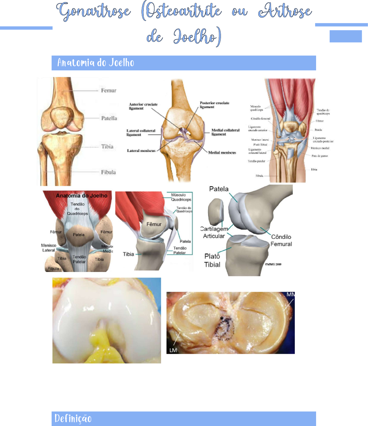 Cartilagem e Meniscos Giovanna Lopes - “Artrose” é um processo contínuo, irreversível e inflamatório de destruição da cartilagem. - Como consequência dessa destruição cartilaginosa, a doença também irá diminuir o arco de movimento do joelho do paciente. - É uma doença de idoso. Destruição da cartilagem - A definição da osteoartrite é ainda um grande desafio. Substanciais diferenças na prevalência e incidência dessa doença podem ocorrer, se para sua definição forem utilizadas apenas alterações radiográficas, sintomas ou uma combinação de ambos. - Com base nas atuais evidências, a osteoartrite – artrose ou osteoartrose – é, geralmente, uma doença progressiva nas articulações sinoviais que representa a falha no reparo de danos articulares resultantes de estresses que podem ter iniciado por anormalidades em qualquer dos tecidos articulares, incluindo cartilagem articular, osso subcondral, ligamentos, meniscos (quando presentes), músculos periarticulares, nervos periféricos ou sinóvia. - Isso, por fim, resulta no colapso da cartilagem e do osso, causando sintomas de dor, rigidez e incapacidade funcional. - As definições radiológicas utilizam-se de classificações com base na presença de osteófitos, diminuição do espaço articular ou combinação de ambos. - A osteoartrite é a forma mais comum de doença articular. A Organização Mundial da Saúde (OMS) estima que 10% da população mundial acima de 60 anos apresenta graves problemas clínicos decorrentes da osteoartrite. - A prevalência da doença como um todo é muito correlacionada com a idade. Independentemente de como ela é definida, é incomum em adultos abaixo de 40 anos e de grande prevalência em indivíduos acima de 60 anos. - Nas mulheres, especialmente após os 50 anos, a osteoartrite é mais prevalente do que nos homens e tem distribuição mais difusa. - A população brasileira de indivíduos acima de 60 anos passou de pouco mais de 7 milhões, em 1980, para 19,2 milhões, em 2010, e é provável que chegue a 60 milhões em 2050. - Haverá, portanto, grande aumento do número de casos de osteoartrite, considerando que sua prevalência tem relação direta com o aumento da idade da população. - A osteoartrite pode ser dividida em primária (idiopática) ou secundária. - A forma idiopática pode ser classificada em localizada ou generalizada (quando acomete três ou mais articulações). - É possível dividir a osteoartrite idiopática do joelho em compartimento medial, compartimento lateral e compartimento patelofemoral. - A dor na artrose primária é do tipo mecânica. Essa dor inicia logo pela manhã devido à imobilidade do período noturno, apresenta momentos de melhora durante o dia e torna-se pior à tarde, devido aos esforços. É a dor relacionada ao movimento. - Apresenta início insidioso e incapacidade progressiva. No início da patologia, os sintomas estão relacionados à prática de esforço físico e, com a evolução, a dor aparece mesmo em repouso. - É frequente a presença de crepitação e derrame de repetição. - O aumento da idade piora o quadro clínico das artroses primária e secundária. - Em 1986, o American College of Rheumatology estabeleceu uma lista de critérios diagnósticos para a osteoartrite dos joelhos. Esses critérios são os mais usados atualmente para definir um paciente como portador de osteoartrite e possuem boa reprodutibilidade. - Em 1957, Kellgren e Lawrence propuseram uma classificação radiológica da osteoartrite baseados nas seguintes características radiológicas, consideradas evidências da doença: o Formação de osteófitos nas margens da articulação ou, no caso dos joelhos, nas espinhas tibiais. o Ossículos periarticulares. o Estreitamento da cartilagem articular em associação com esclerose do osso subcondral. o Pequenas áreas pseudocísticas com paredes escleróticas geralmente situadas no osso subcondral. o Forma alterada das margens ósseas. - Os autores, então, classificaram a osteoartrite em cinco graus: o Grau 0: nenhuma o Grau 1: duvidosa o Grau 2: mínima o Grau 3: moderada o Grau 4: grave - Portanto, o grau 0 indica ausência de alterações radiográficas de osteoartrite, e o grau 2 indica que a doença está presente, com acometimento mínimo. - Em 1968, Ahlback elaborou uma classificação radiológica que, depois, foi modificada por Keyes e colaboradores (essa classificação é mais usada por ortopedistas para avaliar o grau de acometimento radiográfico e para acompanhamento da progressão da patologia, assim como auxiliar na programação cirúrgica. Classificação de Ahlback - As radiografias simples são os principais exames de imagem utilizados para diagnóstico da artrose e para o planejamento cirúrgico. - As radiografias devem ser realizadas em anteroposterior com apoio monopodal, perfil em 30º e incidência de Rosenberg. - Na incidência de Rosenberg, o joelho está em 45º de flexão (com carga) e sua face anterior apoiada no chassi; os raios têm incidência posteroanterior, inclinação podal de 10º e estão afastados em um metro do chassi. - A radiografia panorâmica dos membros inferiores também é de fundamental importância para a avaliação correta dos eixos anatômico e mecânico dos membros inferiores. Sabe-se que o mau alinhamento do membro inferior é grande fator de risco para progressão da doença, sendo que o alinhamento em varo aumenta o risco de artrose no compartimento medial e o alinhamento em valgo no compartimento lateral. Artrose leve Artrose moderada Artrose grave - Outros exames podem ser solicitados, como tomografia, cintilografia e RM, sendo solicitados principalmente nas artroses secundárias. - A RM pode ser útil para auxiliar no diagnóstico de lesão degenerativa meniscal e fratura por insuficiência do osso subcondral. - História Clínica (idoso, dor em caminhadas curtas, limitação de movimento...). - Radiografia com apoio monopodálico –
