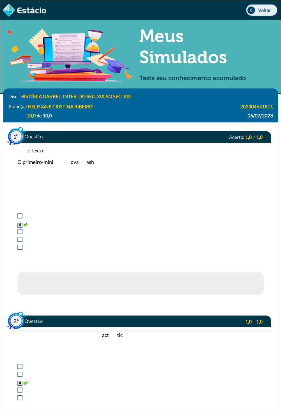Meus Simulados Teste seu conhecimento acumulado Disc.: HISTÓRIA DAS REL. INTER. DO SEC. XIX AO SEC. XXI Aluno(a): HELISIANE CRISTINA RIBEIRO 202304641811 Acertos: 10,0 de 10,0 06/07/2023 Acerto: 1,0 / 1,0 Leia o texto O primeiro-ministro kosovar, Hashim Thaci, declarou a independência unilateral de Kosovo, neste domingo (17), em uma sessão extraordinária do parlamento. ''Nós, os líderes do nosso povo, democraticamente eleitos, proclamamos por meio desta declaração que Kosovo é agora um estado independente e soberano'', disse Thaci à assembleia. Disponível em http://g1.globo.com/Noticias/Mundo/0,,MUL302307-5602,00.html. A questão da questão da independência do Kosovo insere-se em um con�ito maior chamado de questão: Colombiana. Iugoslava. Coreana. Tailandesa. Espanhola. Respondido em 27/07/2023 19:33:03 Explicação: A resposta certa é: Iugoslava. Acerto: 1,0 / 1,0 Os blocos econômicos apresentam características distintas conforme o nível de integração regional em seu interior. Esse nível de integração é determinado pelos objetivos políticos e econômicos dos países-membros nas relações comerciais. Como consequência disso, cada tipo de bloco recebe uma designação que o identi�ca e o distingue dos outros. A relação correta entre o tipo de integração e o respectivo bloco pode ser expressa em: União Econômica - ALCA. União Aduaneira - Mercosul. Área de Livre Comércio - União Europeia. União Alfandegária - NAFTA. Mercado Comum - Pacto Andino. Respondido em 27/07/2023 19:25:10 Questão1 a Questão2 a https://simulado.estacio.br/alunos/inicio.asp javascript:voltar(); Explicação: A resposta certa é: Área de Livre Comércio - União Europeia. Acerto: 1,0 / 1,0 (Concurso - Adaptada - Gabinete de Segurança Institucional - Agente de Inteligência) Com o advento do século XXI, novas ameaças ganharam relevo no mosaico dos problemas que colocam em risco a segurança dos povos, a estabilidade dos países e a concentração de esforços em favor da paz mundial. O terrorismo internacional, devido a seu poder de in�ltração em diferentes regiões e sua capacidade para gerar instabilidade na comunidade internacional, constitui uma das principais ameaças da atualidade. A expansão do terrorismo internacional na última década está diretamente relacionada ao crescimento de sua vertente islâmica, que, por sua vez, ampliou-se na esteira da disseminação de interpretações radicais do Islã, que se opõem a qualquer tipo de intervenção no universo dos valores muçulmanos e pregam o uso da violência ¿ guerra santa (jihad) ¿ como forma de defender, expandir e manter 16 a comunidade islâmica mundial (PANIAGO, Paulo de Tarso Resende. O desa�o do terrorismo internacional. In: Revista Brasileira de Inteligência. Brasília: ABIN, v. 3, n. 4, set. 2007, p. 36). Em relação ao texto acima, julgue os itens a seguir. I No texto, de tipologia predominantemente narrativa, o autor apresenta a forma de atuação dos terroristas no cenário internacional. II As vertentes islâmicas que interpretam o Islã de forma radical pregam o uso da violência ¿ guerra santa (jihad). III. A estabilidade mundial do século XXI propiciou que a única ameaça real passasse a ser os atos isolados de terrorismo. Estão corretas as a�rmativas. Somente a I Somente II e III Somente I e II Somente a III Somente a II Respondido em 27/07/2023 19:31:30 Explicação: A resposta certa é: Somente I e II Acerto: 1,0 / 1,0 (UERJ - 2012/ Adaptado) O terrorismo é o grande assunto do momento. Ele afetou as bolsas de valores e as perspectivas de crescimento das economias, a começar pela norte-americana - a mais poderosa do globo - e vem suscitando uma série de discussões sobre como evitá-lo, com algumas propostas que, se adotadas, vão certamente alterar algumas de nossas rotinas do dia a dia. E a ordenação geopolítica mundial começa a sofrer signi�cativas modi�cações em função do desenrolar dos acontecimentos, em especial da luta contra o terrorismo¿. (VESENTINI, José William. Terrorismo e Nova Ordem Mundial, 2002.) O terrorismo, assim, é uma ação desesperada e violenta, feita por grupos (ou eventualmente por um indivíduo) que almejam determinados ideais. De acordo com as alternativas abaixo, assinale qual não corresponde aos ideais terroristas. Questão3 a Questão4 a Semear o pânico, desestabilizar as instituições e com isso suscitar mudanças radicais que eles entendem como necessárias. Lutar pela união dos povos, com objetivos de liberdade mundial, evitando atingir inocentes em suas ações de combate. Mudar alguma coisa na vida política e social, derrubar um regime, lutar contra uma potência colonialista ou imperialista. Alcançar uma independência nacional ou controlar um território que estava sob domínio de um grupo o Estado tido como adversário. Alterar radicalmente os valores de uma sociedade e atingir as instituições estabelecidas. Respondido em 27/07/2023 19:22:59 Explicação: A resposta certa é: Lutar pela união dos povos, com objetivos de liberdade mundial, evitando atingir inocentes em suas ações de combate. Acerto: 1,0 / 1,0 Sobre a descolonização podemos entender como: Movimento panamericano de forte in�uência indígena. Movimento de longa duração, mundial, de ruptura com a dominação europeia. Movimento de resistência terceiro mundista durante a Guerra Fria. Movimento contra a expansão europeia na África e Ásia. Termo historiográ�co que reunia eventos de lutas e a história batizou de descolonização. Respondido em 27/07/2023 19:17:53 Explicação: A resposta certa é: Movimento de longa duração, mundial, de ruptura com a dominação europeia. Acerto: 1,0 / 1,0 (ENADE-2018) Um simulacro ou simulação é um tipo especí�co de informação produzida para confundir. Quando se está simulando uma situação, agrega-se a ela todos os elementos de verdade, de maneira que pareça verossímil. Simula-se um acont