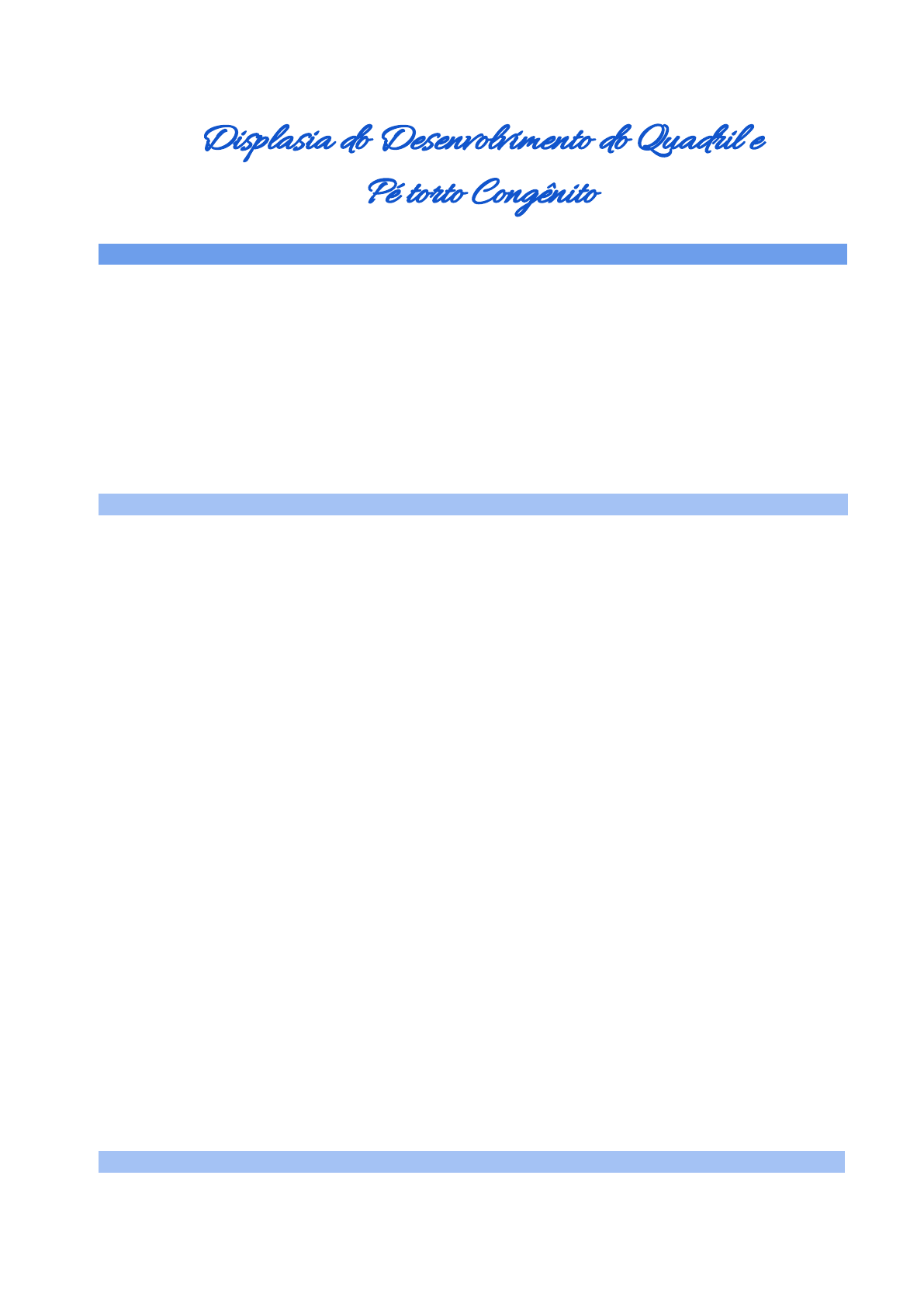 Rayssa Garcia - MED XXXVIII Displasia do Desenvolvimento do Quadril e Pé torto Congênito Pé Torto Congênito (PTC) . O Pé Torto Congênito (PTC) é uma malformação do aparelho locomotor presente no nascimento, em que há deformidades caracterizadas por mau alinhamento complexo do pé envolvendo partes moles e ósseas, podendo ocorrer unilateral ou bilateralmente.) É a deformidade ortopédica congênita mais comum, caracterizada por retropé equino e varo, antepé adulto e cavo; pode estar associado a outras deformidades musculoesqueléticas, como metatarso varo adulto, displasia de desenvolvimento do quadril, bandas de constrição, sindactilia, ausência de dedos e dedos extranumerários. Os principais tipos de PTC encontrados são o equinovaro, o metatarso varo ou adulto, o calcâneo valgo e talovertical. Em virtude da maior frequência com relação aos outros tipos é prática comum denominar o pé torto congênito equinovaro simplesmente de pé torto congênito. Os outros tipos são designados segundo as deformidades apresentadas. Fisiopatologia . Há algumas teorias para explicar a patogênese do PTC idiopático : ● Parada do desenvolvimento normal no estágio embrionário. ● Falha no desenvolvimento do molde (anlage) cartilaginoso tarsal. ● Defeitos na sinalização inadequada de genes quanto ao posicionamento dos membros. ● Gestação com líquido amniótico diminuído ou em cavidade uterina diminuída. ● Alterações com relação à origem neural O PTC tende a piorar e tornar-se mais rígido logo após o nascimento. A razão para isso pode ser a rápida síntese de colágeno nos tendões e ligamentos durante as primeiras semanas de vida. A síntese do colágeno diminui gradualmente até os 5 ou 6 anos de vida. Possivelmente, a fibrose (formação de tecido cicatricial intensa e pós-operatória) em bebês se relaciona à alta síntese de colágeno nessa fase. Por isso, recomenda-se que não seja feita cirurgia antes de 6 a 12 meses de idade. Ponseti demonstrou aumento de tecido fibroso nos músculos, fáscia, ligamento e bainhas tendíneas dos aspectos posteriores e mediais. Assim, o autor especulou que a retração geneticamente induzida das unidades musculotendíneas e partes moles na perna, relacionadas ao aumento na síntese de colágeno, pode ser fator importante na causa do pé torto congênito e suas recidivas. Ionasescu mostrou que existe um controle neurogênico na síntese de proteínas ribossômicas do músculo que pode ser o fator primário e que a fibrose tendínea pode ser o fator secundário. Com base nos conhecimentos atuais da patogênese do PTC e na biologia do tecido conectivo, a deformidade parece ser induzida por disfunção no território abrangido pelo nervo tibial abaixo do joelho, com diminuição da velocidade de crescimento das estruturas inervadas por ele. Ocorre aumento de fibrose no tendão calcâneo, tendão tibial posterior e estruturas ligamentares tarsais posteriores e mediais, levando a equino, retropé em varo, desvio medial do navicular e adução do pé. A deformidade do PTC é oriunda da mudança da conformação óssea, do mau alinhamento dos ossos e da retração das partes moles do pé. O principal componente da deformidade do PTC é a luxação medial do complexo entre navicular, calcâneo e cubóide, em relação ao tálus. O osso cuja deformidade se destaca mais é o tálus, sendo que seu colo é encurtado e sua superfície medial é diminuída. Além disso, ocorre uma diminuição do ângulo entre o eixo longo da cabeça-colo com o eixo longo do corpo do tálus para 115-135º, sendo que o ângulo normal é de 150-160º. Classificação . 1 Rayssa Garcia - MED XXXVIII Escala de Piriani A escala de Piriani é um método de quantificação clínica de deformidade presente em PTC não operado antes dos 2 anos de idade. Consiste em 6 sinais clínicos, graduados em 0 (normal), 0,5 (moderadamente anormal) ou 1 (gravemente anormal): ● Escala do mediopé – 3 quesitos graduando deformidade de 0 a 3: ○ Borda lateral do pé ○ Prega medial. ○ Cobertura do tálus. ● Escala do retropé – 3 quesitos graduando deformidade de 0 a 3: ○ Prega posterior. ○ Redutibilidade do equino. ○ Palpação do calcâneo. Todo paciente com PTC deve ser avaliado semanalmente para escala de Piriani, construindo-se um gráfico com valores Caraterização da deformidade . As deformidades fundamentais do PEV são: 1) Adução-supinação do antepé – o componente “adução” significa desvio medial do pé anterior, que ocorre principalmente na articulação mediotársica e em menor grau na articulação tarsometatarsiana. A supinação se traduz por uma elevação da cabeça do primeiro metatarsiano em relação à cabeça do quinto, de modo que a face plantar do antepé está voltada para o lado medial 2) Varo do calcâneo – esta deformidade ocorre ao nível da articulação subtalar com o calcâneo “girando” sob o talo, colocando-se em situação tal que sua face plantar está voltada para o lado medial. Como veremos mais tarde, este movimento está intimamente relacionado com a adução do antepé ao nível da articulação talonavicular, constituindo a articulação calcâneo-talonavicular. Ao conjunto de varo do calcâneo e adução-supinação do antepé denominamos “inversão” do pé. 3) Eqüinismo – essa deformidade, na qual o pé está em flexão plantar fixa, ocorre principalmente ao nível da articulação tibiotársica, havendo também um componente ao nível da articulação subtalar na qual há um 2 Rayssa Garcia - MED XXXVIII eqüinismo do talo em relação ao calcâneo. Como veremos mais tarde, os eixos do calcâneo e do talo, no RX normal de perfil formam um ângulo de 45º, enquanto que no PEV se tornam paralelos. 4) Cavismo – freqüentemente há uma flexão plantar do antepé em relação ao retropé e portanto ao nível da articulação mediotársica (talonavicular e calcâneo-cubóide), determina