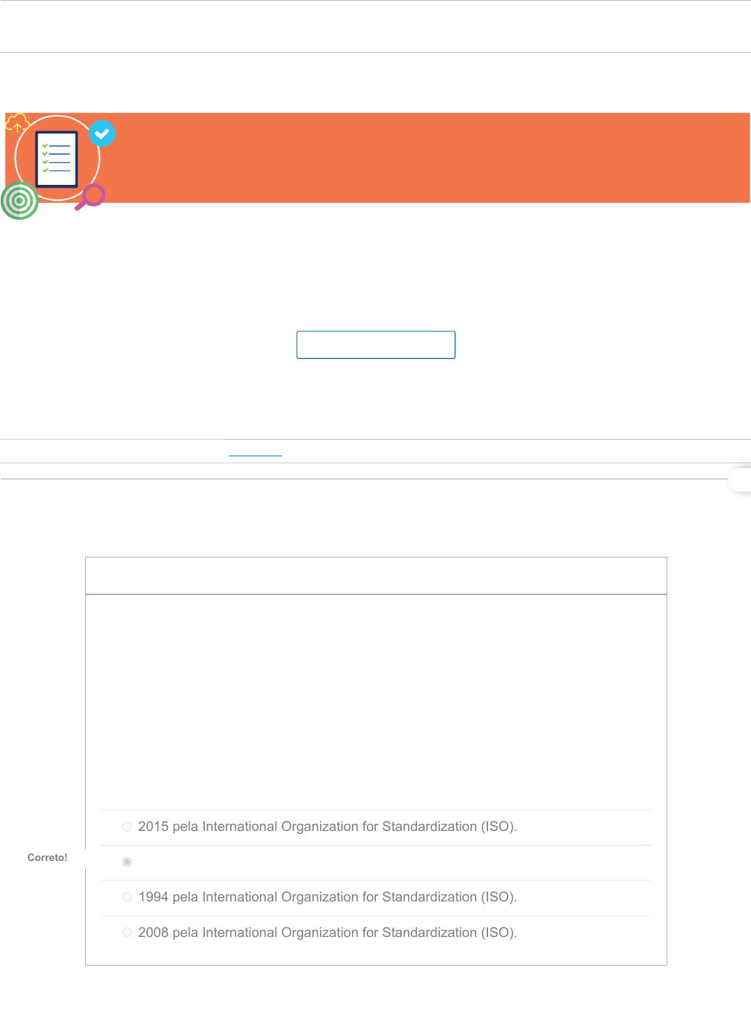 7.13 - AVALIAÇÃO 5 - ISO 9001:2015 - SISTEMAS DE GESTÃO DA QUALIDADE Entrega Sem prazo Pontos 100 Perguntas 20 Limite de tempo Nenhum Tentativas permitidas Sem limite Instruções Histórico de tentativas Tentativa Tempo Pontuação MAIS RECENTE Tentativa 1 1.448 minutos 85 de 100 Pontuação desta tentativa: 85 de 100 Enviado 6 ago em 19:23 Esta tentativa levou 1.448 minutos. De acordo com os estudos do módulo 4 sobre formação de auditores, responda as perguntas para passar para o módulo 5. As perguntas foram extraídas dos textos, então para responder acessem e leiam as páginas e assistam os videos dos especialistas em sistema de gestão. Fazer o teste novamente 5 / 5 ptsPergunta 1 Criada pela International Organization for Standardization (ISO), a ISO 9001 é uma série de normas sobre gestão da qualidade que pode ser aplicada a empresas, produtos e serviços, contribuindo para a revolução de seus sistemas de gestão da qualidade, auxiliando empresas a aumentar sua eciência e a satisfação do cliente. Em qual ano foi lançada a serie ISO 9000. 2015 pela International Organization for Standardization (ISO). 1987 pela International Organization for Standardization (ISO).Correto!Correto! 1994 pela International Organization for Standardization (ISO). 2008 pela International Organization for Standardization (ISO). https://canvas.instructure.com/courses/2939516/quizzes/8652055/history?version=1 https://canvas.instructure.com/courses/2939516/quizzes/8652055/take?user_id=108646882 5 / 5 ptsPergunta 2 A ISO 9001 é uma norma que estabelece requisitos para a implantação de sistema da qualidade com objetivo de estabelecer melhorias em processos, produtos e serviços. Qual é o titulo dessa norma? Sistemas de gestão de produtos e serviços - Diretrizes para certificação Sistemas de gestão da qualidade e monitoramento - Requisitos para implantação Sistemas de gestão da qualidade - RequisitosCorreto!Correto! Sistemas da qualidade industrial - Requisitos com orientação para uso 0 / 5 ptsPergunta 3 De acordo com a ISO 9001, A organização deve determinar questões externas e internas que sejam pertinentes para o seu propósito e para seu direcionamento estratégico e que afetem sua capacidade de alcançar os resultados pretendidos de seu sistema de gestão da qualidade. Nesse contexto, a organização deve: Somente questões internas da empresa relacionadas a alta direção, excluindo os demais colaboradores, pois eles não fazem parte do processo. As partes interessadas que não sejam pertinentes para o sistema de gestão da qualidade. Monitorar e analisar criticamente informação sobre essas questões externas e internas. Resposta corretaResposta correta As partes interessadas que sejam pertinentes para o sistema de gestão da qualidade, exceto processos, fornecedores e clientes. Você respondeuVocê respondeu 5 / 5 ptsPergunta 4 Qual é a finalidade do ciclo PDCA no processo de implantação da ISO 9001? Desenvolver uma sistemática para manter os problemas pontuais de qualidade parados até que tenha uma reclamação do cliente. Habilita uma visão estrategia para a alta direção os lucros da empresa, sem preocupação com a qualidade. Direciona apenas para a compra e entrega de suprimentos e produtos com qualidade, quando exigido aos fabricantes e fornecedores. Habilita uma organização a assegurar que seus processos tenham recursos suficientes e sejam gerenciados adequadamente, e que as oportunidades para melhoria sejam identificadas e as ações sejam tomadas. Correto!Correto! 5 / 5 ptsPergunta 5 A organização deve determinar os limites e a aplicabilidade do sistema de gestão da qualidade para estabelecer o seu escopo.O escopo do sistema de gestão da qualidade da organização deve estar disponível e ser mantido como informação documentada. O que deve ser declarado no escopo? Deve declarar os tipos de produtos e serviços cobertos e prover justificativa para qualquer requisito da ISO 9001 que a organização determinar que não seja aplicável ao escopo do seu sistema de gestão da qualidade. Correto!Correto! Declarar e evidenciar o comprometimento da Alta Direção, exceto supervisores de produção e técnicos da qualidade. Declarar quem são os clientes e fornecedores de matéria prima e insumos aos processos produtivos. Declarar quem são as Lideranças e alta direção que fazem parte do sistema de gestão da qualidade. 5 / 5 ptsPergunta 6 A organização deve estabelecer, implementar, manter e melhorar continuamente um sistema de gestão da qualidade, incluindo os processos necessários e suas interações, de acordo com os requisitos da ISO 9001. Marque verdadeiro ou falso para as afirmativas? Determinar as entradas requeridas e as saídas esperadas desses processos. VerdadeiroCorreto!Correto! O mapeamento e interação dos processos não são necessários para o sistema de gestão da qualidade FalsoCorreto!Correto! Determinar a sequência e a interação desses processos VerdadeiroCorreto!Correto! melhorar os processos e o sistema de gestão da qualidade VerdadeiroCorreto!Correto! Abordar os riscos e oportunidades conforme determinados de acordo com os requisitos da ISO 9001 VerdadeiroCorreto!Correto! Monitorar e mapear somente os processos críticos determinados pela alta direção FalsoCorreto!Correto! 5 / 5 ptsPergunta 7 A Norma ISO 9001 tem diversos conceitos que devem ser de conhecimento dos auditores internos e externos com a compreensão e interpretação da norma e seus requisitos. Faça a relação dos conceitos e significados descrito na norma. Organização Pessoa ou grupo de pessoasCorreto!Correto! Parte Interessada Pessoa ou organização que pCorreto!Correto! Requisito Necessidade ou expectativa qCorreto!Correto! Sistema de Gestão Conjunto de elementos inter-Correto!Correto! 5 / 5 ptsPergunta 8 A Alta Direção deve demonstrar liderança e comprometimento com relação ao sistema de gestão da qualidade. Quais são as ações que alta