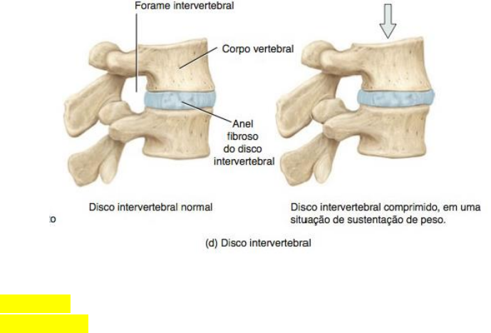 COLUNA VERTEBRAL - Dois quintos da altura total do corpo, sendo formada por uma série de ossos chamados de vértebras. - Circunda e protege o Sistema Nervoso. - Haste flexível e resistente com elementos que podem curvar se mover para frente, para trás, para os lados, ... Formação: - 26 vértebras: ▪ 7 cervicais, 12 torácicas, 5 lombares, 1 sacro (5 sacrais fundidas) e 1 cóccix (4 coccígeas fundidas). CURVATURAS NORMAIS DA COLUNA VERTEBRAL: - São 4 pequenas curvaturas: lombar e cervical (convexas) e torácica e sacral (côncavas). - Aumentam o equilíbrio e ajudam a manter a posição ortostática, proteger, ... Curvaturas primárias: - Torácica e sacral. - Formadas durante o desenvolvimento embrionário, a partir do terceiro mês de desenvolvimento. Curvaturas secundárias: - Cervical e lombar. - Formadas após o nascimento. DISCOS INTERVERTEBRAIS: - Vão da C2 ao sacro, absorvendo impactos e permitindo movimentos. - Anel fibroso: Anel fibroso externo, de fibrocartilagem. - Núcleo pulposo: Substância mucoide interna. ▪ Converte-se em fibrocartilagem com o tempo, devido à desidratação. ▪ Perde água no decorrer do dia devido à compressão, enquanto em seu fim, com a menor pressão sobre a coluna, o núcleo pulposo se reidrata. - São avasculares e recebem vasos sanguíneos de corpos vertebrais. PARTES DA VÉRTEBRA COMUM: - Corpo, arco vertebral e diversos processos. Corpo vertebral: - Maior massa volumosa anterior do osso, criando o eixo colunar e de sustentação do esqueleto. - Discos intervertebrais cartilágenos: Entre corpos vertebrais adjacentes. - Faces superior e inferior: Enrugadas para impedir a perda de água pelos discos intervertebrais. Arco vertebral: - Posteriormente a partir do corpo vertebral, envolvendo a medula espinal. - Projeções ósseas que servem para a fixação de músculos. - Pedículos: Base do arco vertebral, unidos ao corpo vertebral e se projetam posteriormente. - Lâminas: Parte posterior do arco vertebral, unidas aos pedículos. - Forame vertebral: Entre o arco vertebral e o corpo vertebral, contendo ▪ Contém medula espinal e meninges. - Canal vertebral: Formado pelos forames vertebrais de todas as vertebras.. - Incisuras vertebrais: endentações superior e inferior dos pedículos. - Forame intervertebral: Passagem de 1 nervo espinal. Processos: - São 7, formados a partir do arco vertebral. - Processos transversos: Na junção da lâmina com o pedículo. Estendidos posterolateralmente de cada lado. - Processo espinhoso: Posteriormente a partir das lâminas. - Processos articulares superiores: São 2 e se articulam com os processos articulares inferiores da vértebra. ▪ Próximos à junção do pedículo com a lâmina. ▪ Superfícies articulares cobertas com cartilagem hialina. REGIÕES DA COLUNA VERTEBRAL Alterações com a idade: - Há redução da massa óssea e de sua densidade. - Faces articulares perdem sua cartilagem hialina. - O canal vertebral se estreita com a formação dos osteófitos - projeções ósseas em torno dos discos intervertebrais. Vértebras cervicais: - Mais variáveis das vertebras. - Coluna delicada de ossos que varia em amplitude e mobilidade. - Possuem corpos vertebrais menores que os das vertebras torácicas, mas arcos vertebrais maiores. Características superficiais: - Contato entre os processos articulares superior e inferior no plano transverso. 1. Forames vertebrais: Maiores da coluna vertebral, para alojar a intumescência cervical. 2. Forame transversário: Existente nos 2 processos transversos cervicais, com a artéria vertebral, sua veia acompanhante e as fibras nervosas. a. Processos espinhos de C2 a C6 são bífidos (pontas com pequenas projeções). 3. Atlas (C1): Anel ósseo com arcos anterior e posterior e grandes massas laterais. Sem corpo vertebral e nem processo espinhoso. a. Faces articulares superiores côncavas e articuladas com os côndilos occipitais do occipital. b. Forames articulares inferiores, articulados com os superiores da segunda vértebra cervical. 4. Áxis (C II): Sem corpo vertebral, possuindo o dente do áxis no lugar (projeta-se superiormente pela parte anterior do forame vertebral do Atlas para formar um pivô de apoio a ele e à cabeça - rotação). 5. C III a C VI: Padrão estrutural da vértebra cervical comum. 6. Vértebra proeminente (C VII): Possui um processo espinhoso grande e não bífido. Vértebras torácicas: - Maiores e mais resistentes que as cervicais. Aumentam de tamanho quanto mais caudalmente. - Processos espinhosos de T 1 a T X: Longos e planos lateralmente. O superior se sobrepõe ao da vertebra inferior. - Processos espinhosos de T XI e T XII: Menores, mais largos e direcionados mais posteriormente. - Fóveas costais: Faces articulares para as costelas, situadas lateralmente. ▪ Cada uma articulada a uma vértebra. ▪ De T I a T VIII existem fóveas costais superiores e inferiores entre as vértebras que se articulam com os dos corpos vertebrais adjacentes. ▪ T IX possui uma fóvea superior de cada lado do corpo vertebral. ▪ TX a T XII possuem fóveas laterais para as costelas X a XII. - Superfície articular superior orientada posteriormente e a inferior, anteriormente. ▪ Inclinação para frente e para trás. Vértebras lombares: - Maiores e mais resistentes da coluna vertebral decorrente do aumento do peso corporal suportado em direção à extremidade inferior. - Tamanho grande pela ausência de forames transversários e de fóveas articulares costais. Características superficiais: - Projeções curtas e espessas. - Processos articulares superiores: Direcionados medialmente. - Processos articulares inferiores: Direcionados lateralmente. ▪ Os processos articulares têm contato no plano sagital (aquele paralelo ao medial). ▪ Inclinações anterior e posterior. - Processos transversos: Projeções laterais achatadas mais altas e largas. - Processos espinhosos: Forma quadrilátera, espessos e largos. Projetados horizontalment