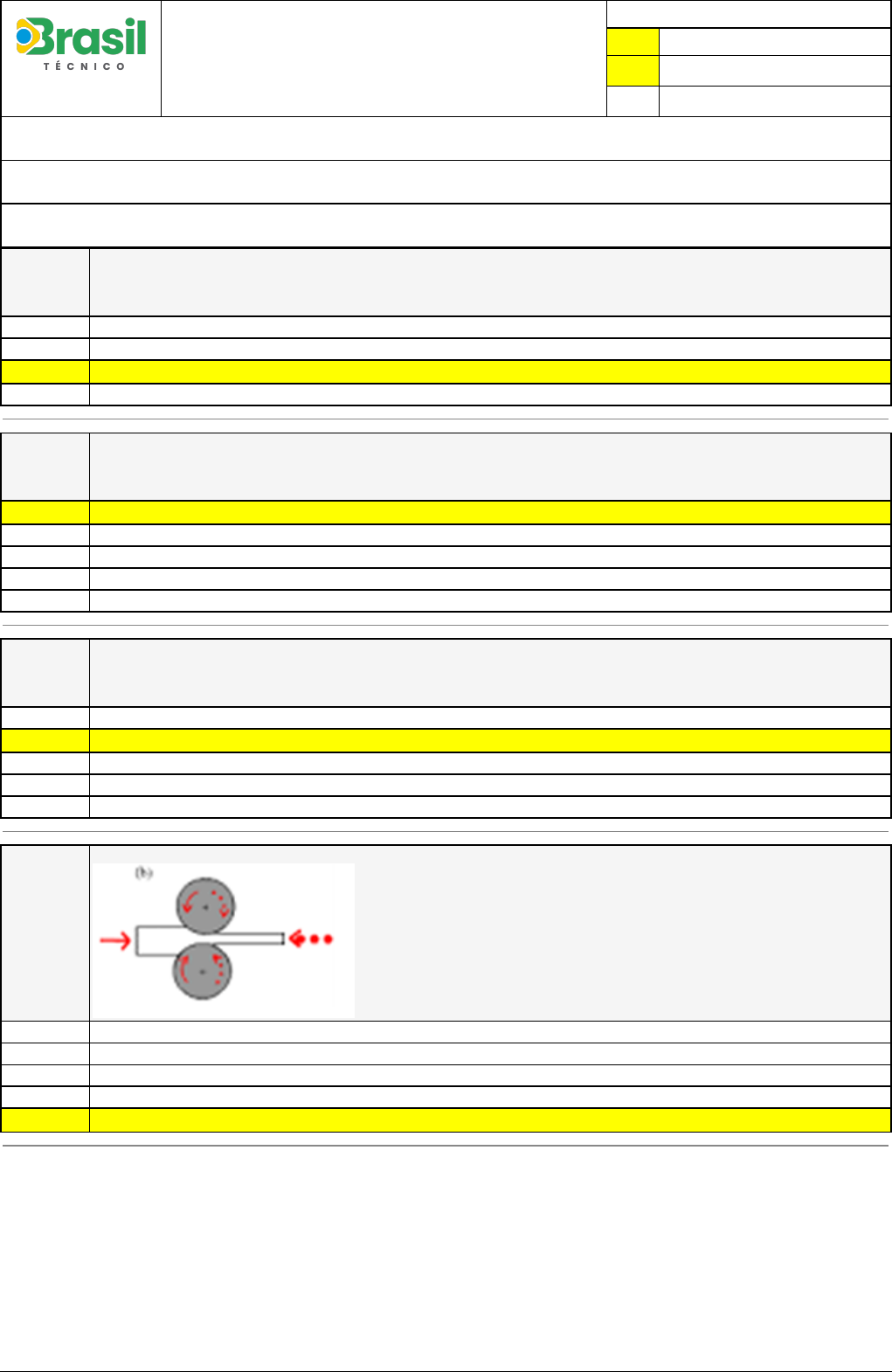 Pincel Atômico - 13/06/2023 12:03:13 1/5 PATRICK NEVES DE CARVALHO Avaliação Online (SALA EAD) Atividade finalizada em 30/05/2023 10:32:09 (995509 / 2) LEGENDA Resposta correta na questão # Resposta correta - Questão Anulada X Resposta selecionada pelo Aluno Disciplina: PROCESSOS DE TRANSFORMAÇÃO MECÂNICA [534363] - Avaliação com 20 questões, com o peso total de 51,00 pontos [capítulos - Todos] Turma: Curso Técnico: Mecânica - Grupo: BT PRES JAN/23 - BT PRES MEC V1 [77082] Aluno(a): 91417968 - PATRICK NEVES DE CARVALHO - Respondeu 19 questões corretas, obtendo um total de 48,45 pontos como nota [350211_9925 ] Questão 001 No processo de forja manual, a força de impacto é proveniente de que? Da máquina Do forjador e da máquina X Do martelo e do forjador Do martelo e da máquina [350211_2899 ] Questão 002 Entende-se por lingote: X São blocos fundidos que serão destinados a outras operações de fabricação, como laminação e forjamento; Todo o processo de transformação do aço líquido em placas de aço através de um distribuidor; Os distribuidores são responsáveis por fabricar os lingotes; Entende-se por lingote, uma classificação para lingotamento convencional; Podemos afirmar que os lingotes são equipamentos auxiliares para executar o lingotamento do aço; [350211_1520 11] Questão 003 Processo de conformação mecânica efetuadas com esforço de compressão sobre um material dúctil, de tal modo que ele tende a assumir o contorno ou perfil da ferramenta de trabalho. Estamos falando de qual processo de transformação mecânica. Laminação X Forjamento Lingotamento Extrusão Trefilação [350211_1519 83] Questão 004 A imagem abaixo se refere a qual tipo de laminador? Laminador Duo Laminador Sendzimir Laminador trio Laminador Quádruo X Laminador Duo Reversível Pincel Atômico - 13/06/2023 12:03:13 2/5 [350211_1519 72] Questão 005 A imagem abaixo trata de qual tipo de lingotamento? Lingotamento convencional direto Lingotamento continuo direto Lingotamento convencional indireto X Lingotamento continuo Lingotamento continuo indireto [350211_1520 12] Questão 006 A imagem abaixo se refere a qual tipo de forjamento? Forjamento em Matriz Fechada X Forjamento em Matriz Aberta Forjamento em matriz semi-aberto Forjamento de Encalcamento Forjamento hidrostático [350211_9929 ] Questão 007 "É um elemento refratário colocado no molde para definir uma cavidade ou espaço vazio no fundido final.". Nesse caso, estamos falando do? Estampa Retíica X Macho Cura [350211_1519 93] Questão 008 Por que a temperatura do material aumenta durante a operação de trefilação? Devido ao atrito com as roldanas X Devido ao atrito com a fieira Devido ao aquecimento no forno A temperatura não aumenta durante a trefilação Devido a falta de lubrificação Pincel Atômico - 13/06/2023 12:03:13 3/5 [350211_2914 ] Questão 009 Qual é o objetivo da deposição de cal sobre o arame de aço? X Utilizada como um meio de absorção e transporte do lubrificante durante a Trefilação a seco; Utilizada como elemento de manutenção de temperatura, uma vez que atua como isolante térmico; Utilizado para facilitar as reações químicas de ligas metálicas no arame; Proteger o arame de aço a possíveis ataques de corrosão apenas; Age como material de sacrifício, oxidando com a presença do oxigênio no lugar do arame de aço; [350211_1520 67] Questão 010 É um processo de fabricação onde um metal ou liga metálica, no estado líquido, é vazado em um molde com formato e medidas correspondentes aos da peça a ser produzida. X Fundição Lingotamento Laminação Forjamento Cavitação [350212_9916 ] Questão 011 Antes da laminação, existe um processo onde o metal é solidificado através de rolos. Qual o nome desse processo? X Lingotamento Contínuo Estampagem Dobra Rolagem de Aço Trefilação [350212_4038 ] Questão 012 A retirada dos canais de alimentação, massalotes e rebarbas que se formam durante a fundição é chamada de: X Rebarbação; Aparas; Desmontagem; Alinhamento de superfície; Limpeza do molde; [350212_1520 26] Questão 013 O material estampado pode ser dividido em região de acordo com a operação realizada. Com relação ao material estampado da imagem abaixo, qual o nome da região “b”? Região do fundo do copo Região da aba do copo X Região do dobramento da matriz Região do dobramento do punção Região lateral do copo Pincel Atômico - 13/06/2023 12:03:13 4/5 [350212_1519 85] Questão 014 A imagem abaixo se refere a qual tipo de laminador? Laminador Duo Laminador Duo Reversível Duo Laminador Quádruo Laminador trio X Laminador Sendzimir [350212_9920 ] Questão 015 Temos dois processos básicos de Extrusão, são eles? Extrusão a força e a óleo X Extrusão a quente e a frio Extrusão a Quente e em fusão Extrusão com e sem lubrificante [350212_2909 ] Questão 016 Qual é a redução máxima na espessura de uma chapa de aço oriunda do laminador de tiras a quente? X 1,5mm; 1,8mm; 2,0mm; 1,4mm; 1,1mm; [350213_1519 98] Questão 017 Com relação ao funcionamento da bobinadeira é correto afirmar: X E a região de calibração para controle dimensional E o cone de saída, tem a função de evitar danos no fio. E a região de trabalho, na qual faz redução do diâmetro do material E a região de calibração, na qual faz redução do diâmetro do material E o cone de entrada que tem a função de direcionar o fio corretamente [350213_4035 ] Questão 018 É sabido que o processo de forjamento: X Envolve a aplicação de uma tensão de compressão que excede a tensão de escoamento do metal; Consiste em modificar a seção transversal de um metal na forma de barra, lingote, placa, fio, tira, etc.; É mais comumente utilizado para a fabricação de peças maciças e ocas de metais não-ferrosos e ligas; Consiste na pré formatação e solidificação do aço produzido na aciaria por meio dos convertedores ou conversores com o objetivo de produzir ling